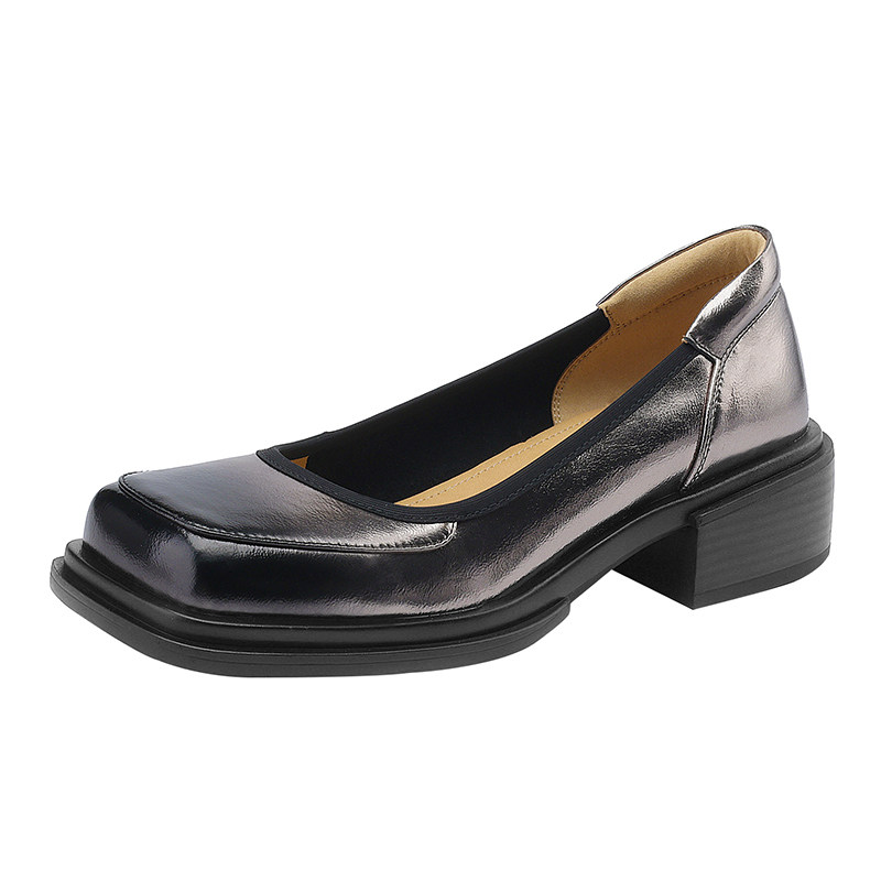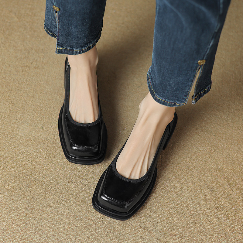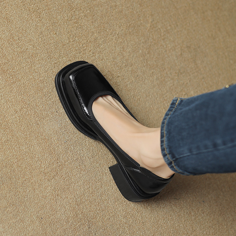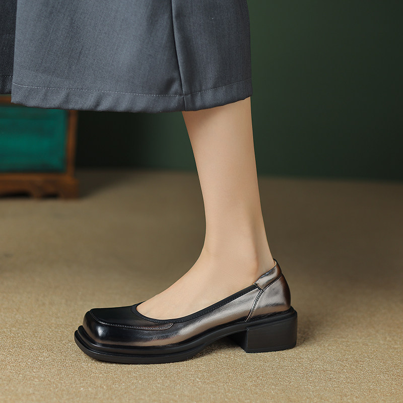 中跟方头复古小皮鞋女厚底粗跟浅口懒人单鞋真皮一字扣春秋女鞋子