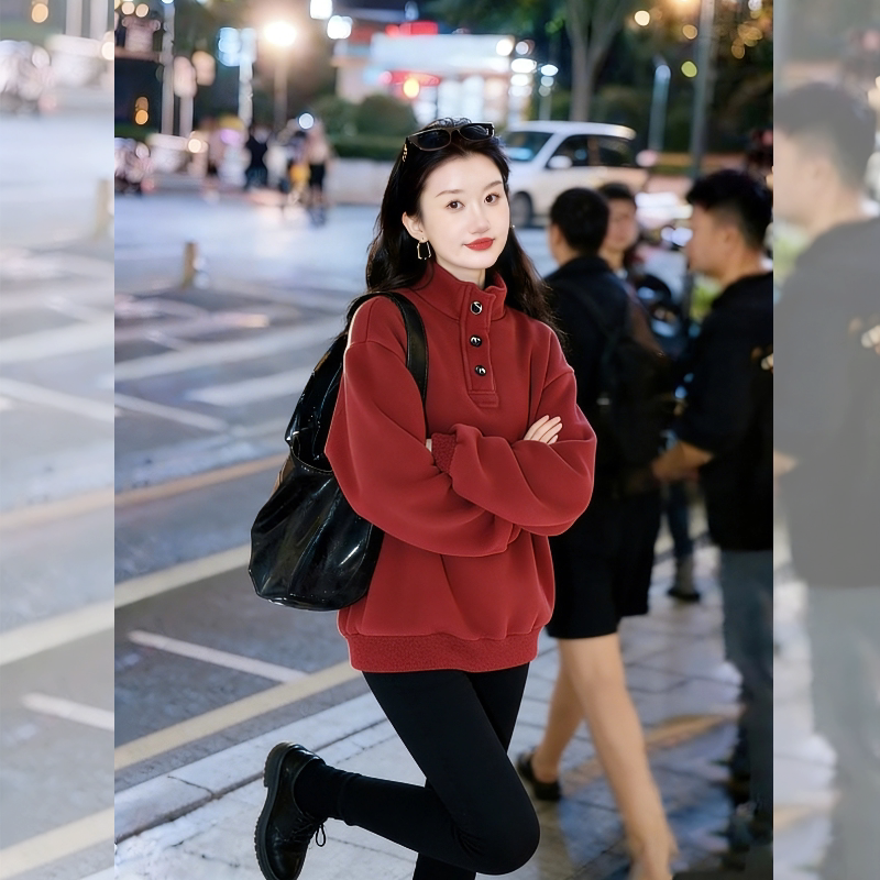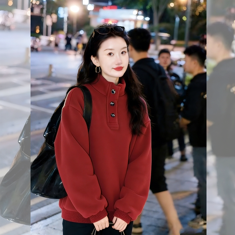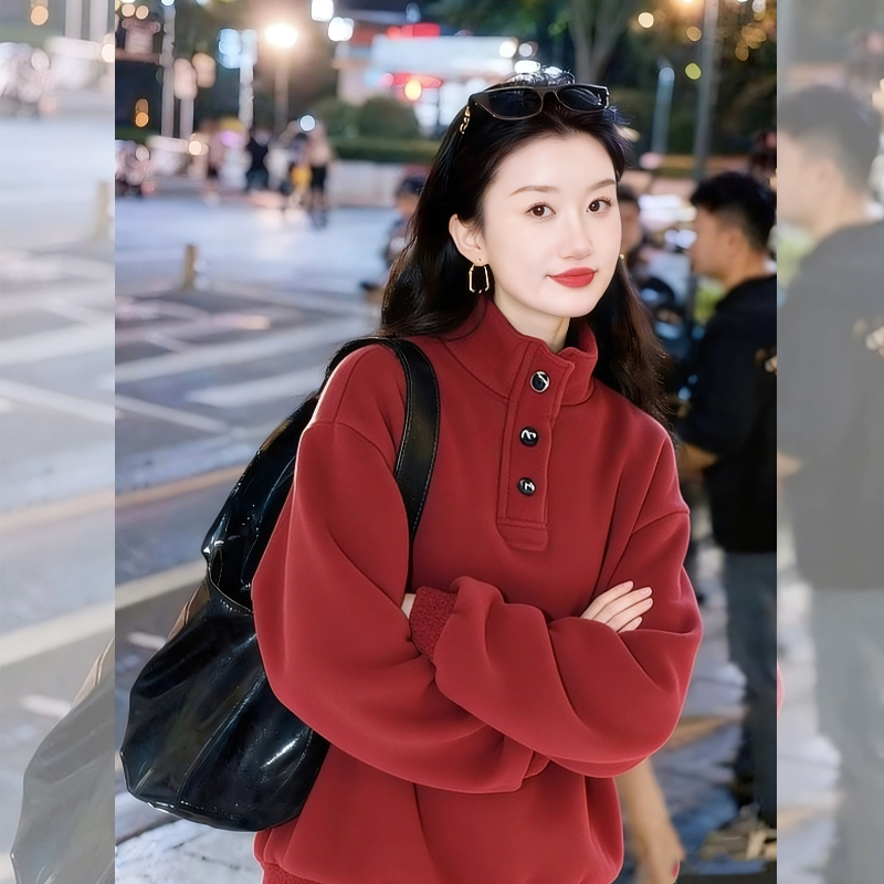 红色半高领卫衣女款2026冬新款加绒加厚韩系慵懒风高级感圣诞上衣