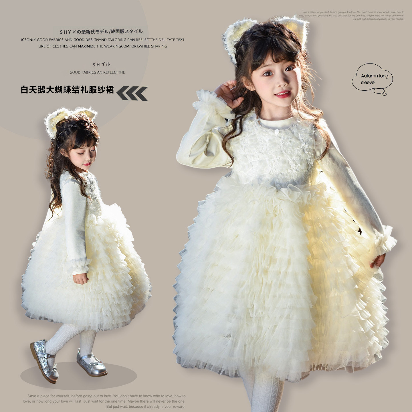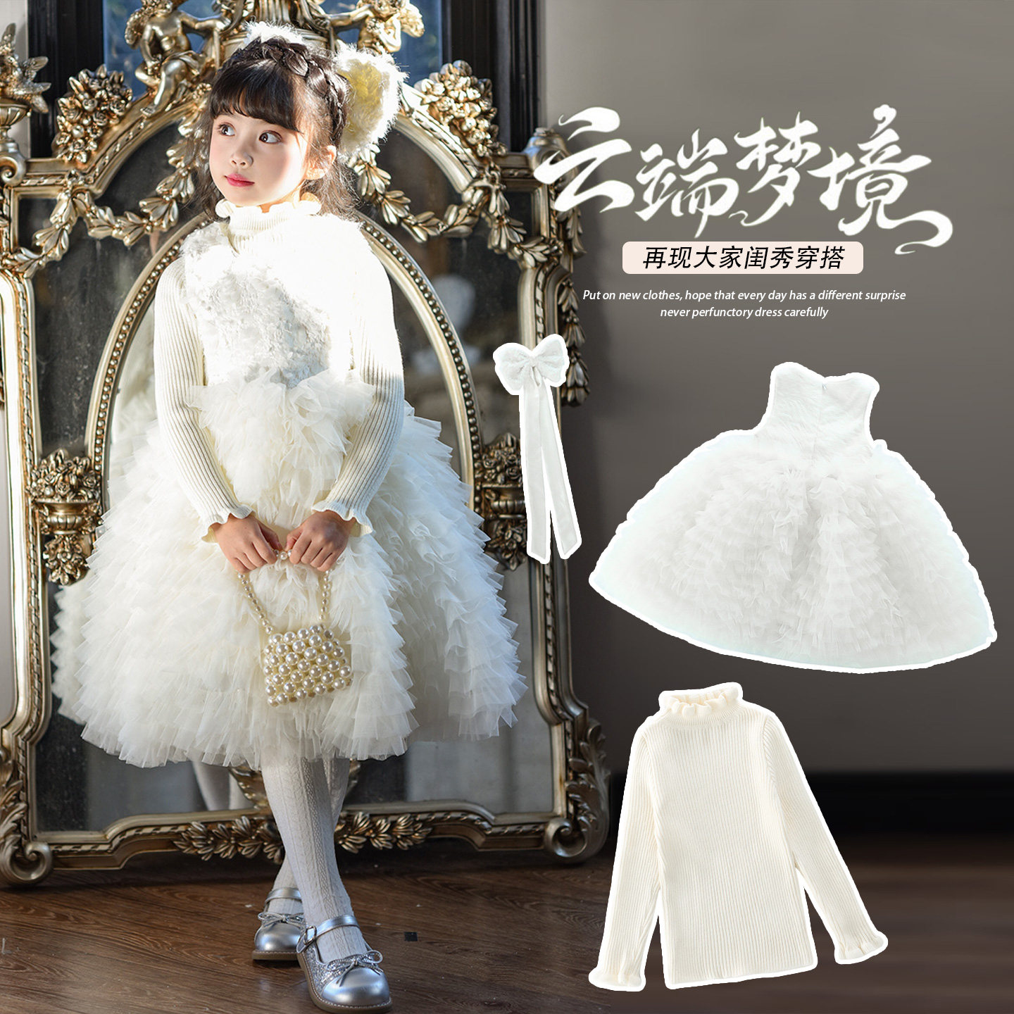 女童公主风网纱连衣裙套装春秋冬背心裙白天鹅生日礼服裙子拜年服