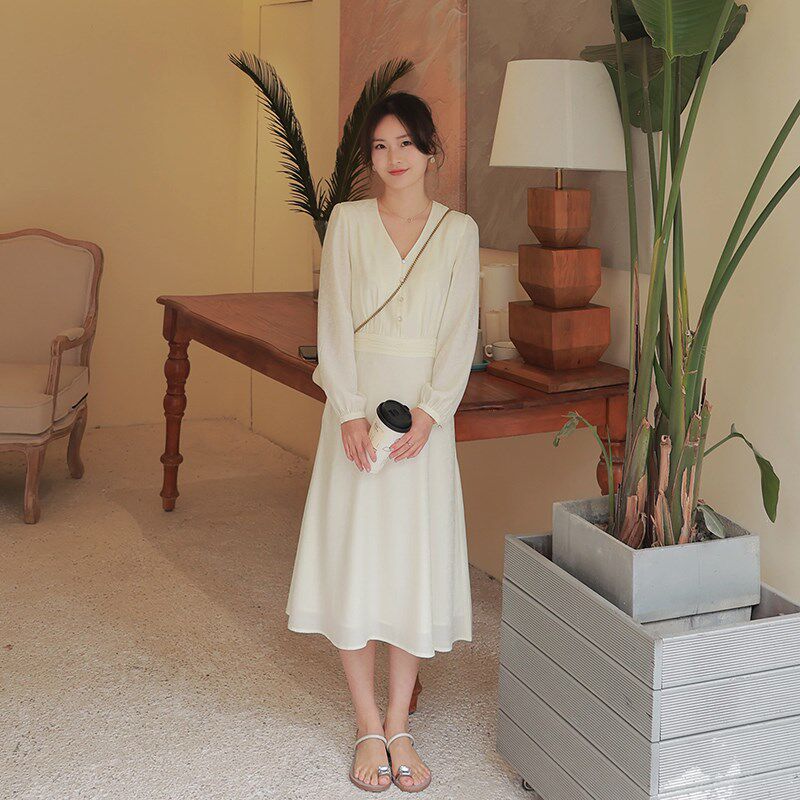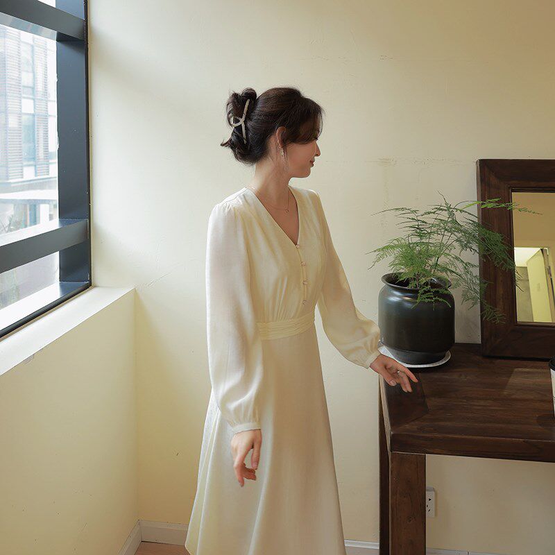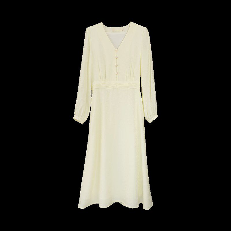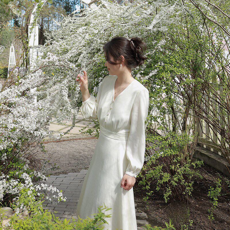 尔尔自制小个子春季V领连衣裙女温柔风设计感气质收腰A字长裙