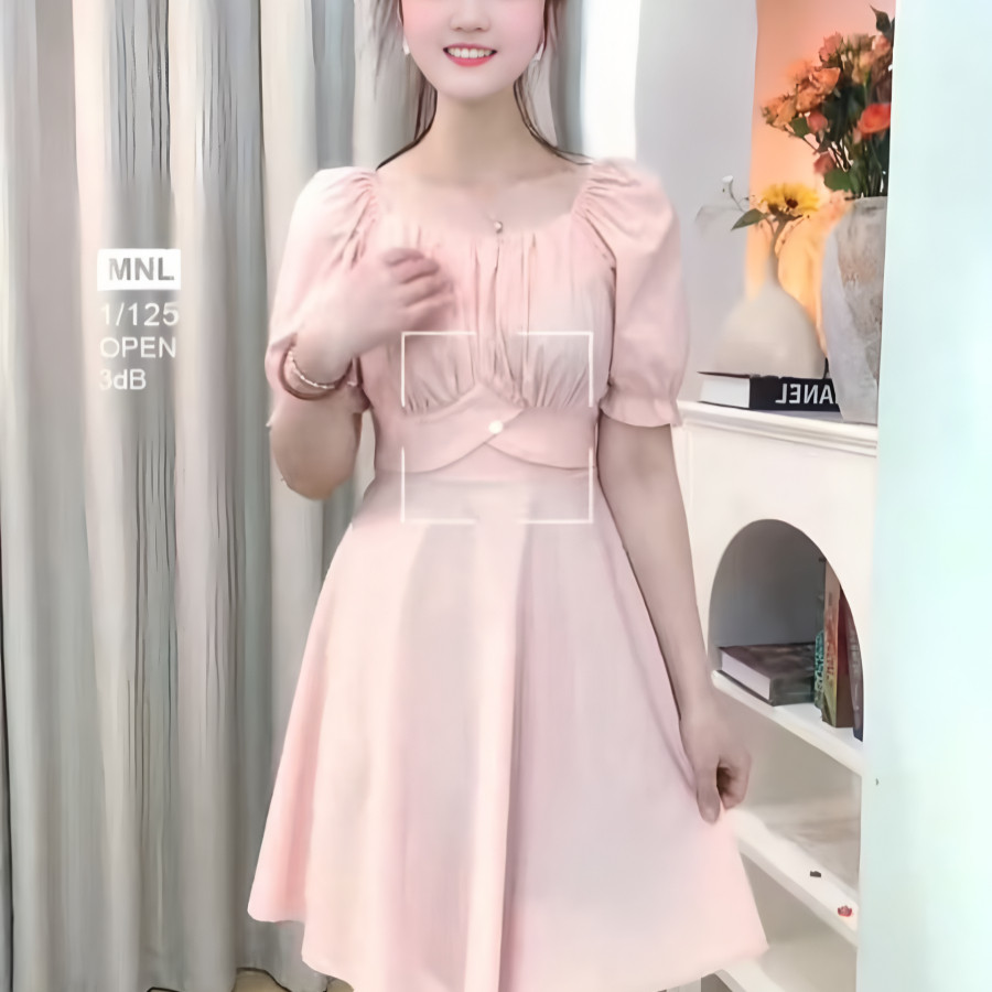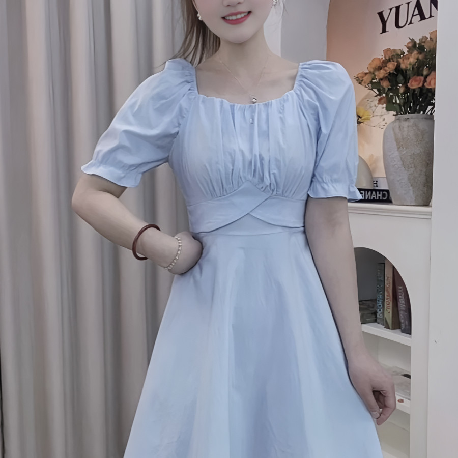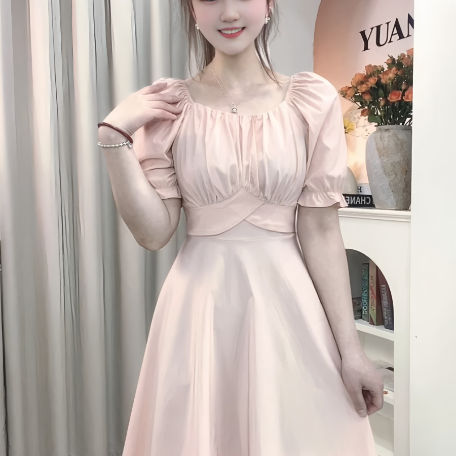 赫本风方领连衣裙女夏季收腰显瘦气质梨型身材小个子短袖a字裙子