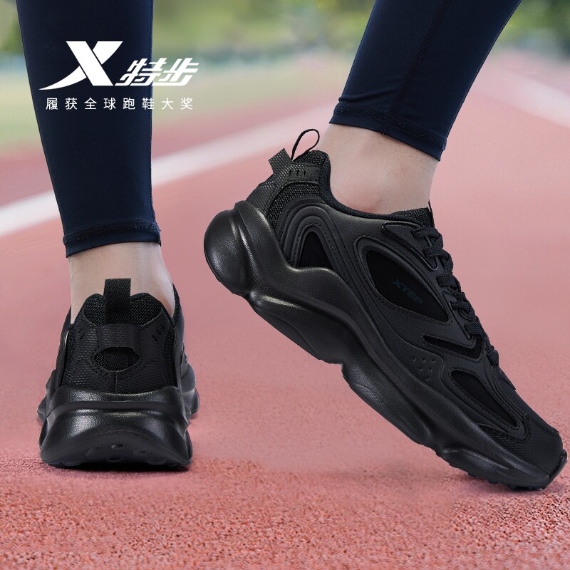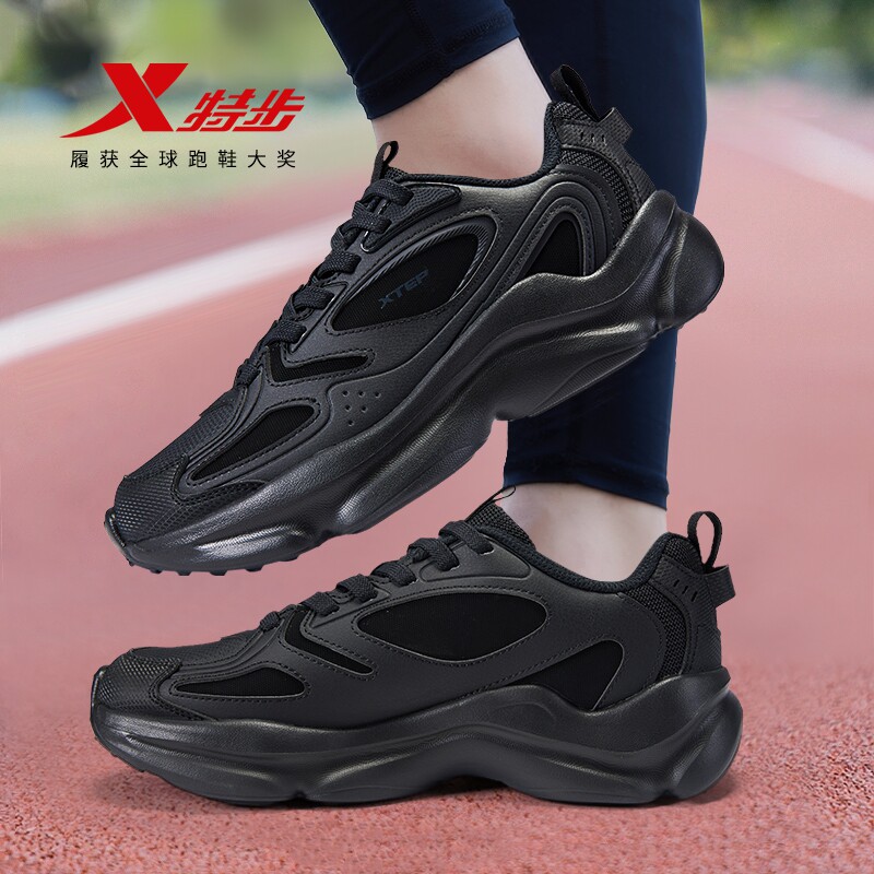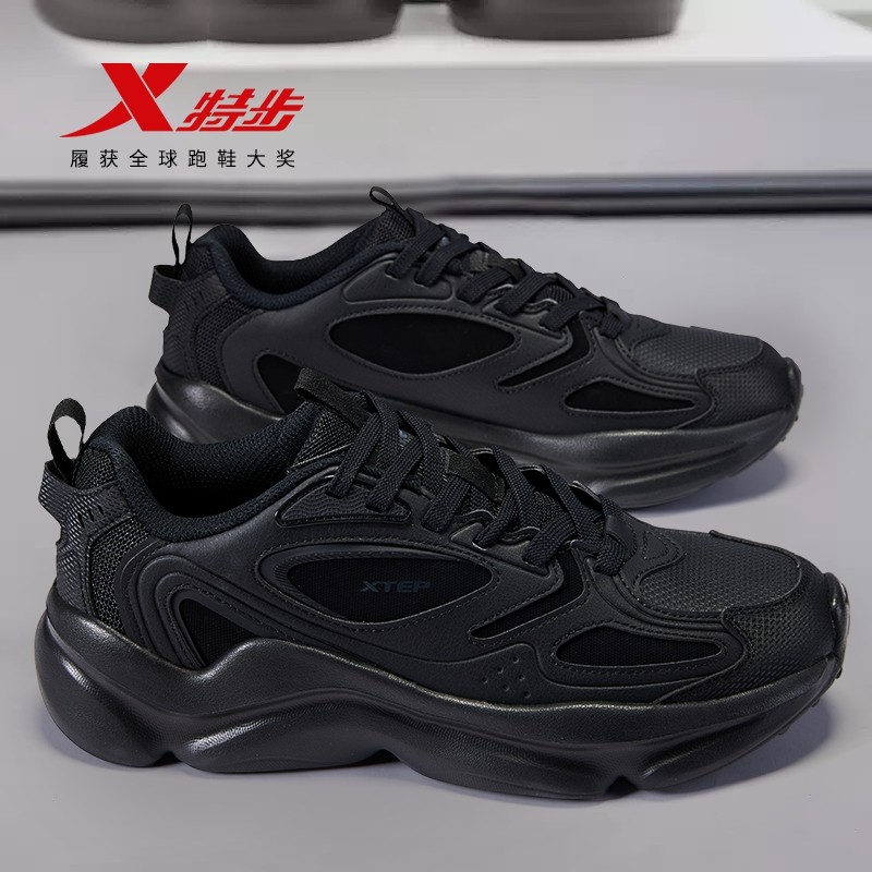 特步男鞋官方旗舰店正品黑色运动鞋皮面防水休闲老爹鞋跑步鞋减震