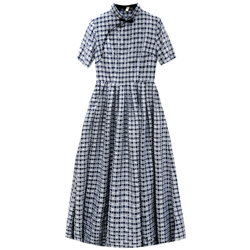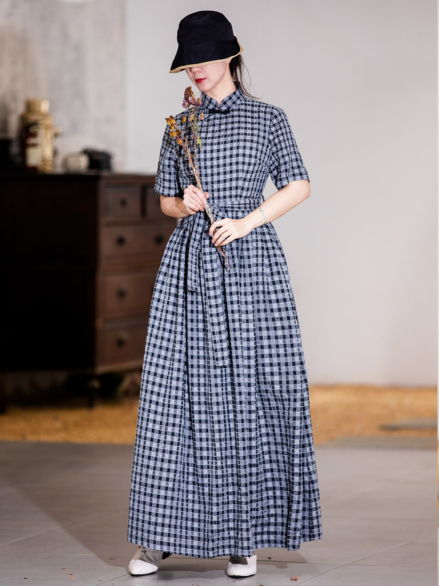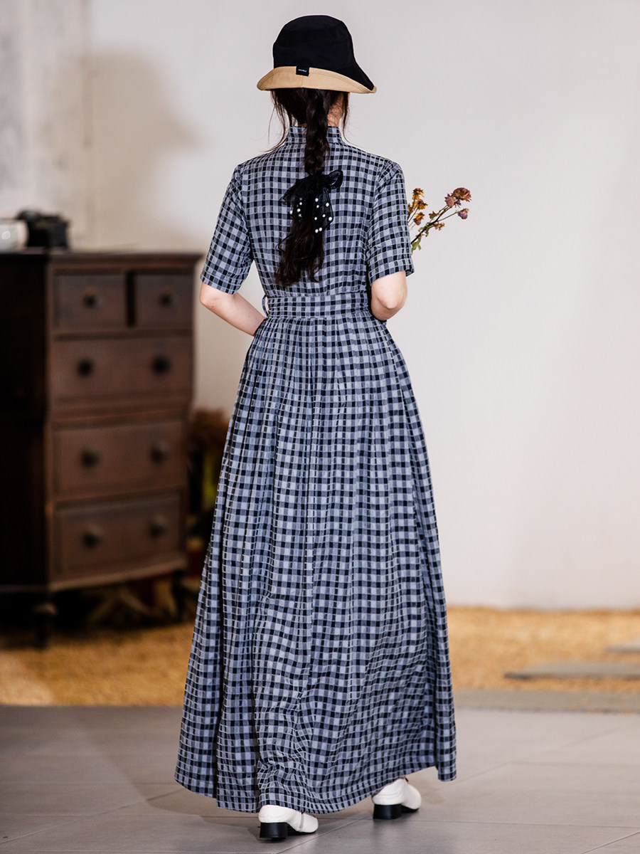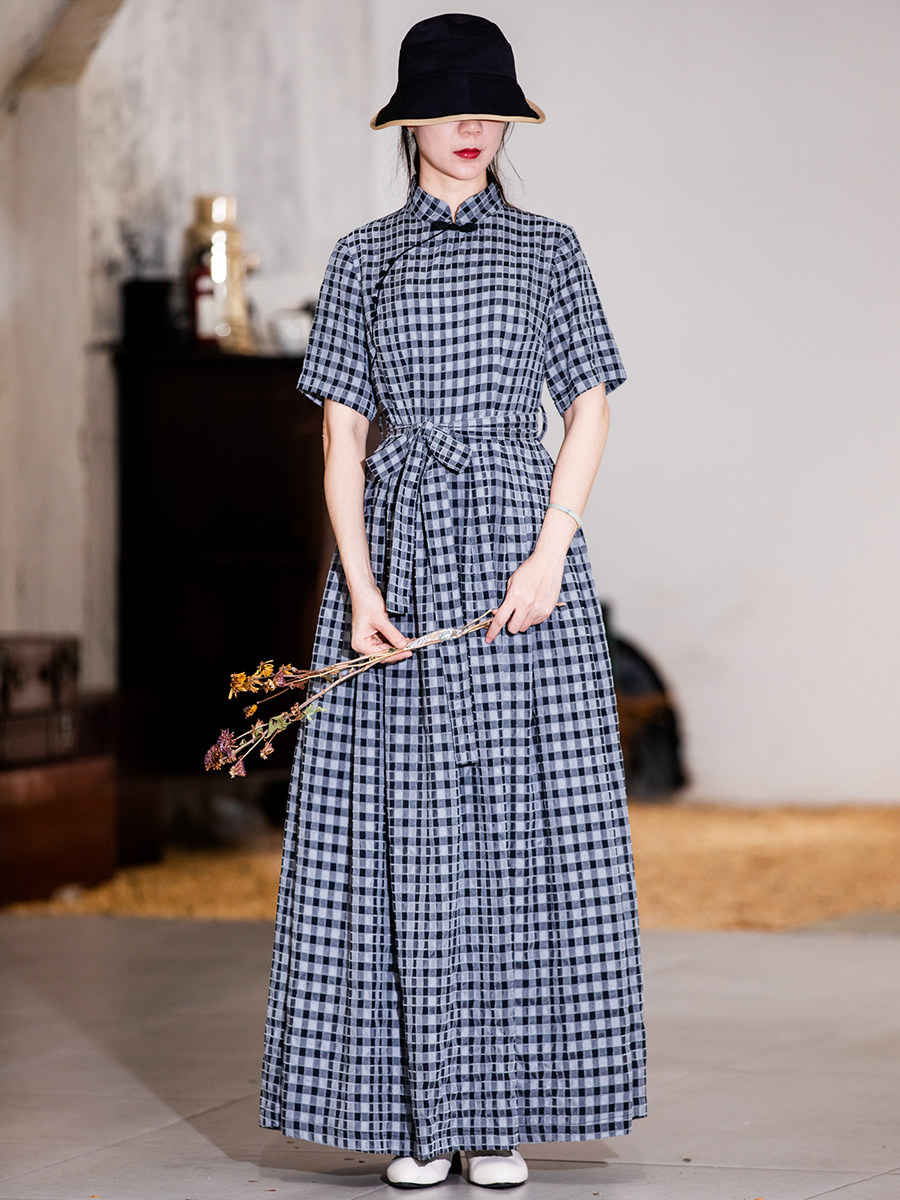 仙衣裾设计师黑灰格子连衣裙立领旗袍长裙修身大摆裙小个子女装夏