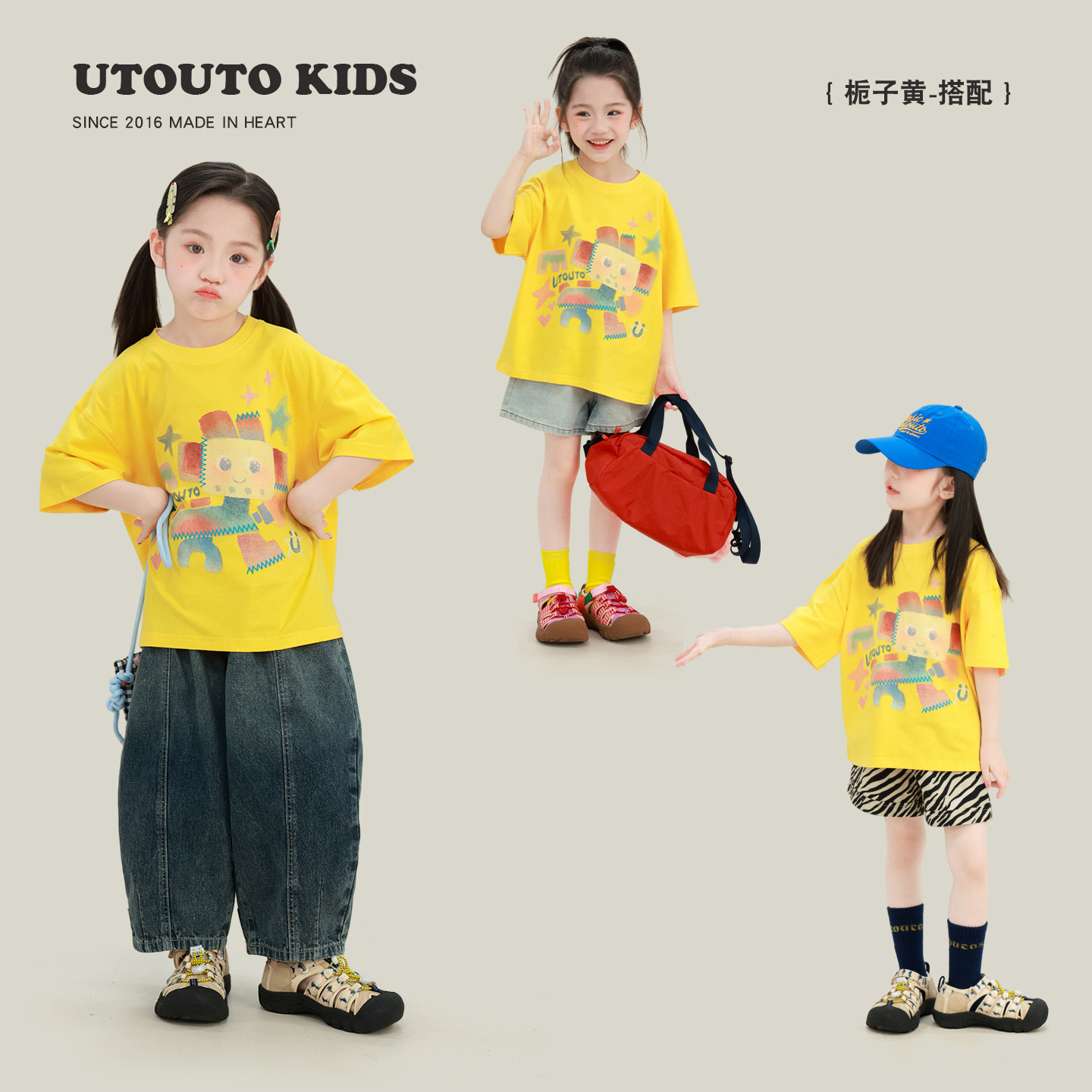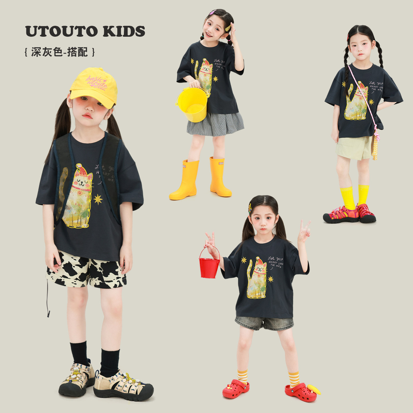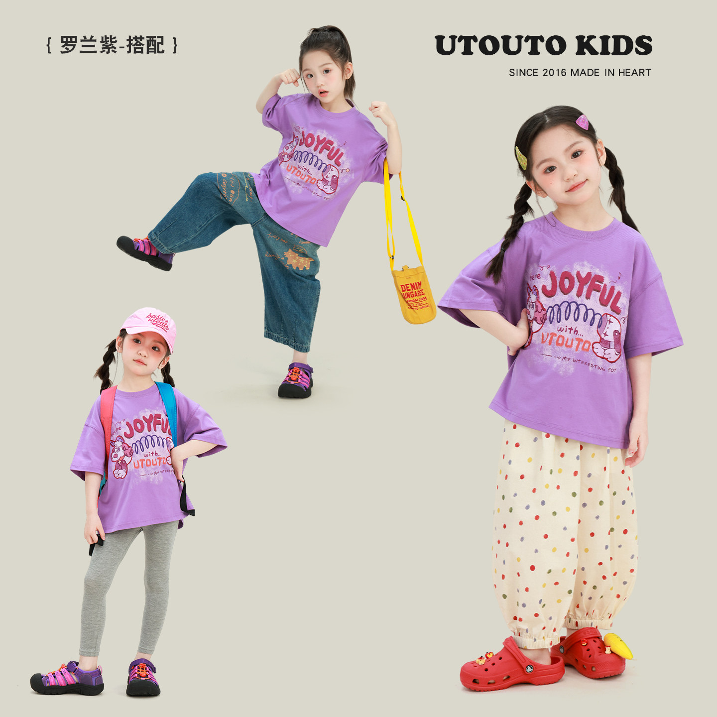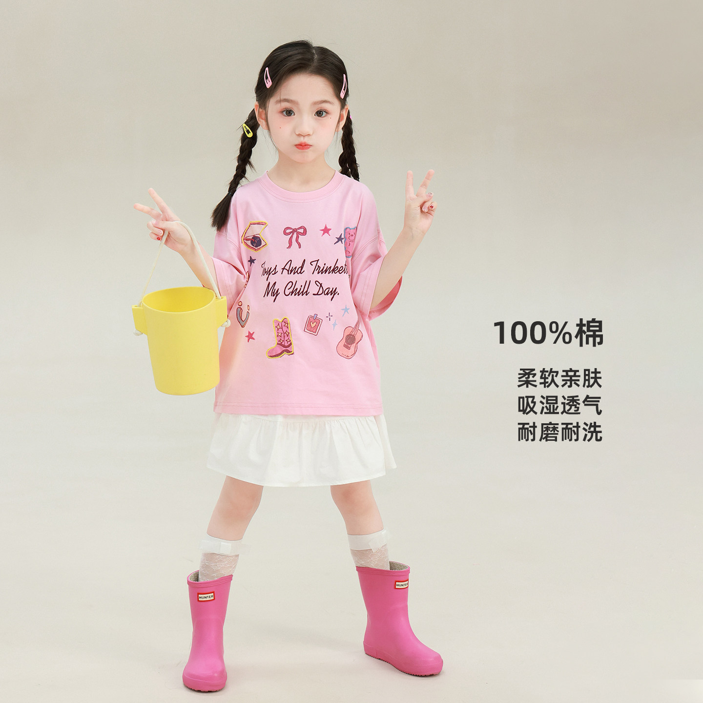 大耳象女童印花T恤2026夏季新款宝儿纯棉休闲百搭落肩薄短袖上衣