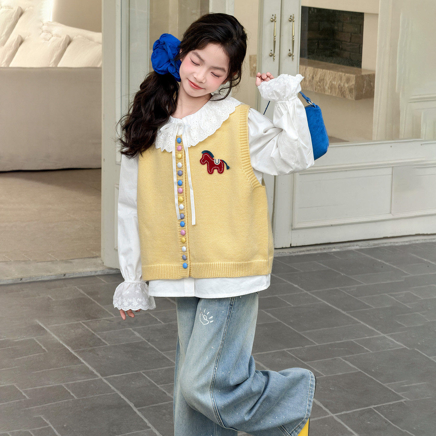 女童春装毛衣马甲衬衫牛仔裤套装2026新款初中生女生阔腿裤三件套