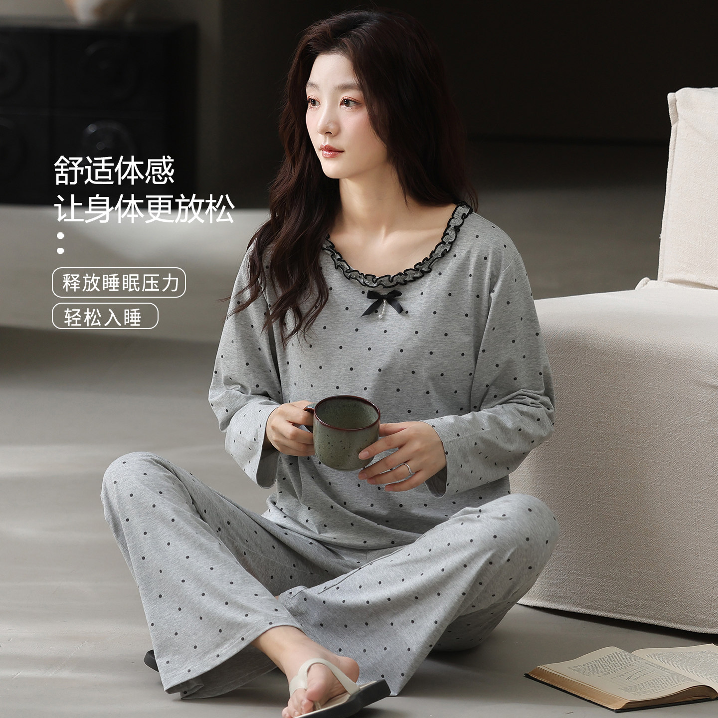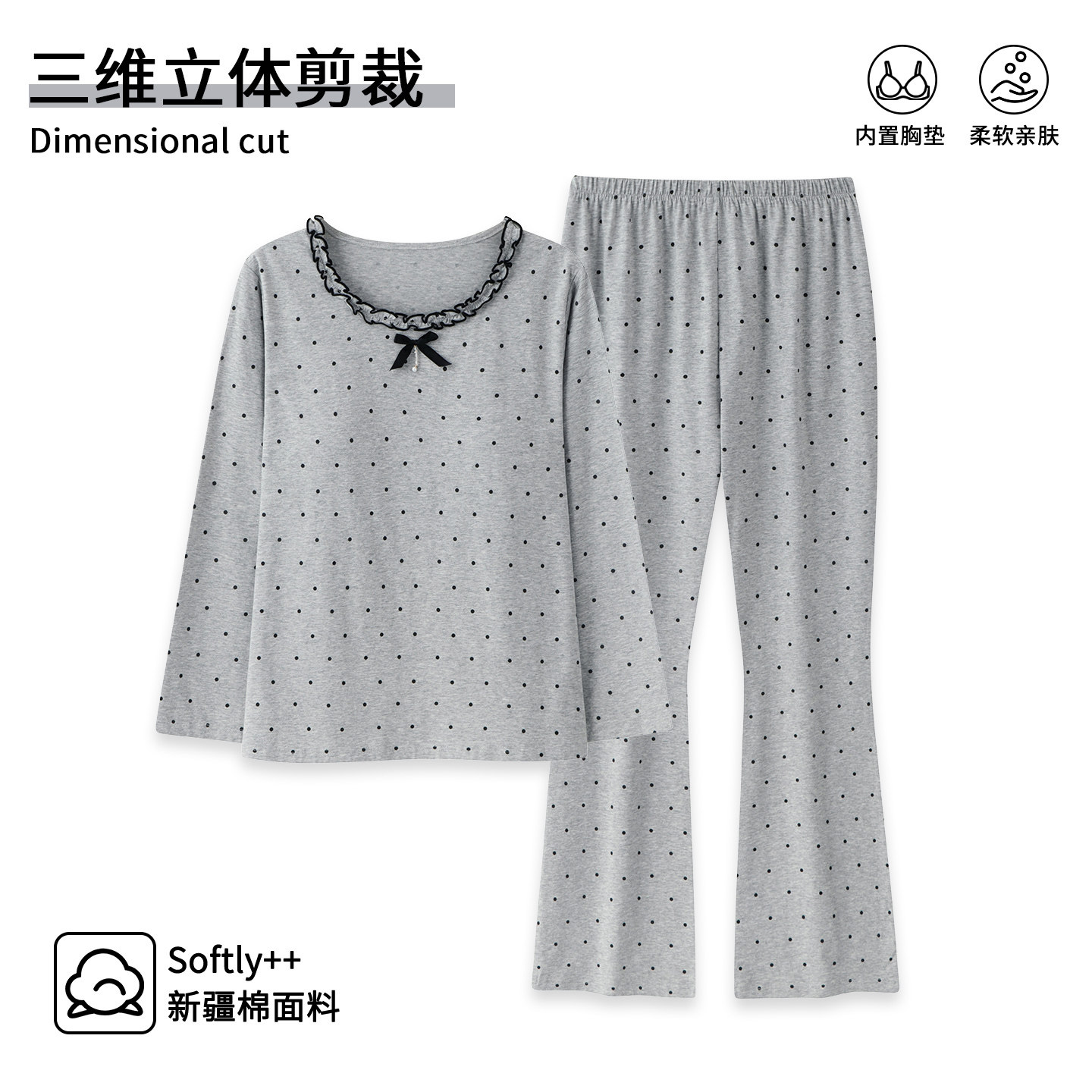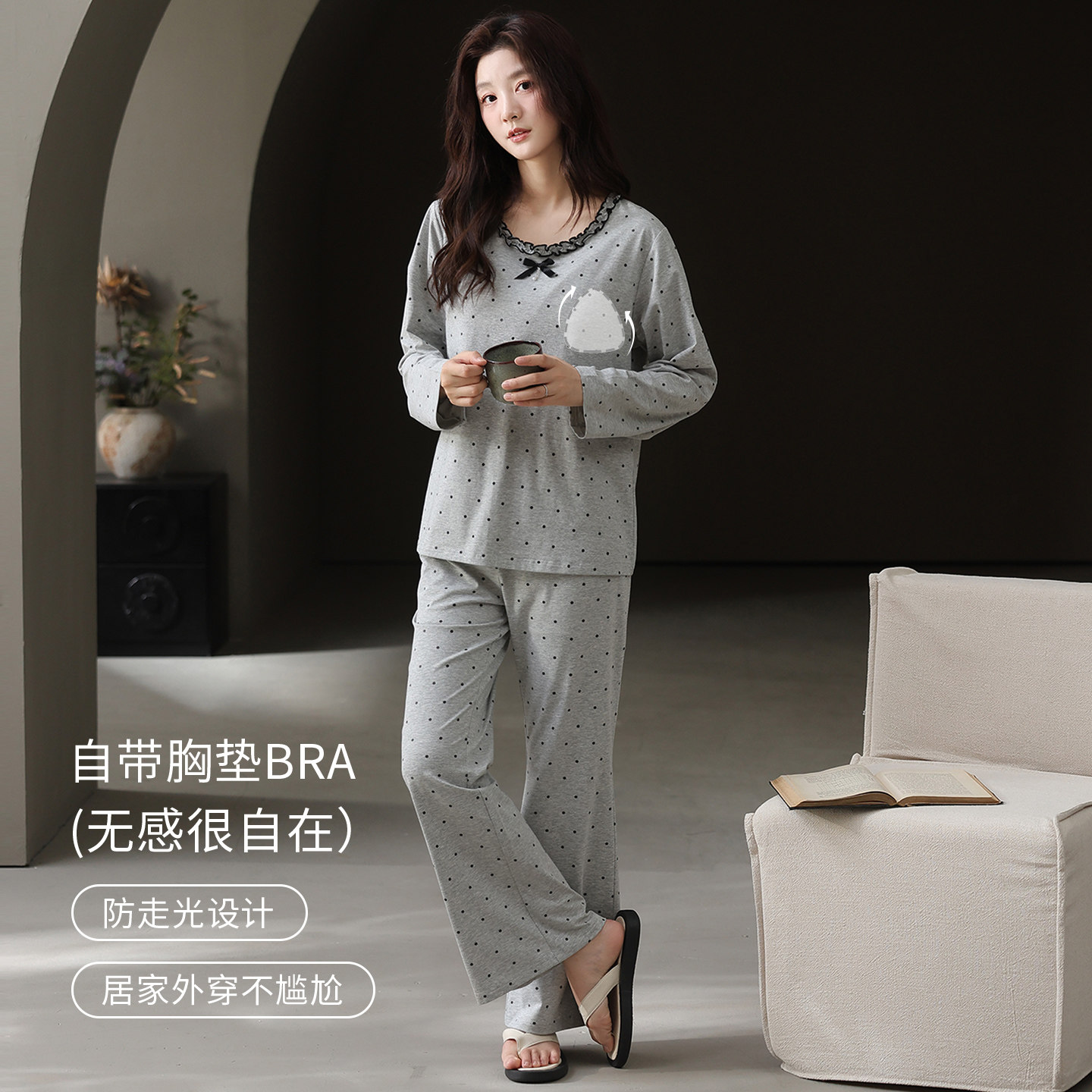 芬腾可安睡衣女款2026新款冬高级感秋季纯棉带胸垫长袖圆点家居服