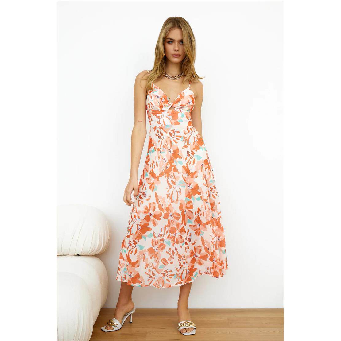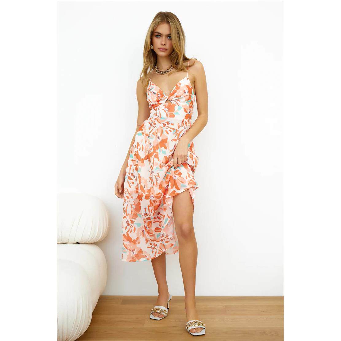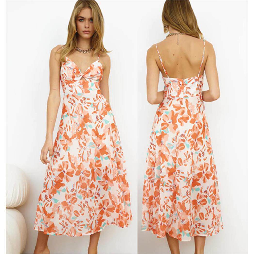 欧洲站夏季新款V领碎花印花镂空露背修身吊带无袖中长款连衣裙女