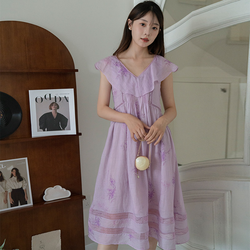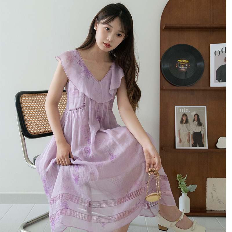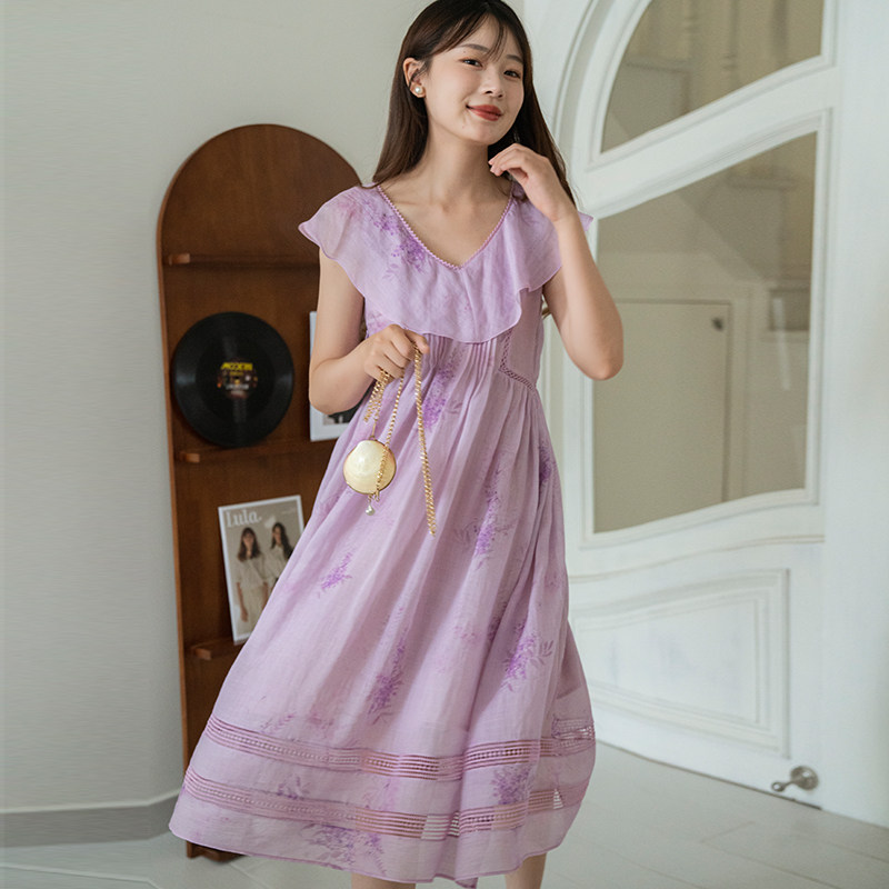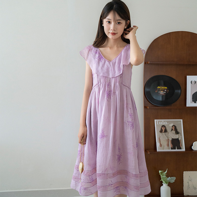 法式长裙沙滩裙新款苎麻印花碎花连衣裙女夏高级感海边度假裙子