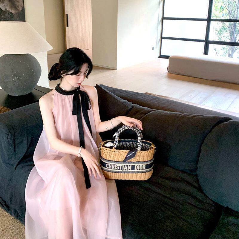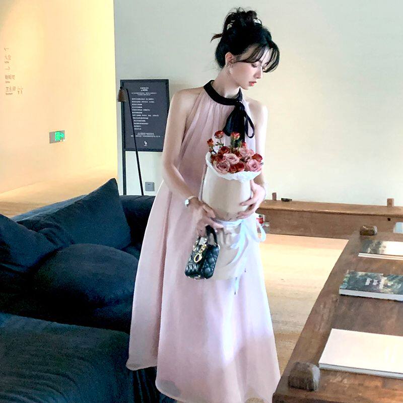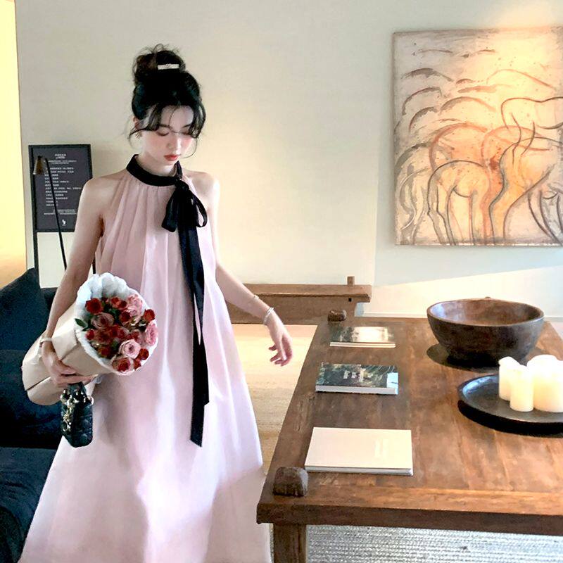 粉色温柔甜美风挂脖连衣裙女夏季海边气质短裙子小个子短款网纱裙