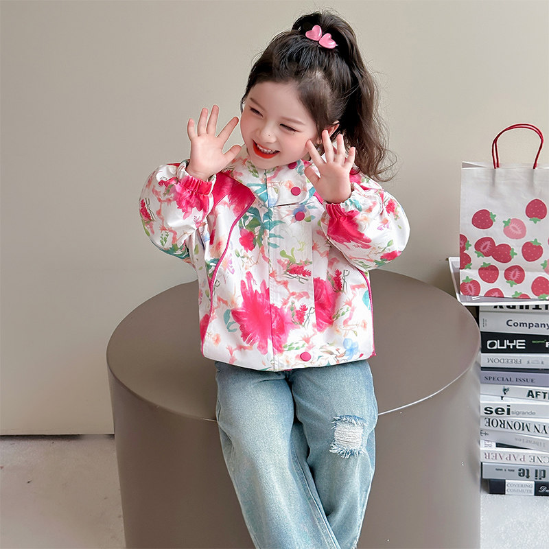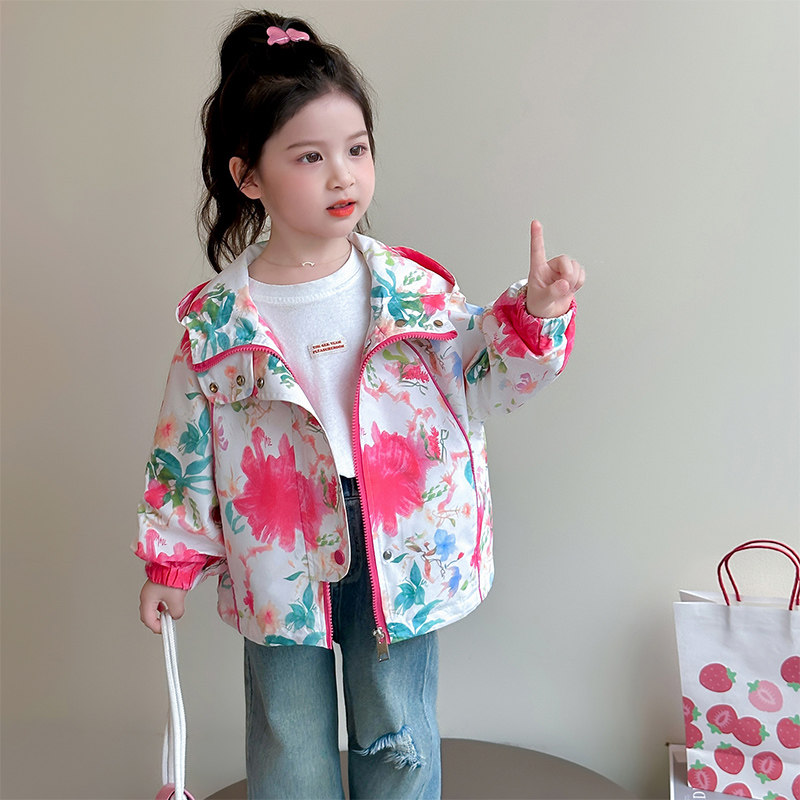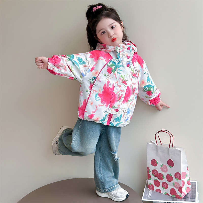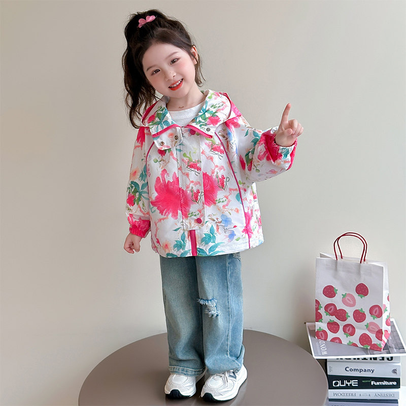 女童外套春秋款2026新款儿童洋气冲锋衣春装宝宝春季连帽上衣花朵