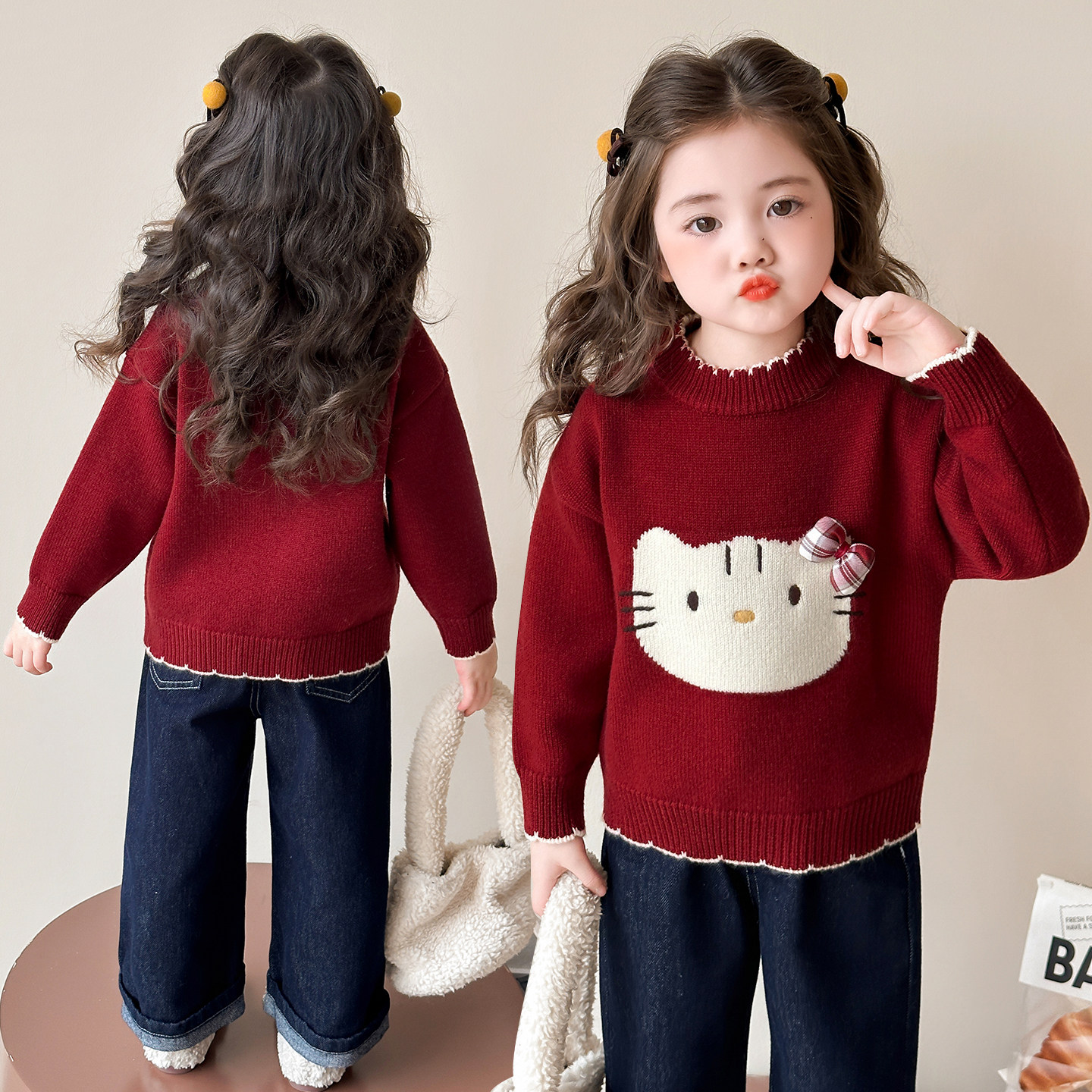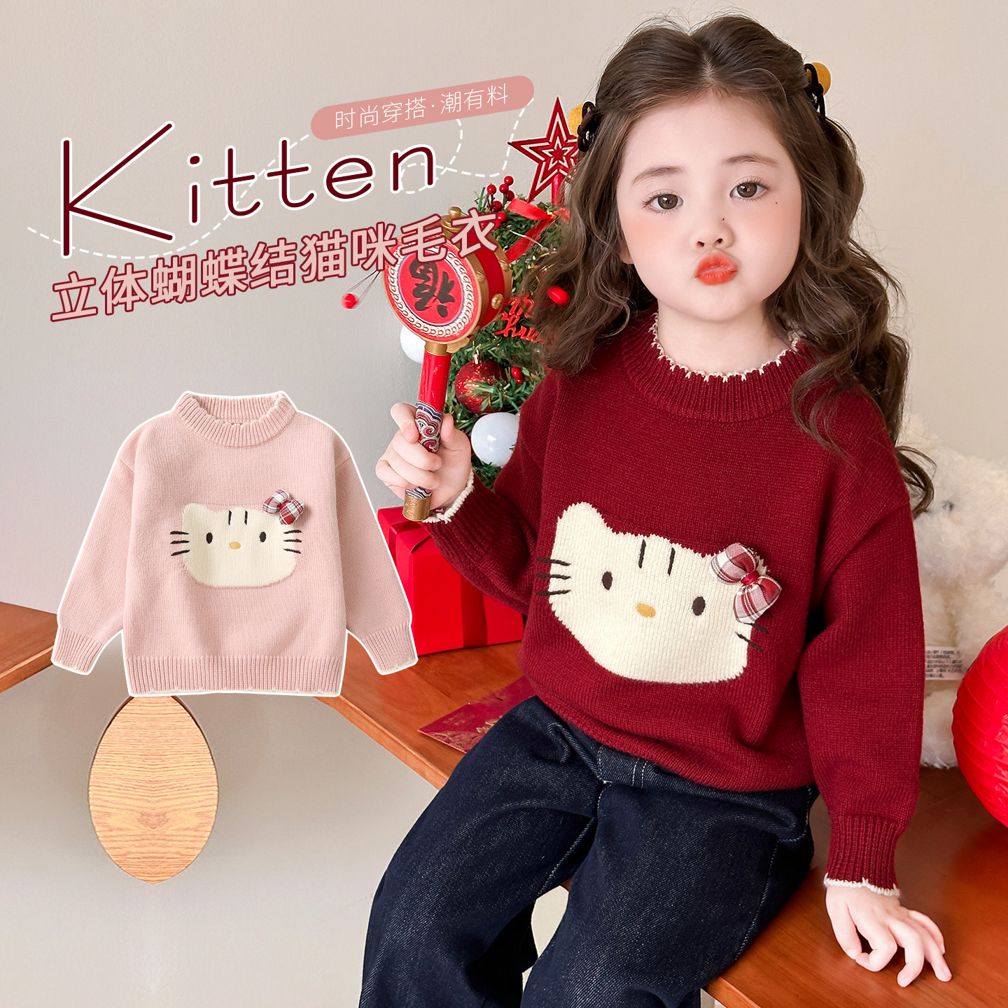 女童毛衣2025冬装新款女宝加厚宝宝冬季女款毛线衣红色儿童内搭