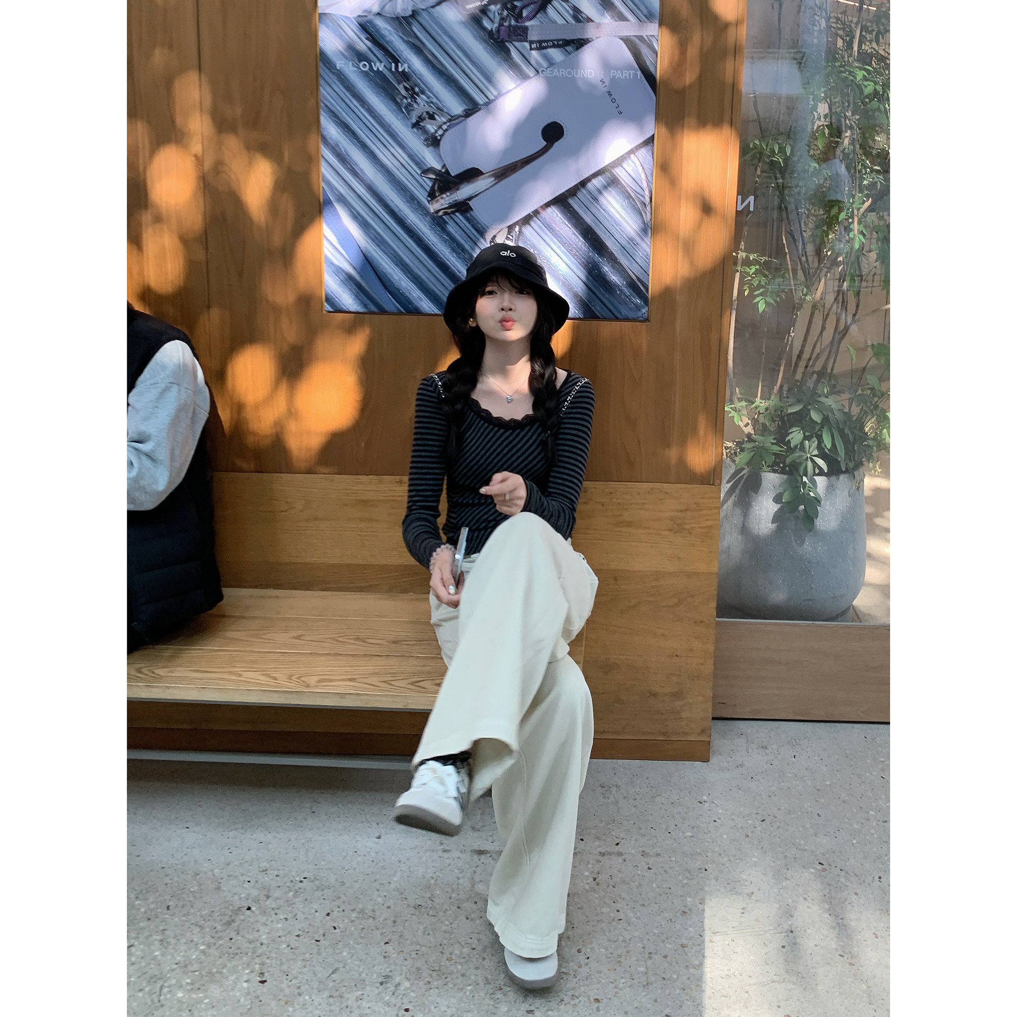 切糕自制小个子春季新款宽松裤子女杏色工装裤白色女款休闲牛仔裤