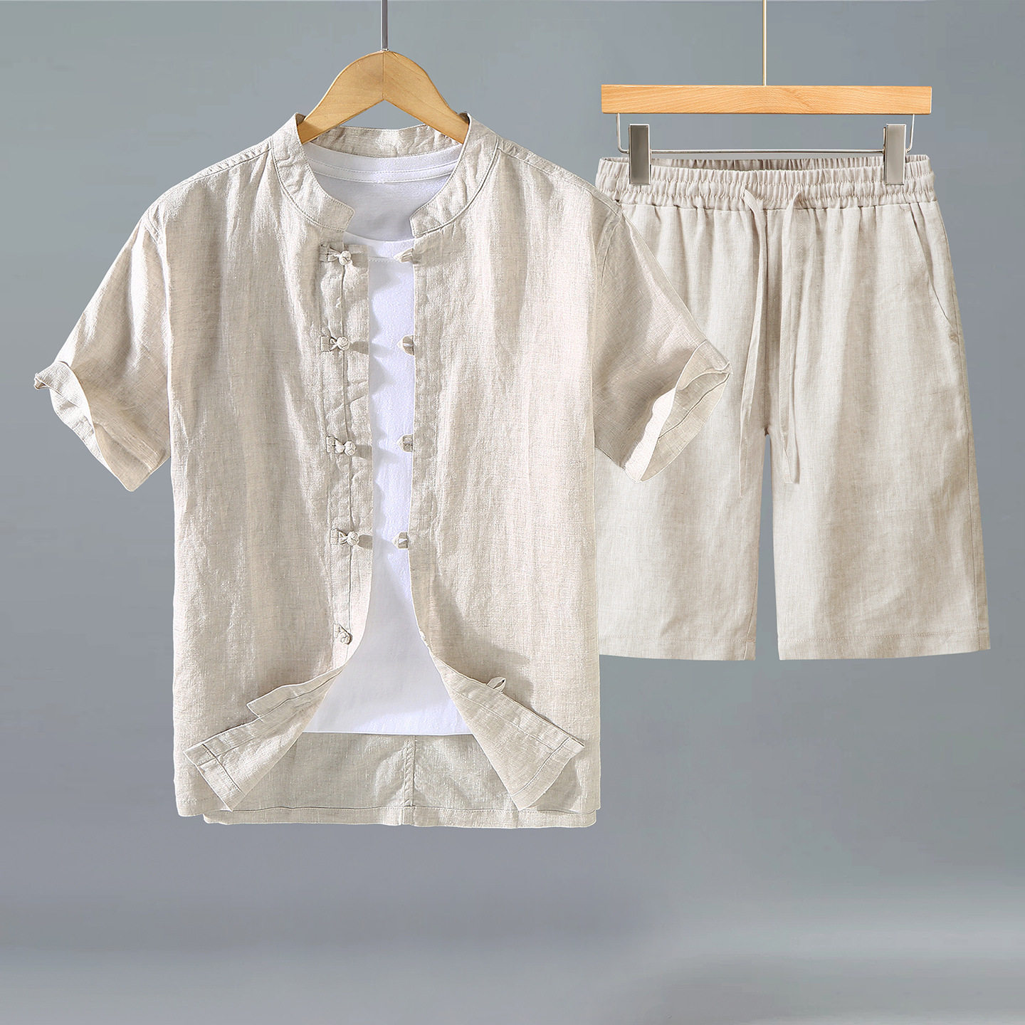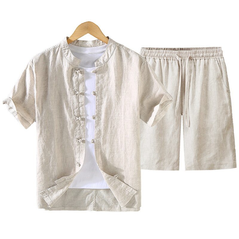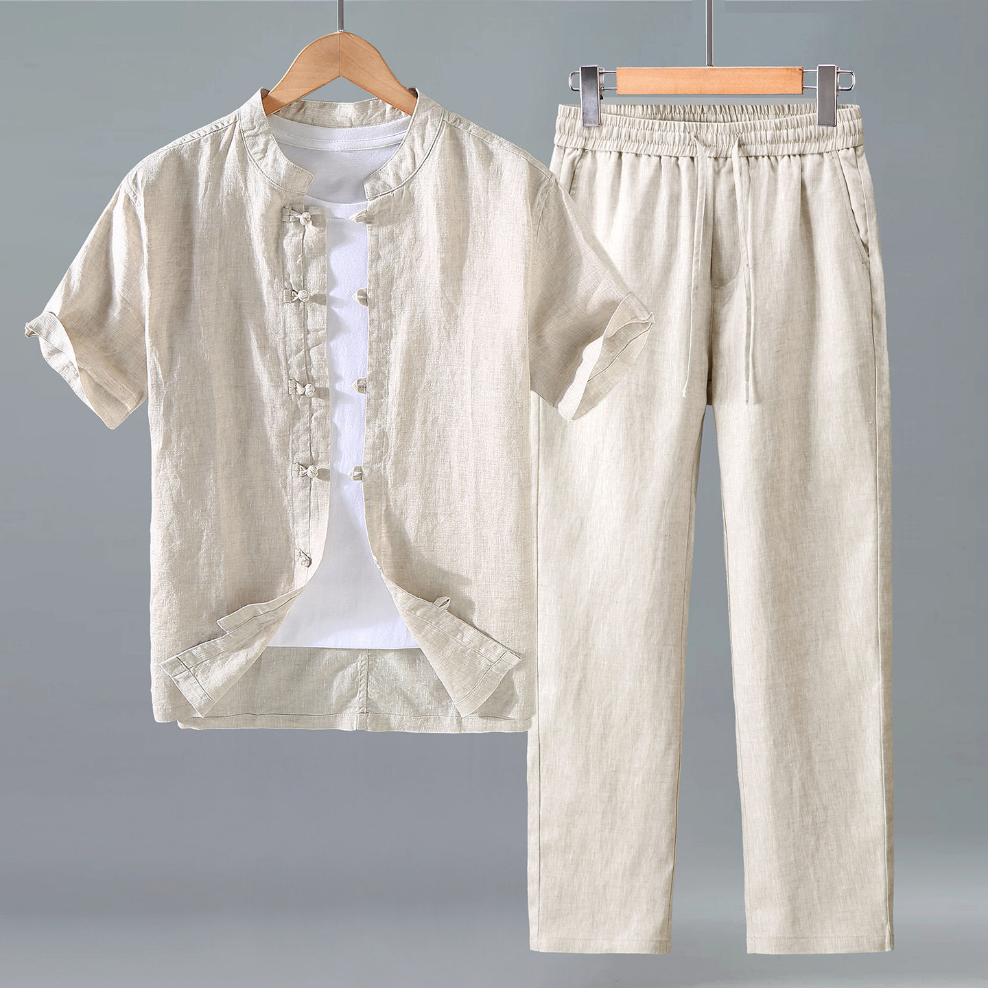 100%纯亚麻唐装男款夏季透气短袖衬衫套装中国风中式古风薄款茶服