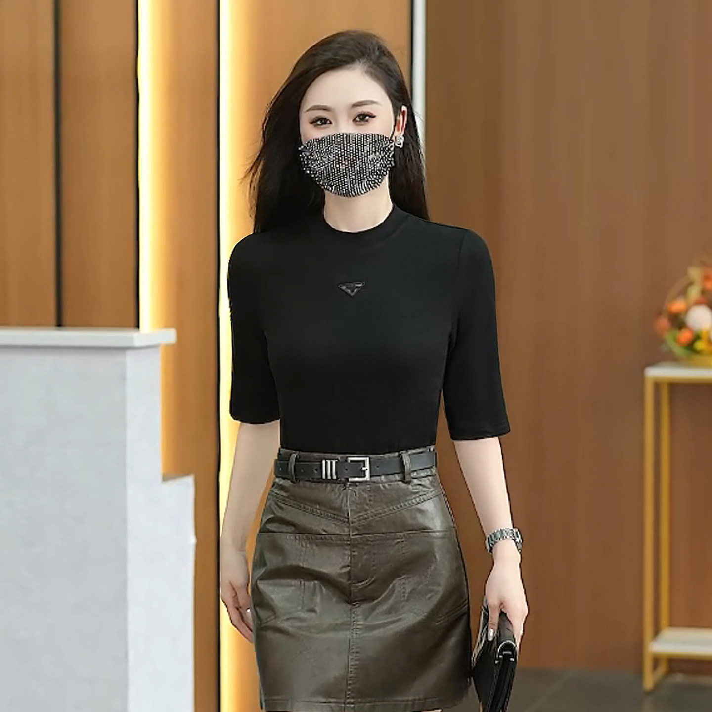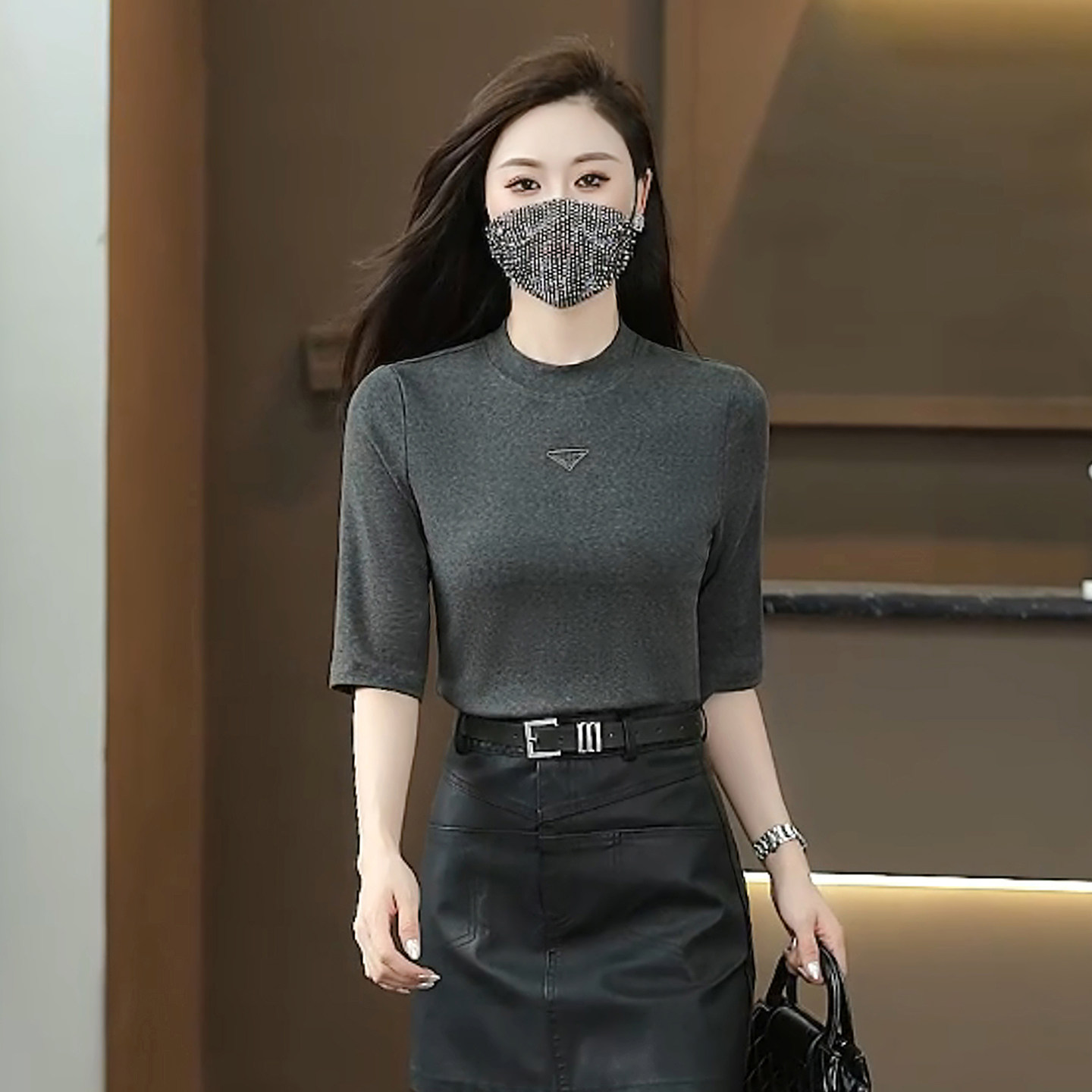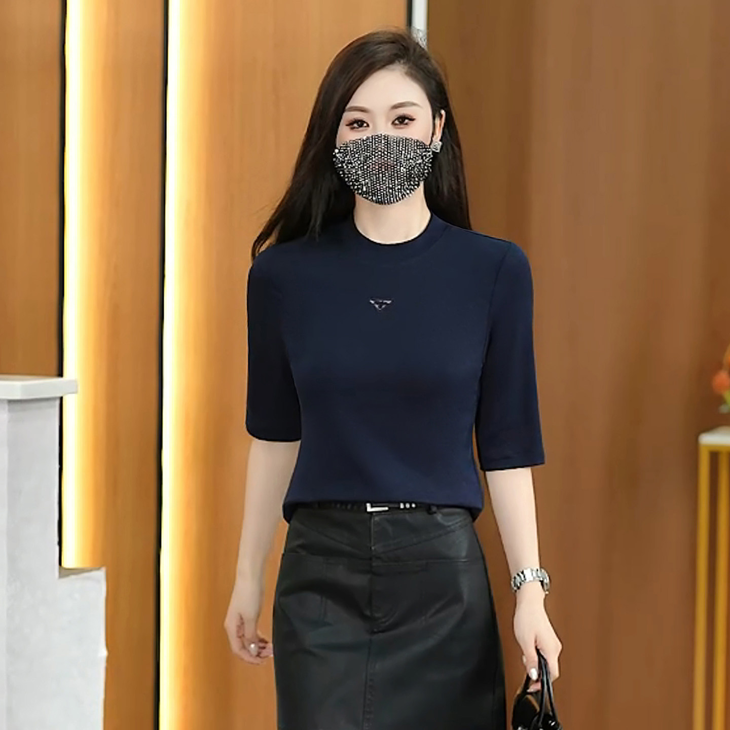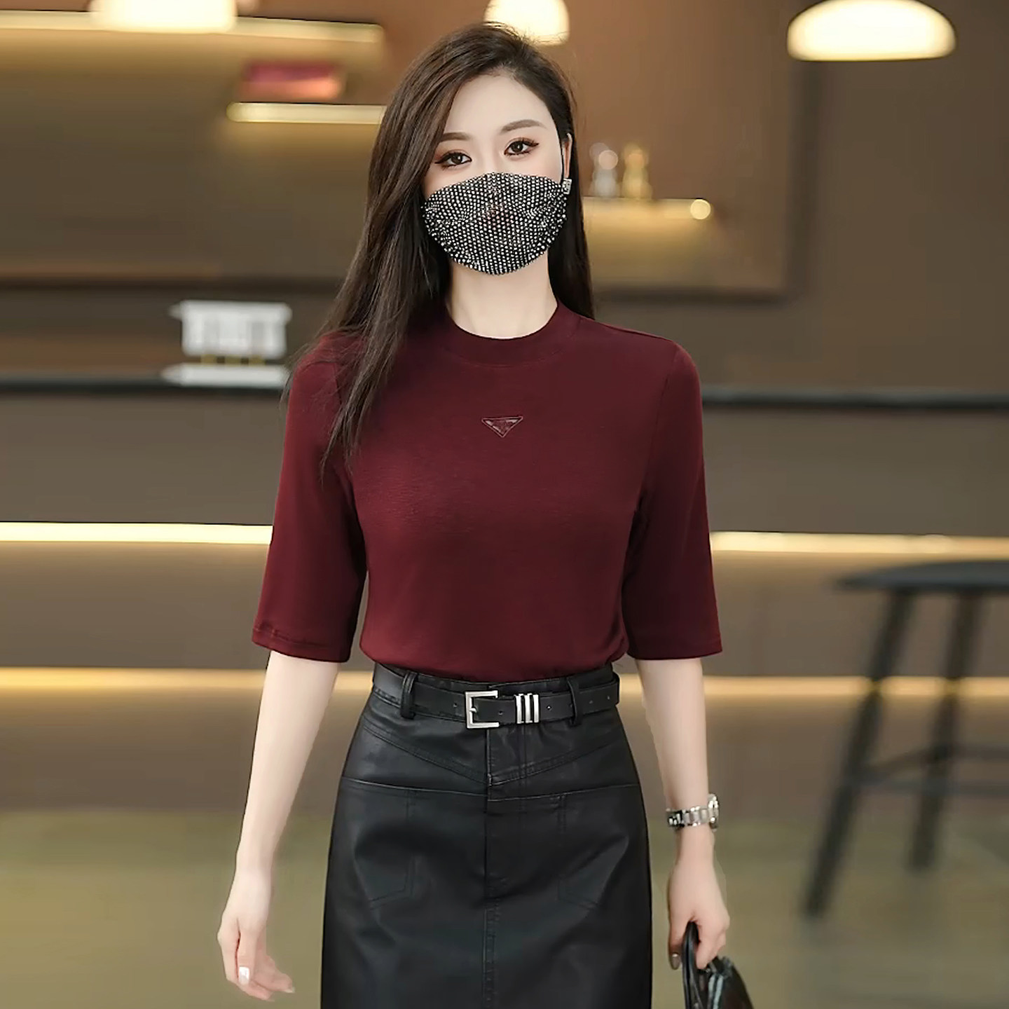 五分袖圆领t恤女春款2026新款时尚洋气小衫修身显瘦中袖打底上衣