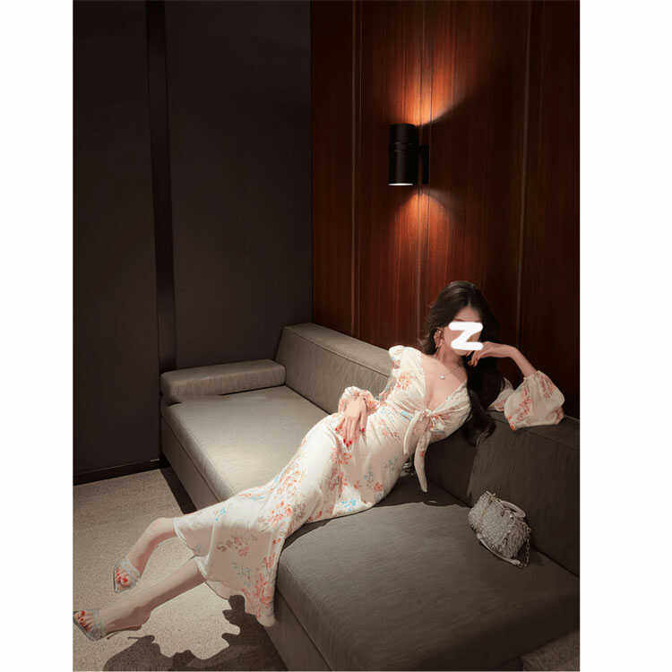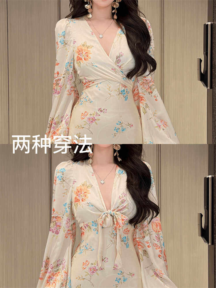 大码胖mm韩系气质玫瑰V领长袖碎花连衣裙女收腰显瘦包臀鱼尾裙子