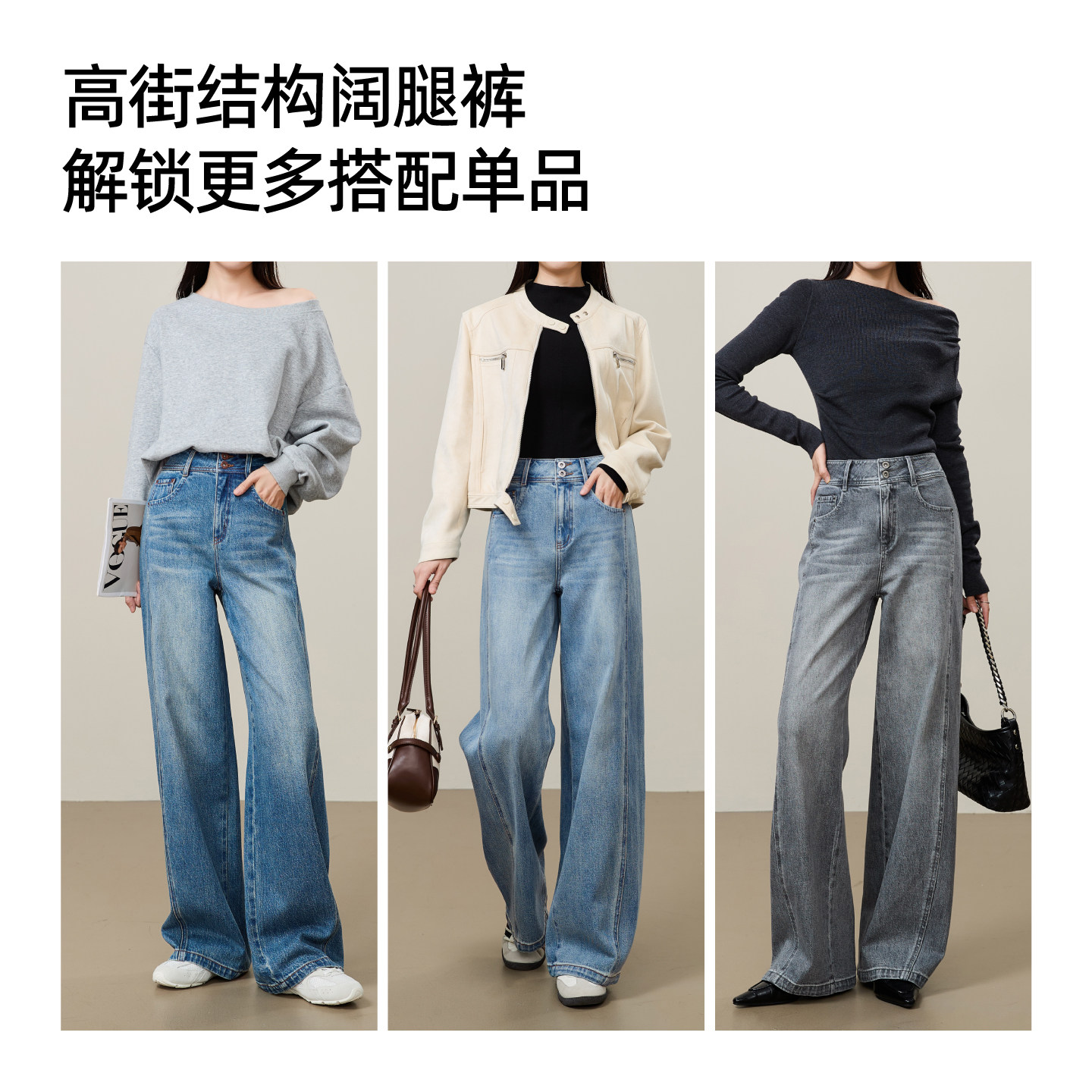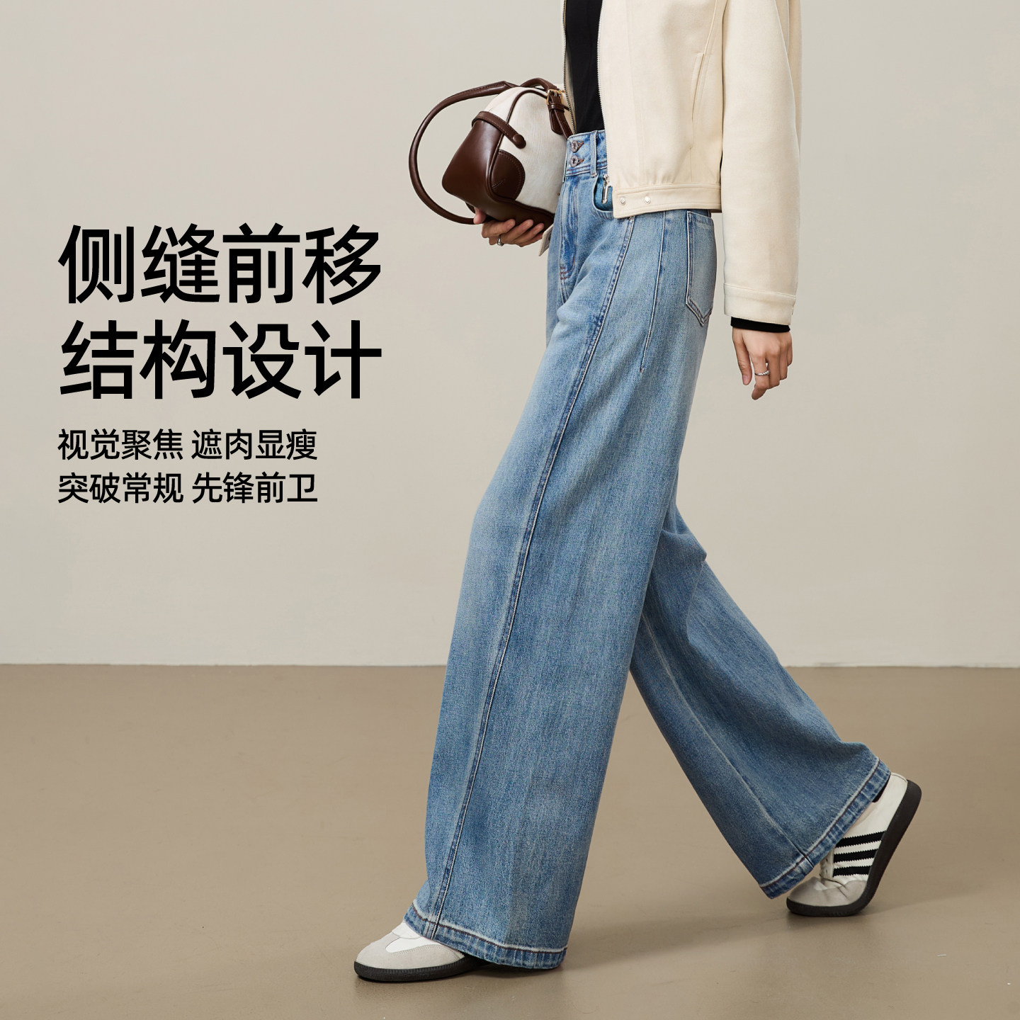 逸阳2026年新春季新款高街蓝色直筒牛仔裤女款侧缝拼接阔腿裤子