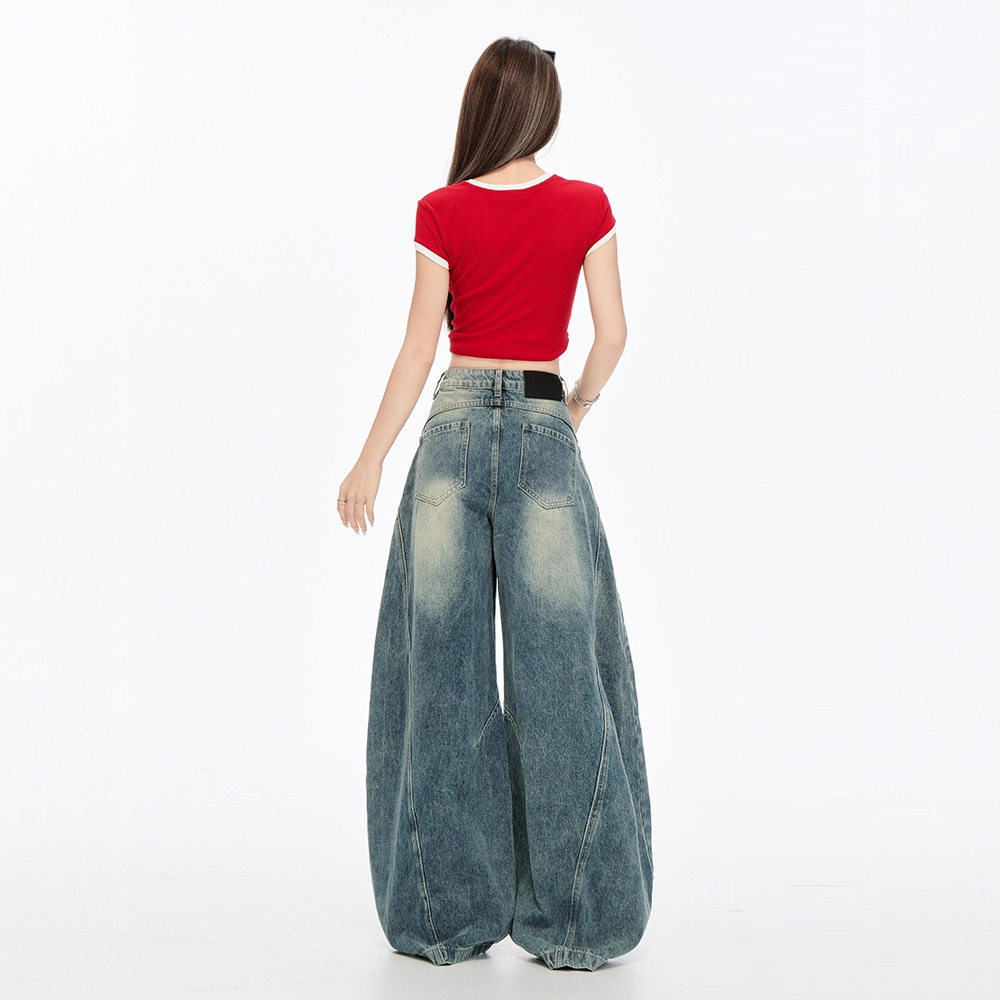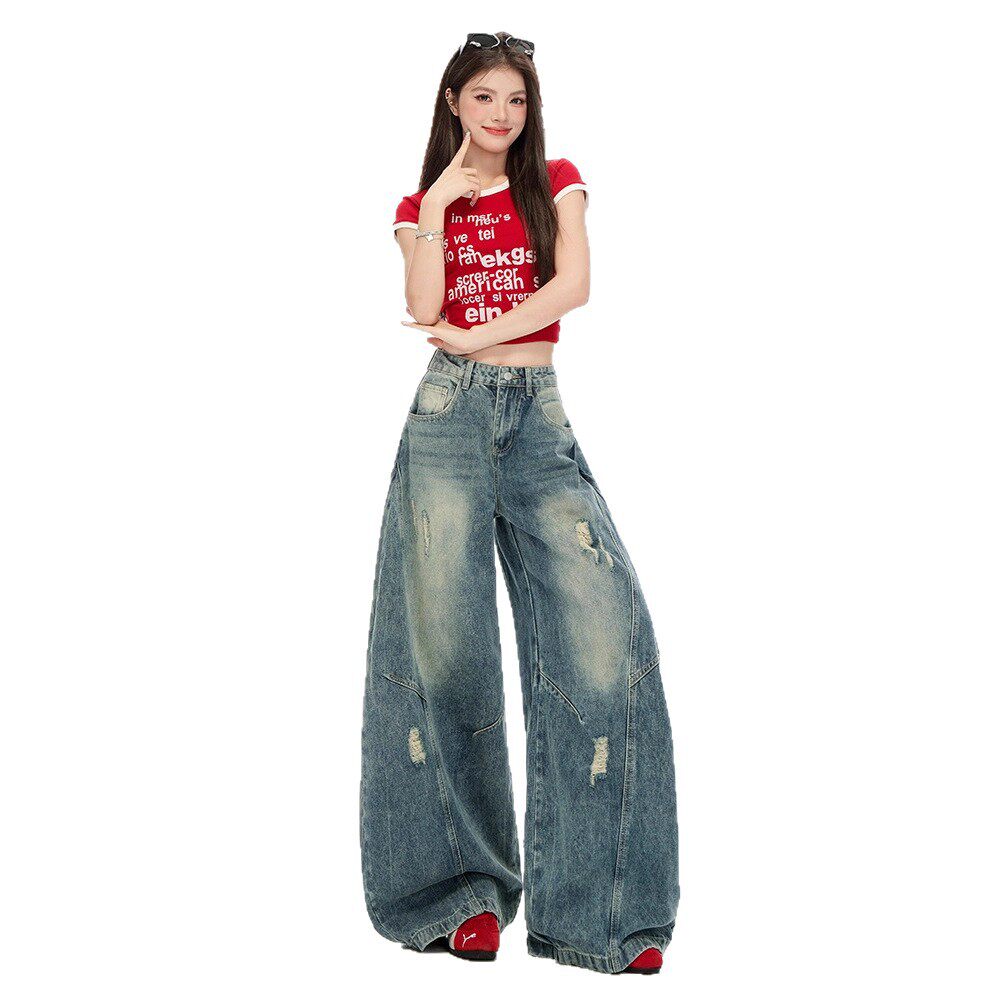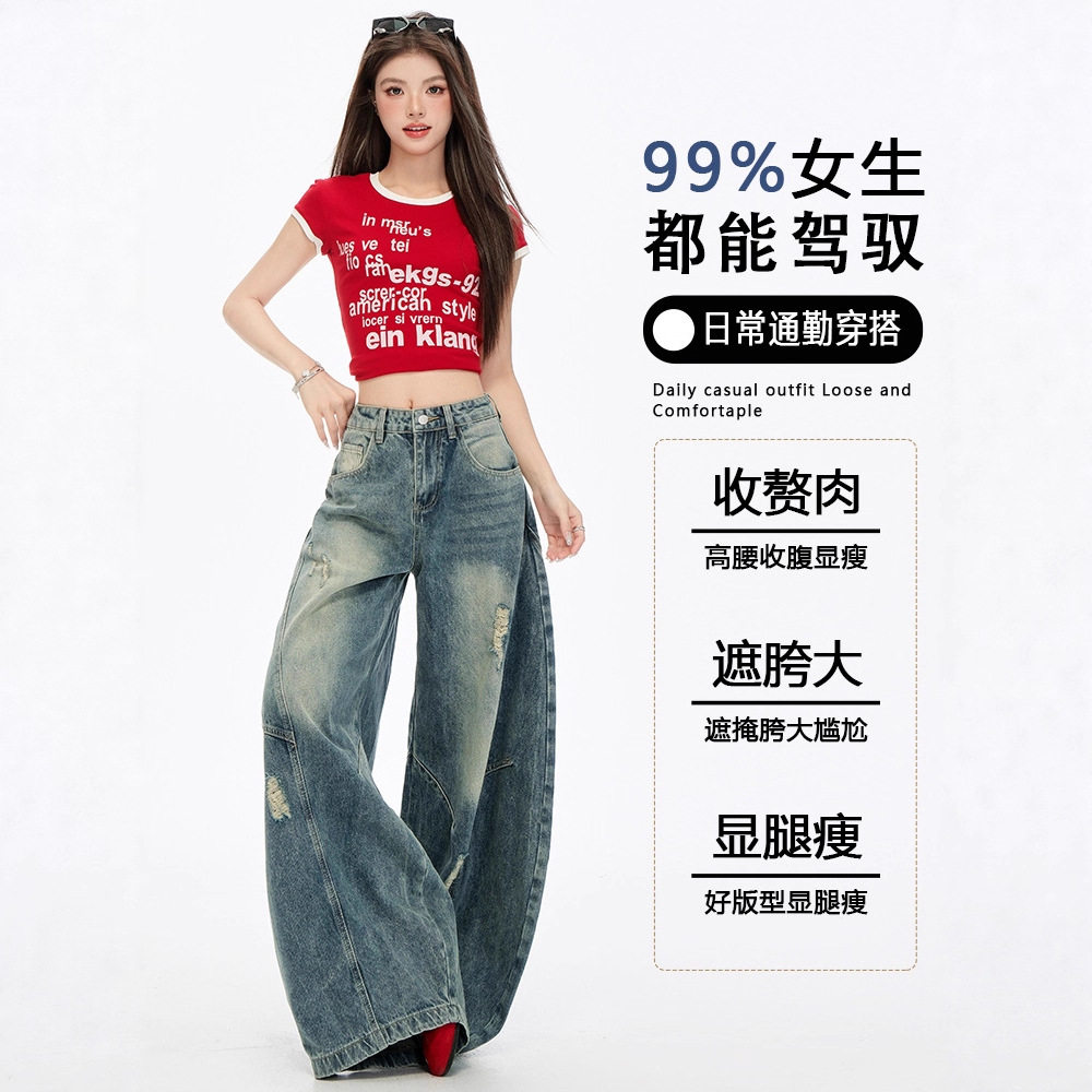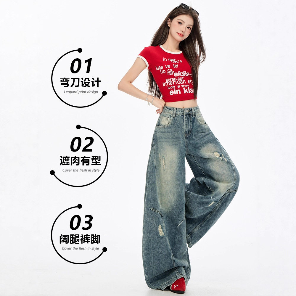 美式弯刀牛仔裤阔腿宽松女弯刀裤女小个子高腰显瘦镰刀裤子女款秋