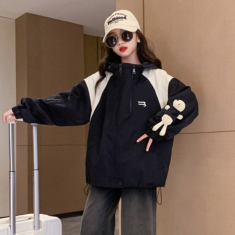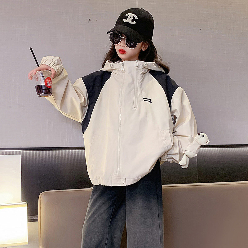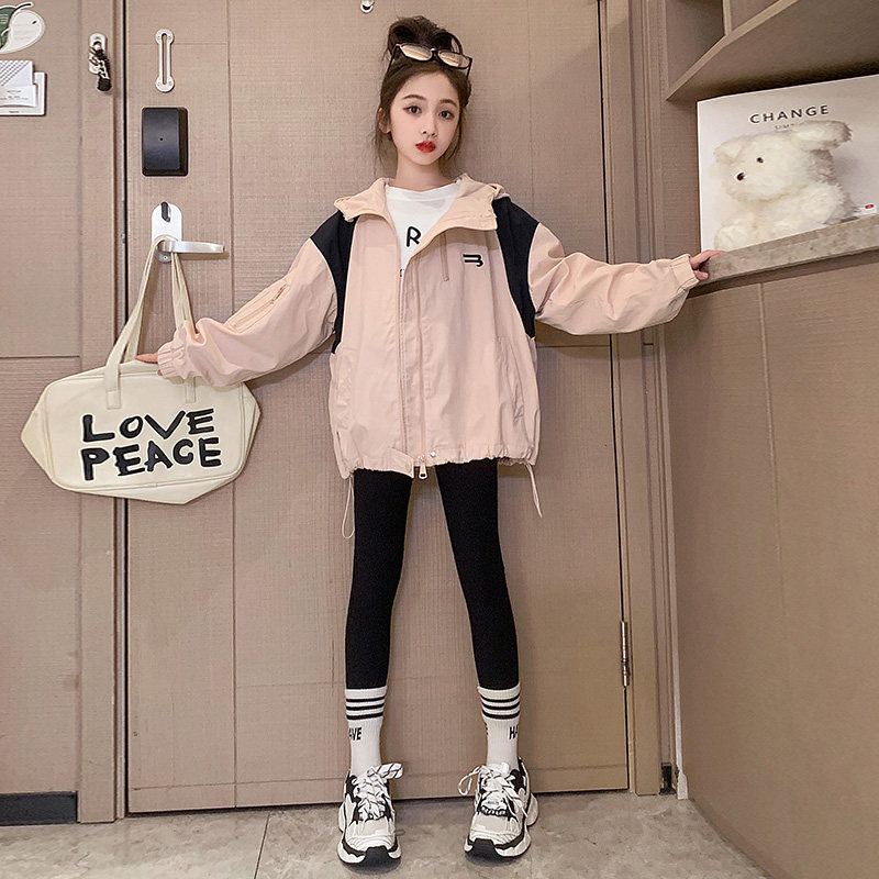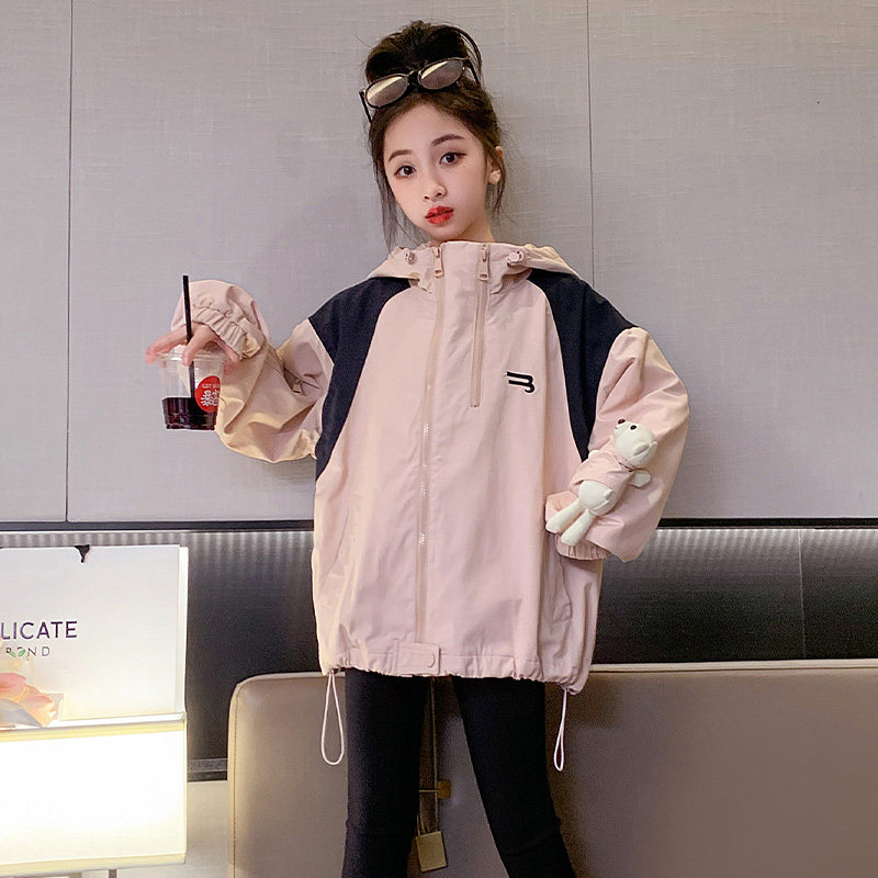 女童春装连帽拼色冲锋衣2026新款初中学生宽松防风外套中大童夹克
