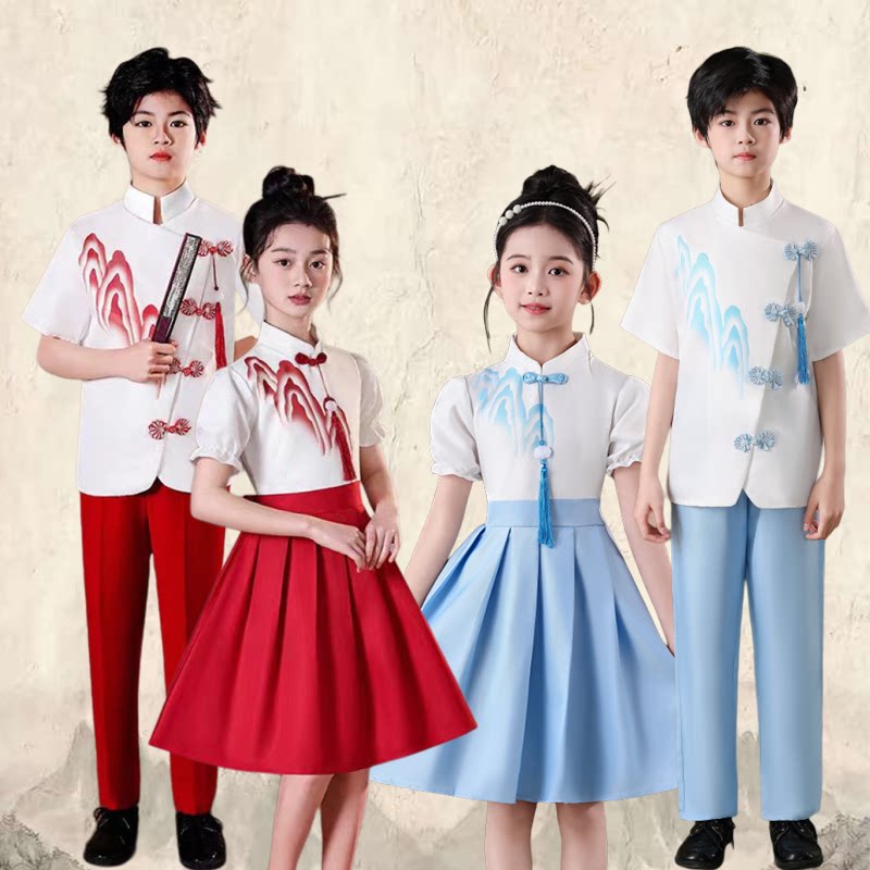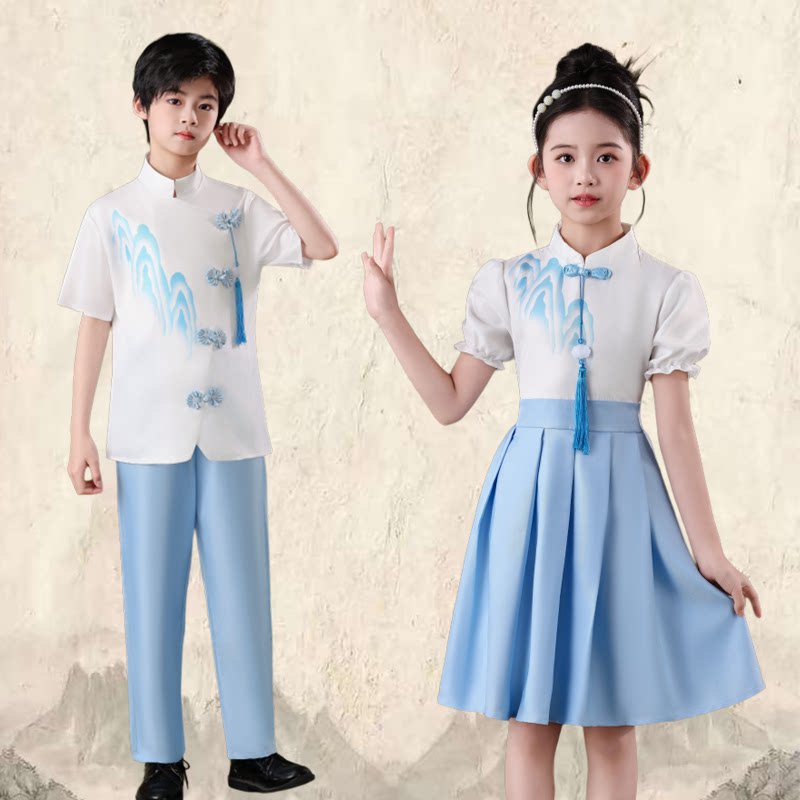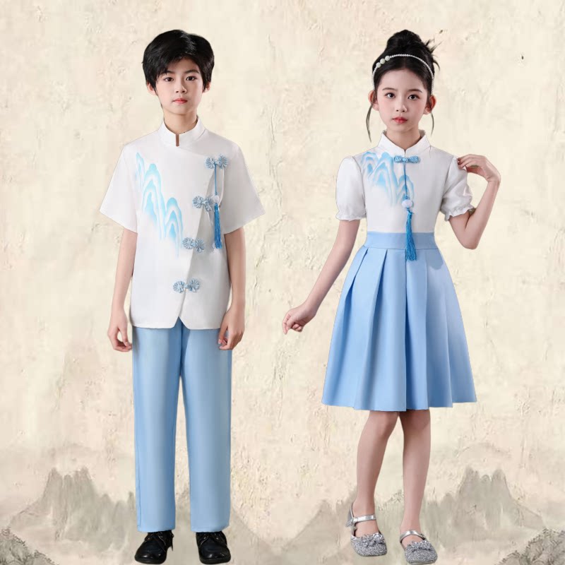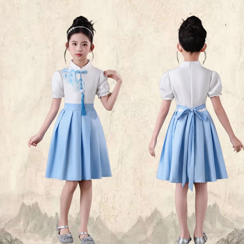 六一儿童合唱朗诵演出服中国风小学生女童蓝色诗歌演讲比赛礼服装