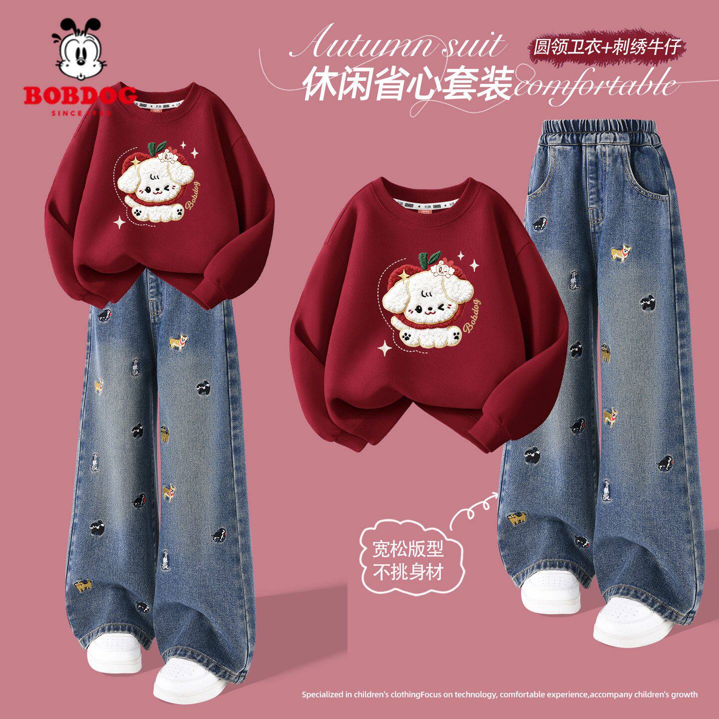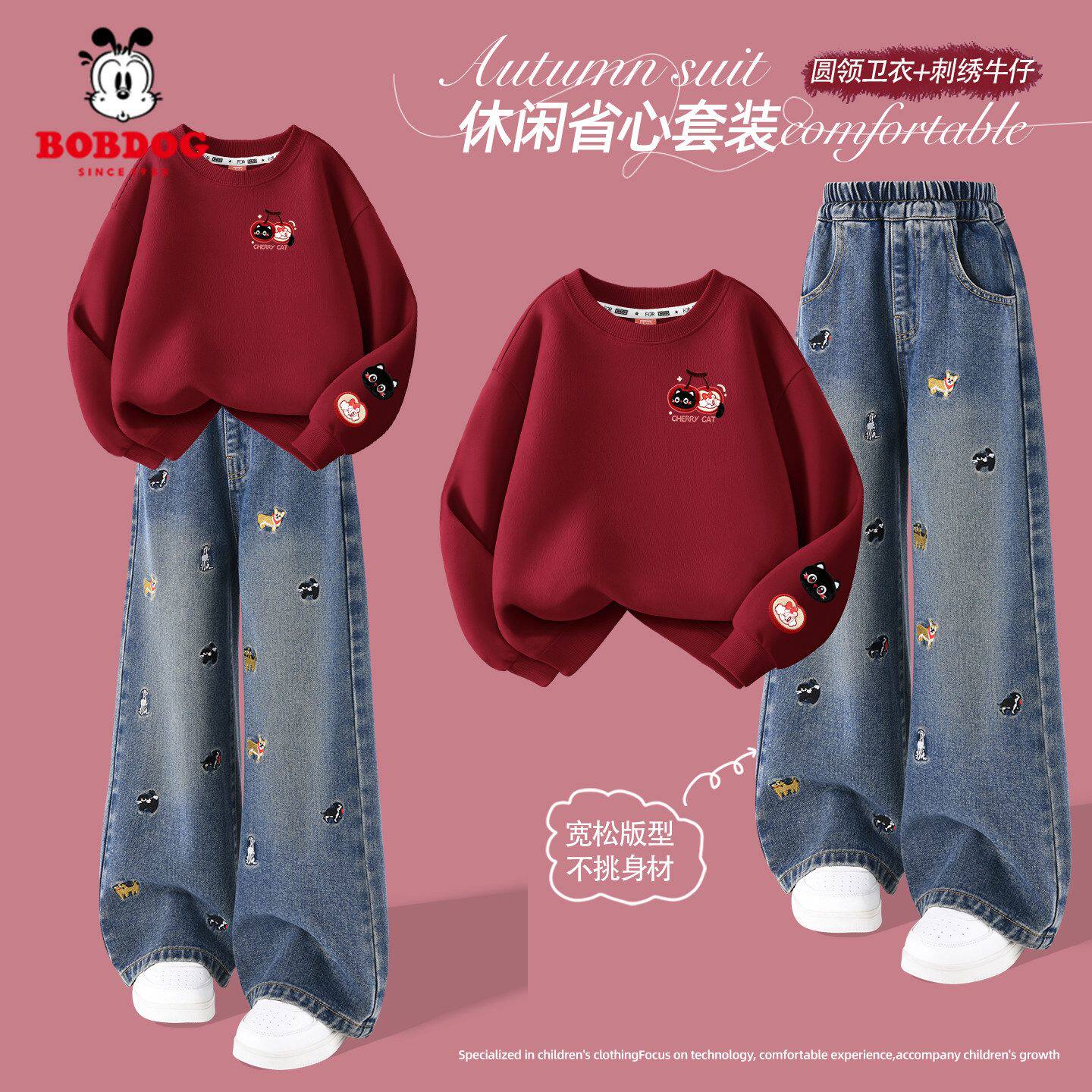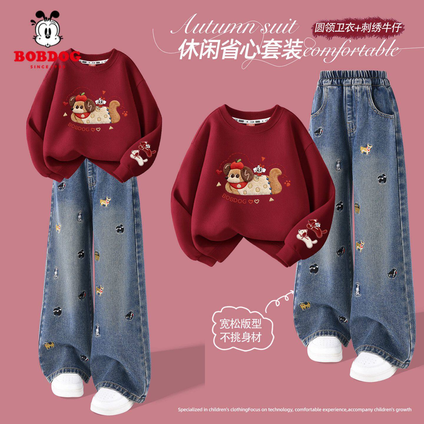 巴布豆女童套装春2026新款大童蝴蝶结卫衣红色洋气儿童牛仔裤薄款