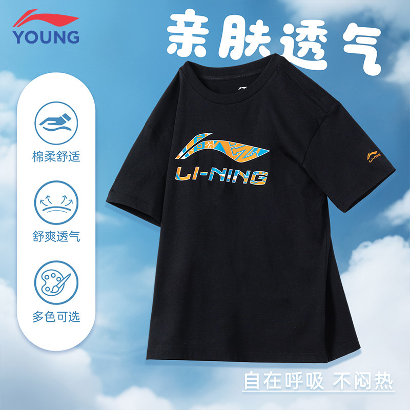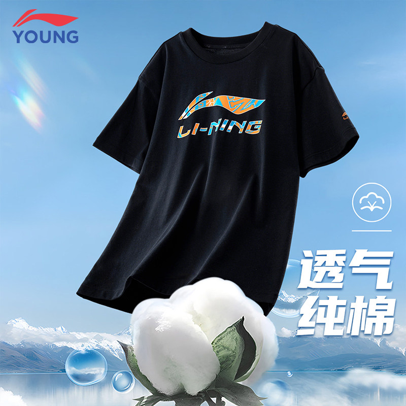 李宁童装凉爽T恤男女大童黑色舒适运动系列纯棉透气夏季运动短袖