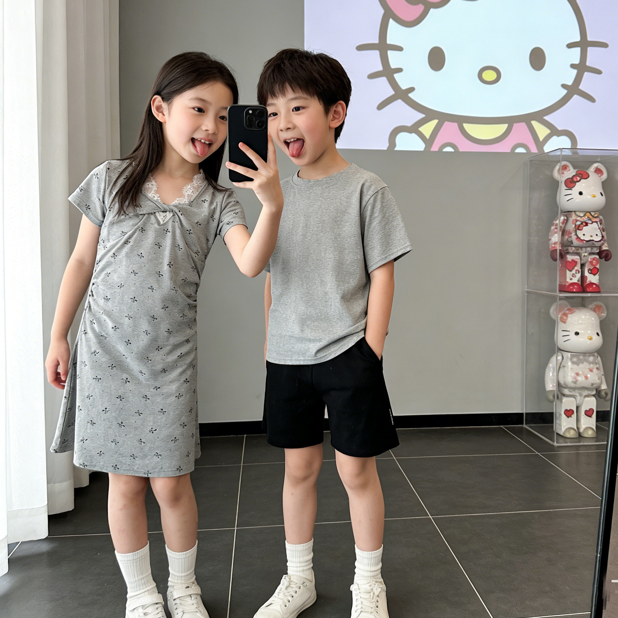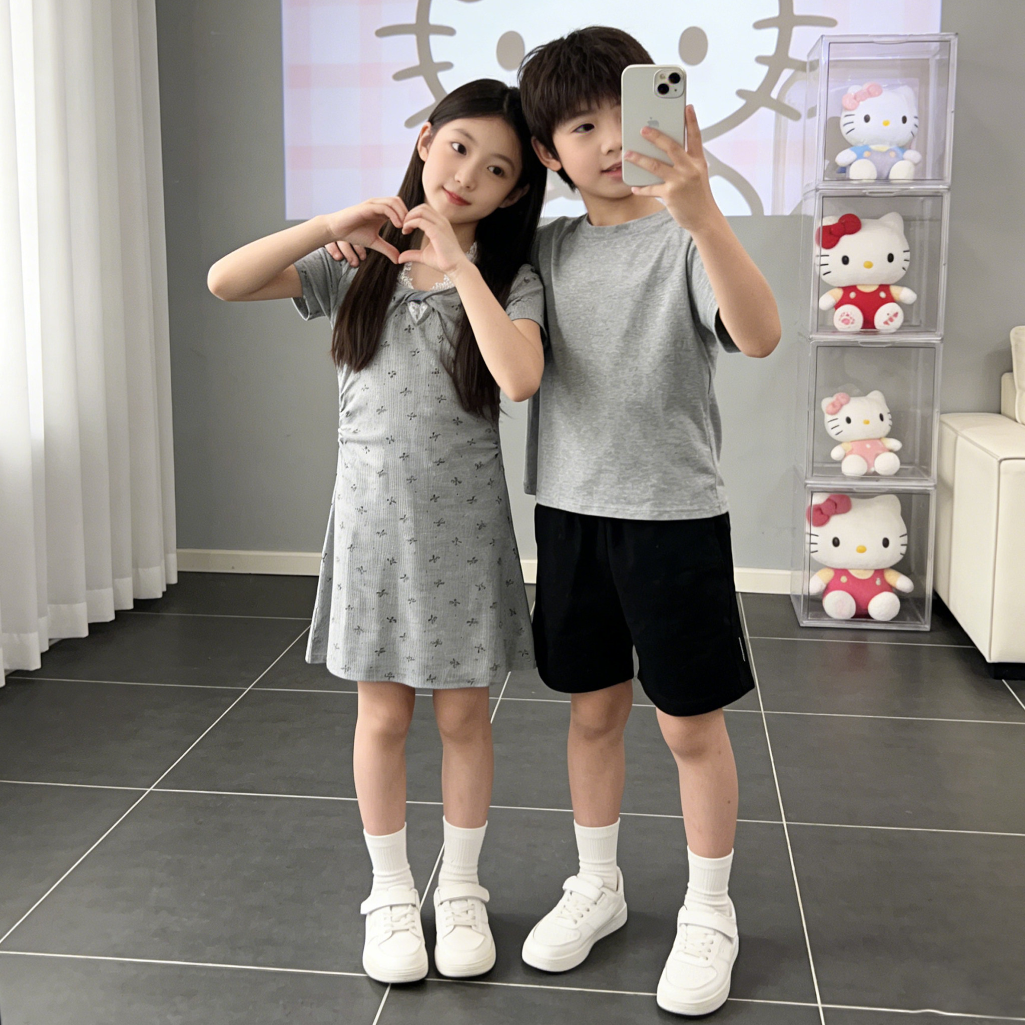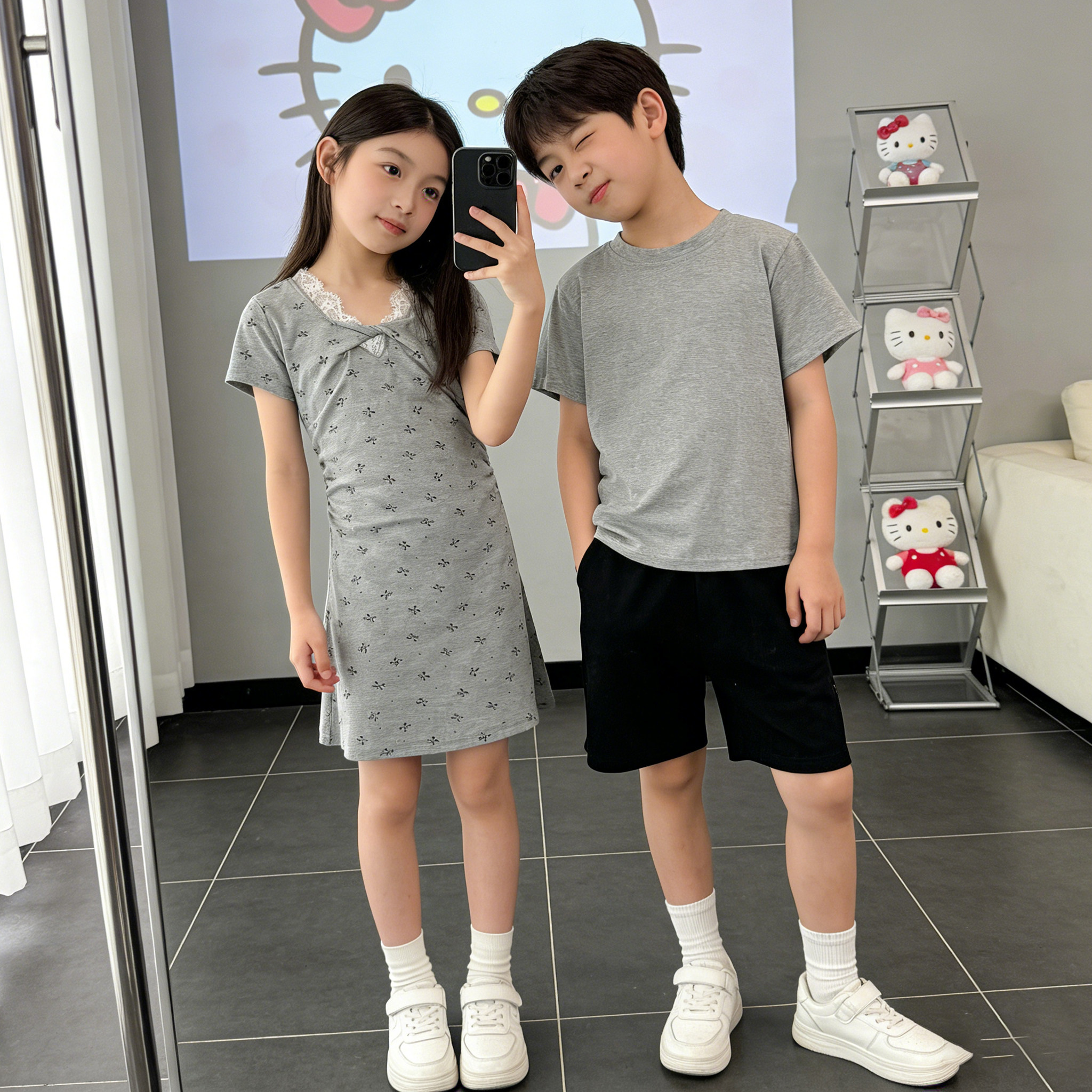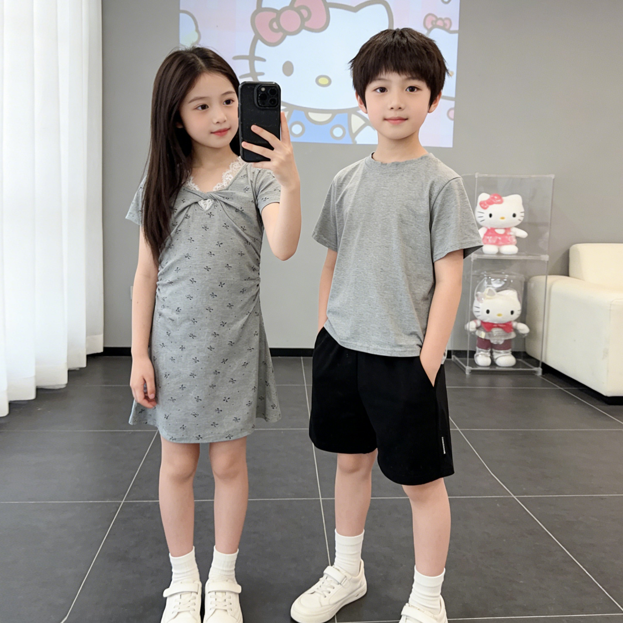 女童甜美舒适连衣裙2026新款女孩夏季蝴蝶结中长裙灰色高级感裙子