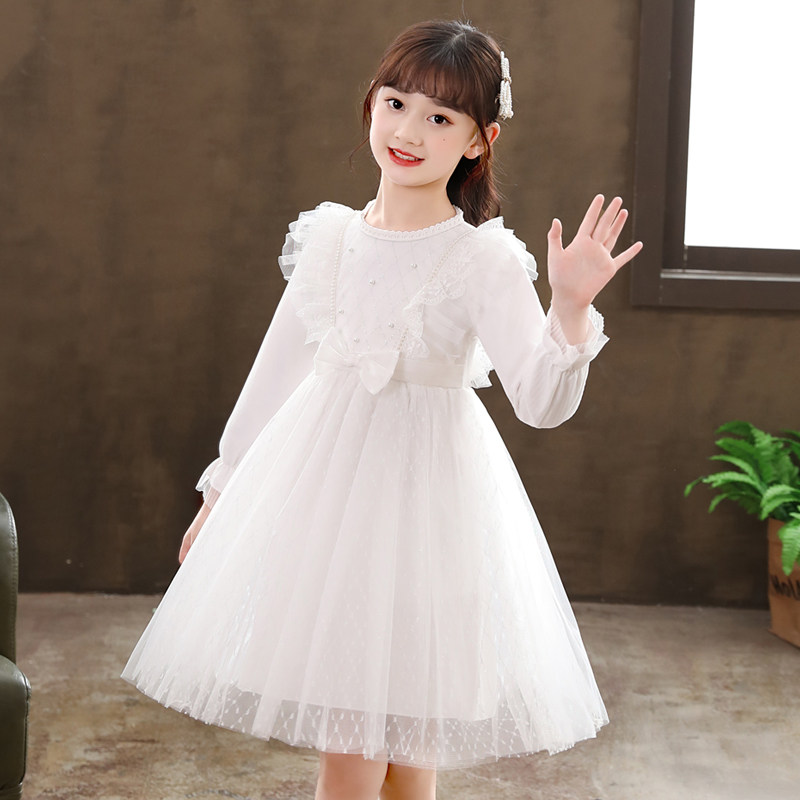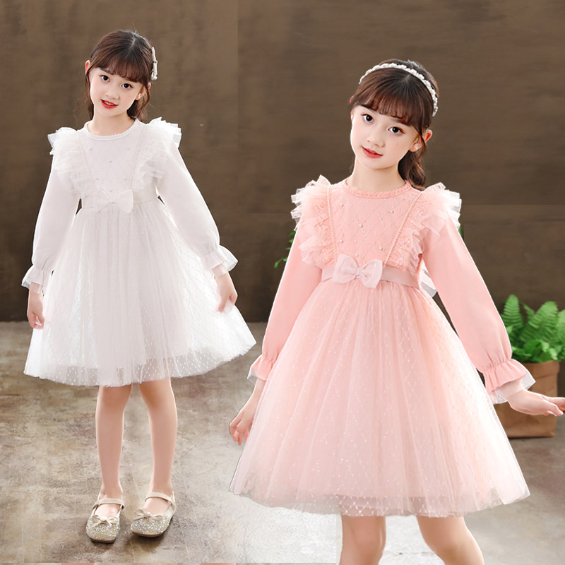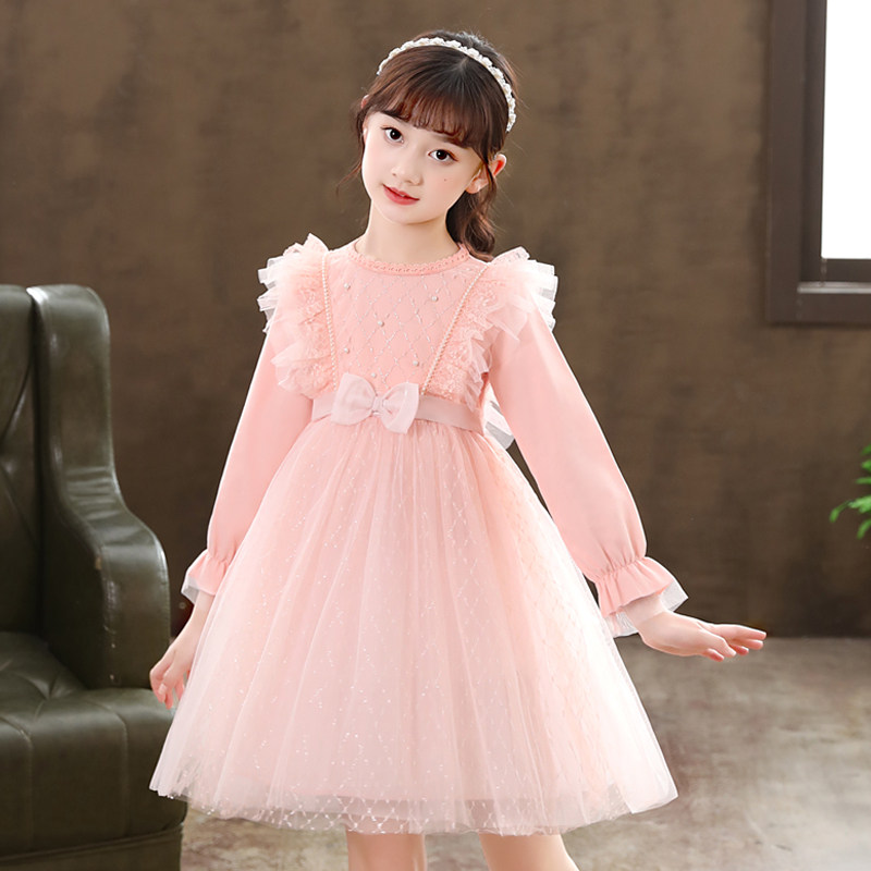 女童时髦公主裙春款2026儿童蕾丝洋气连衣裙长袖蝴蝶结红色礼服裙