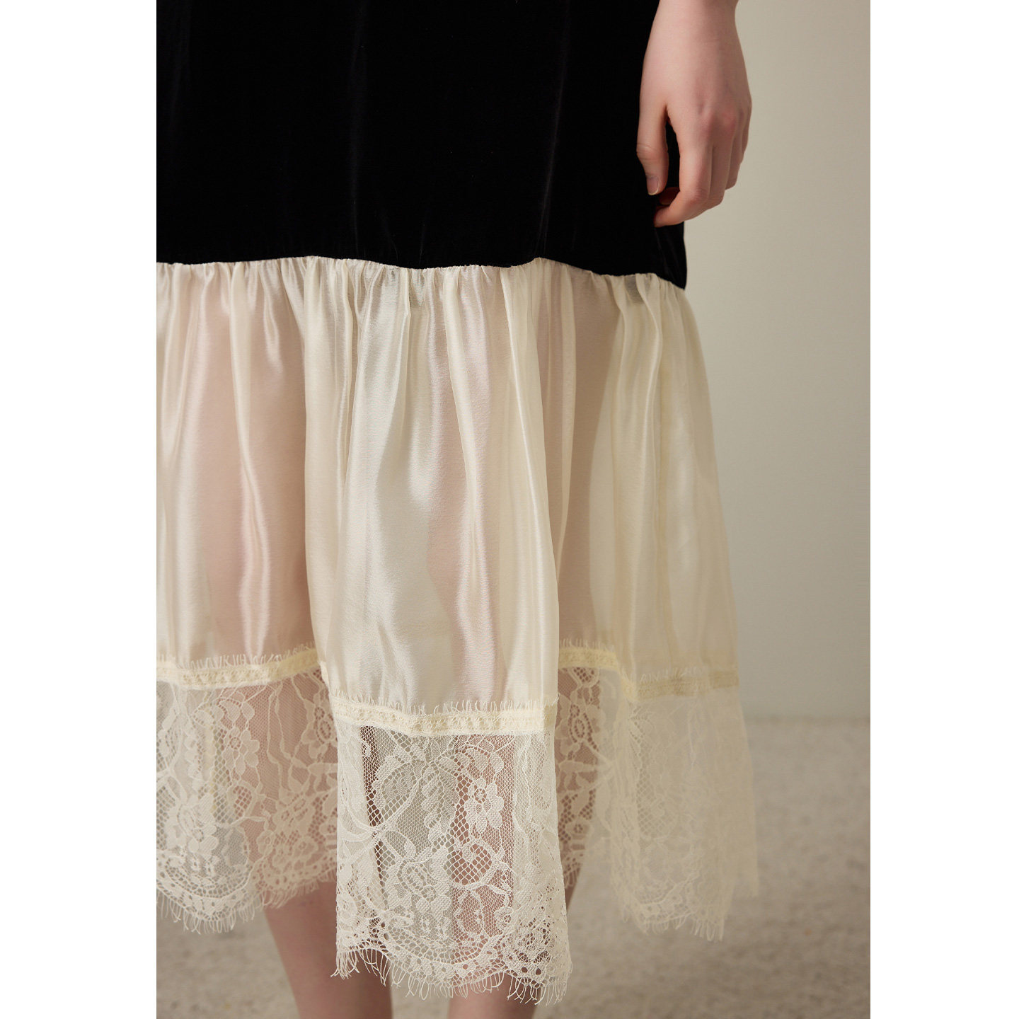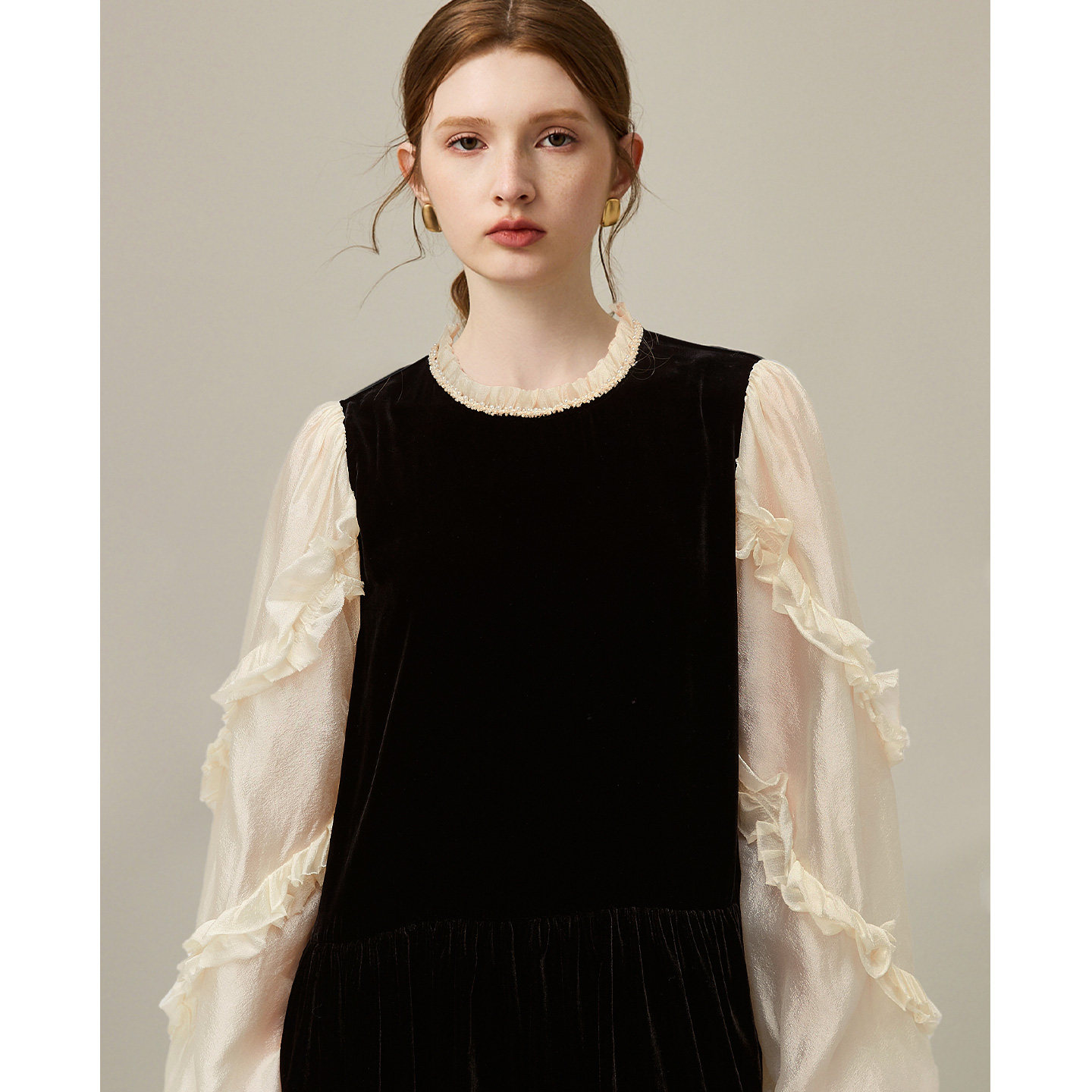 dfvc黑色人丝丝绒长袖连衣裙女2026年春季新款网纱拼接法式风长裙