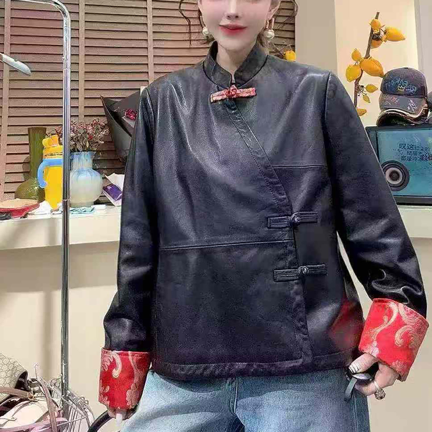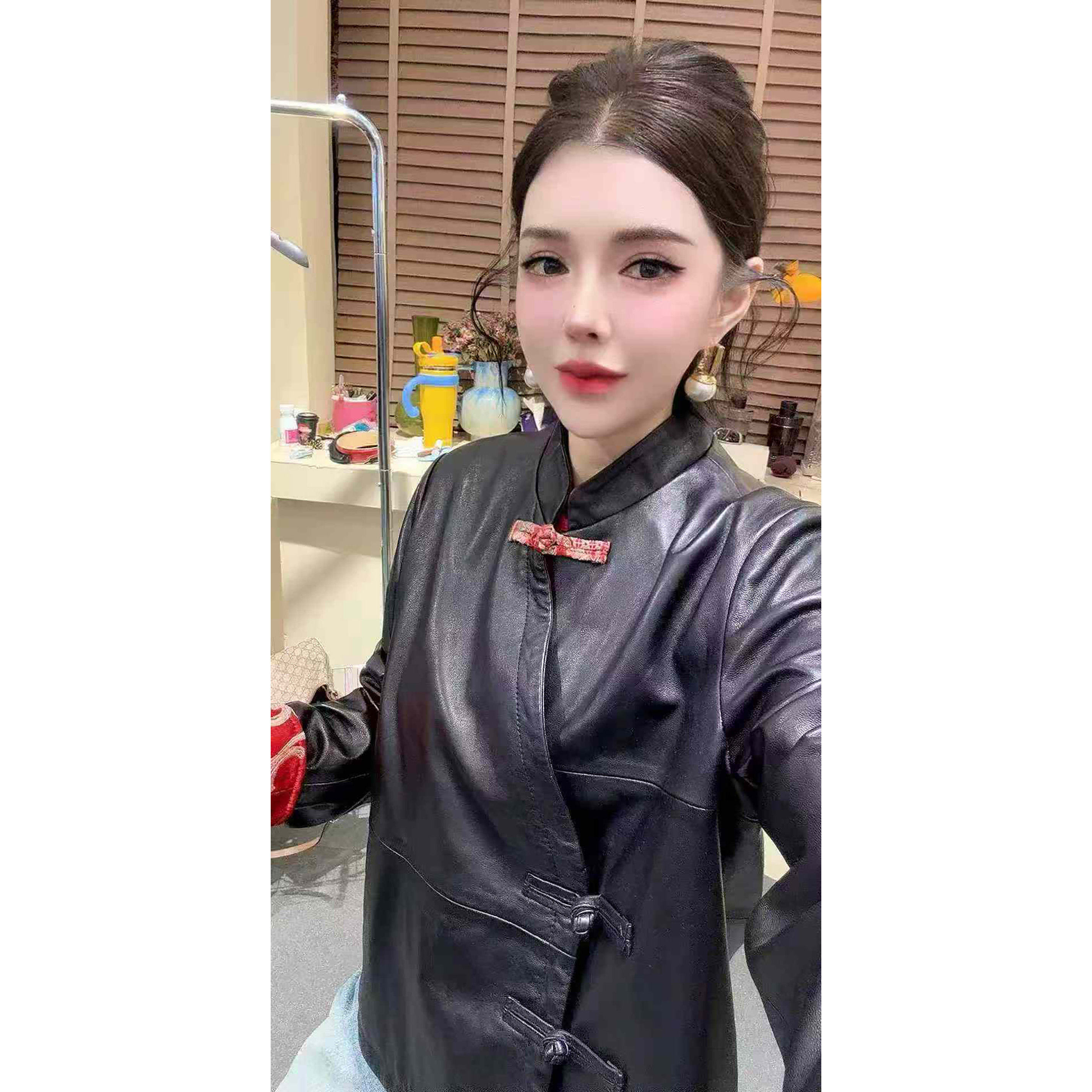 新中式立领羊皮皮衣女款短款修身盘扣黑色真皮长袖高级感潮流外套