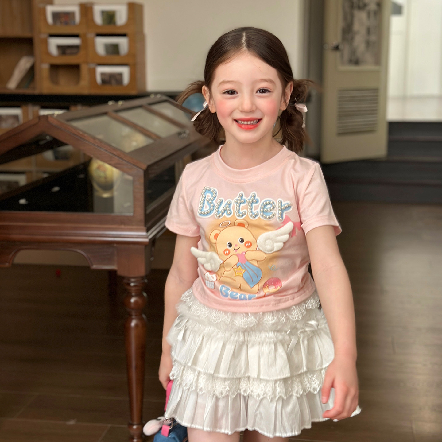 栀了成长记童装女童可爱卡通短款上衣2026春季儿童蕾丝边短袖T恤