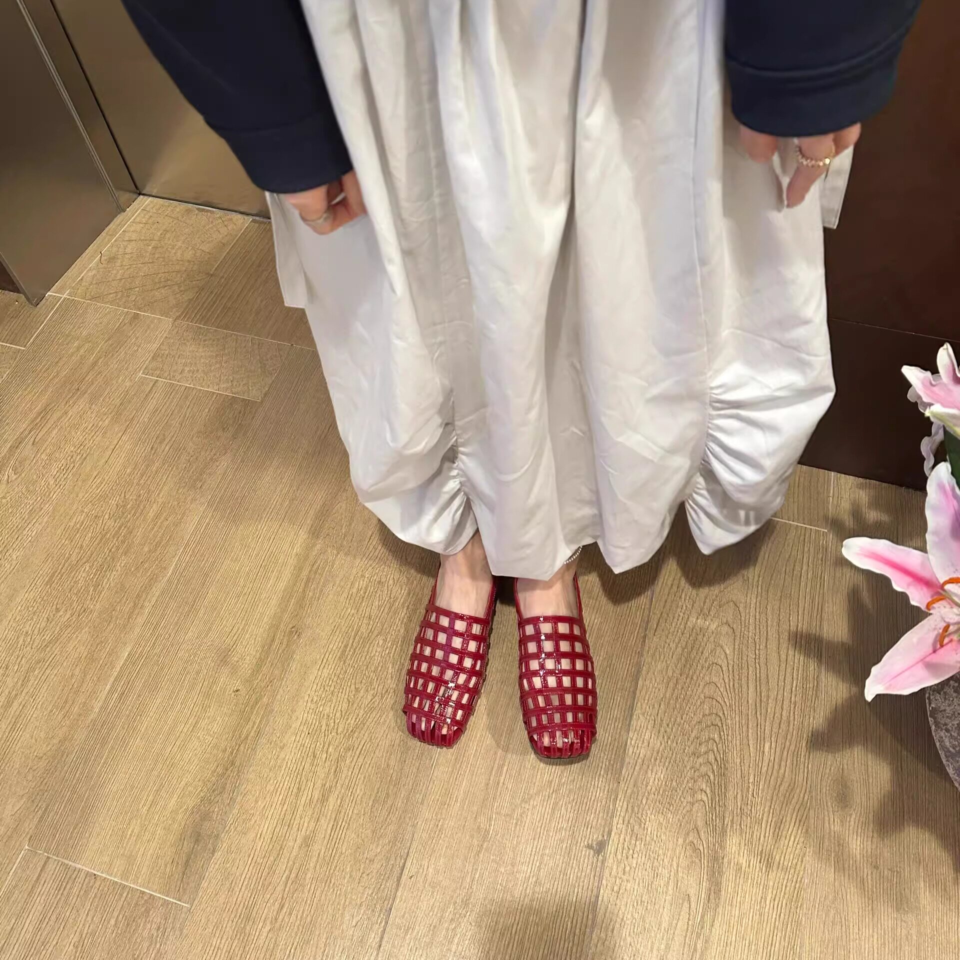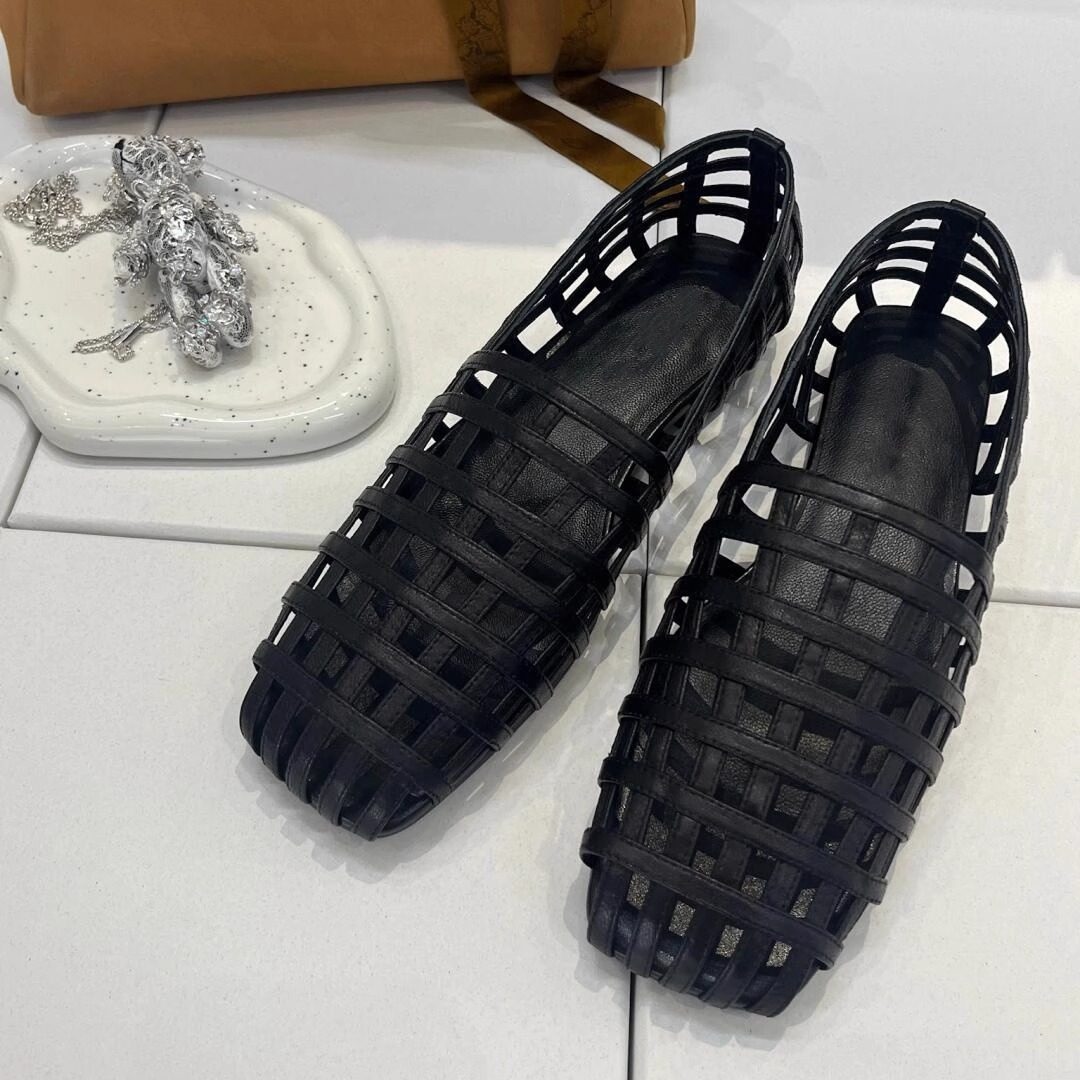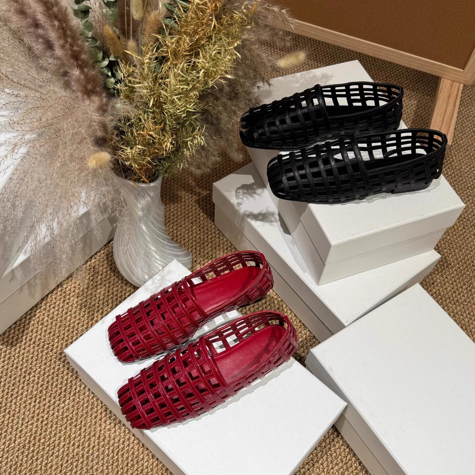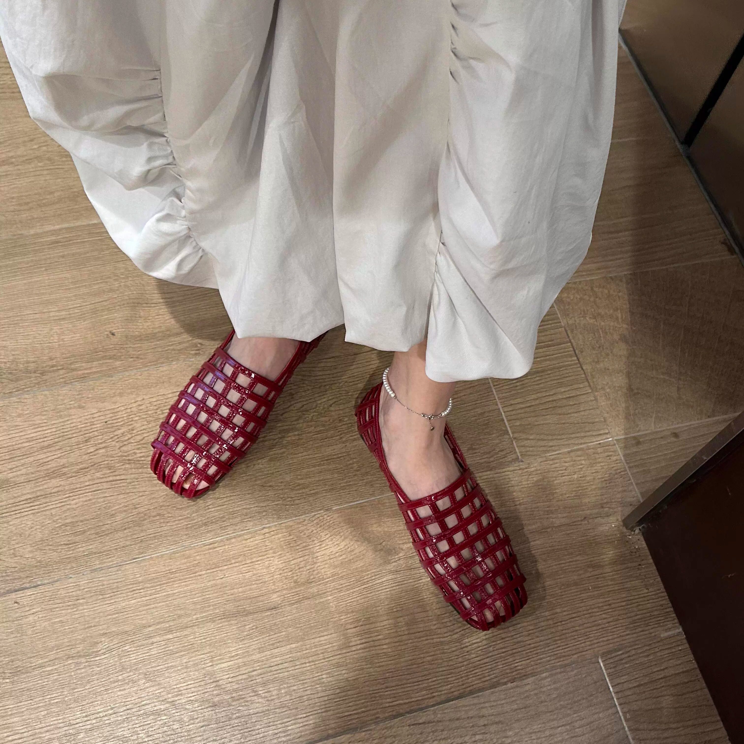2026夏季新款真皮编织鞋女镂空透气凉鞋韩版复古方头单鞋红色皮鞋