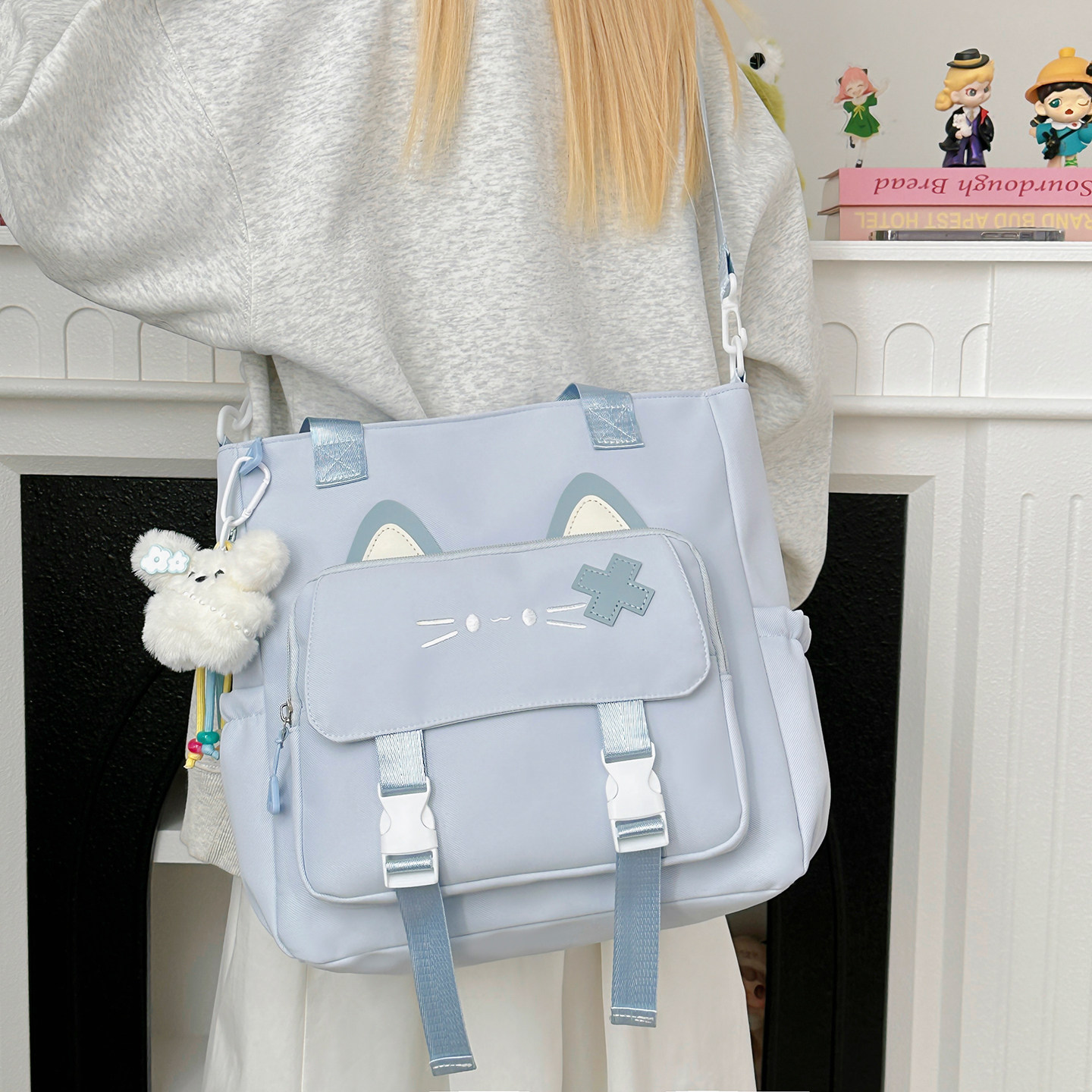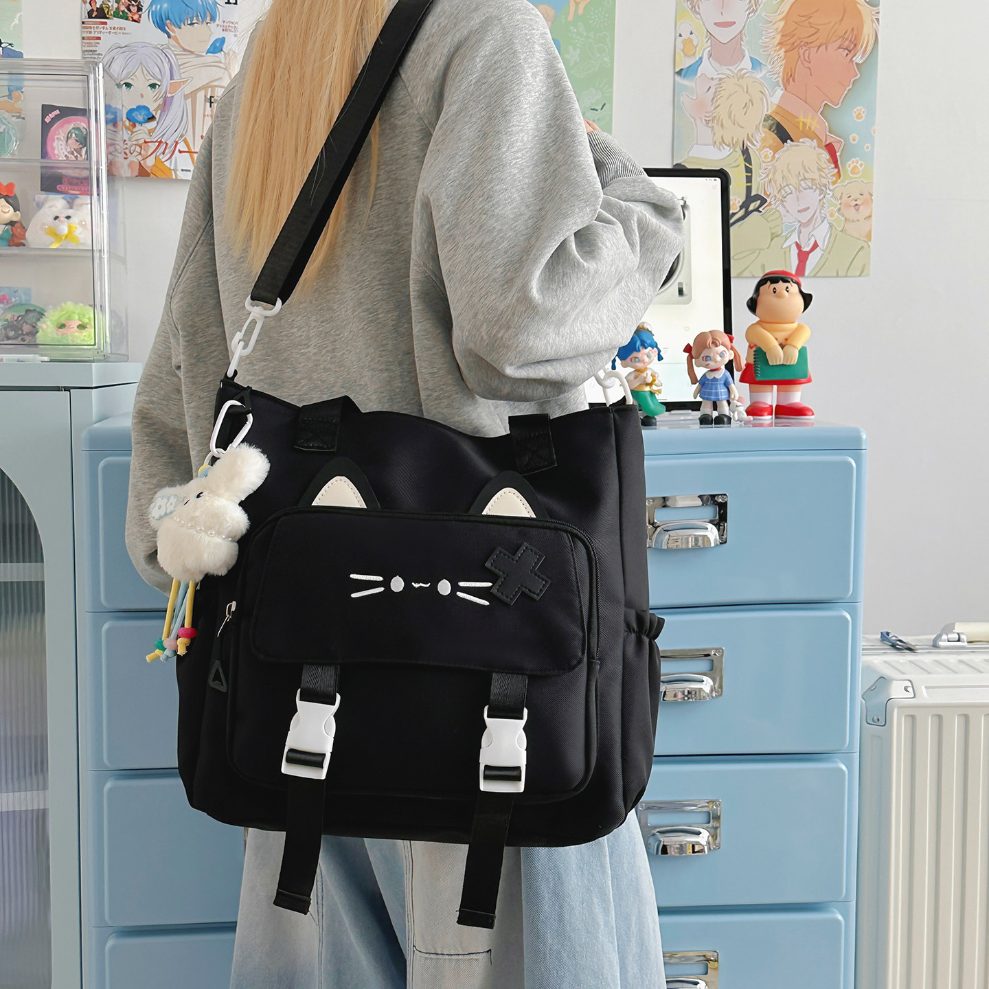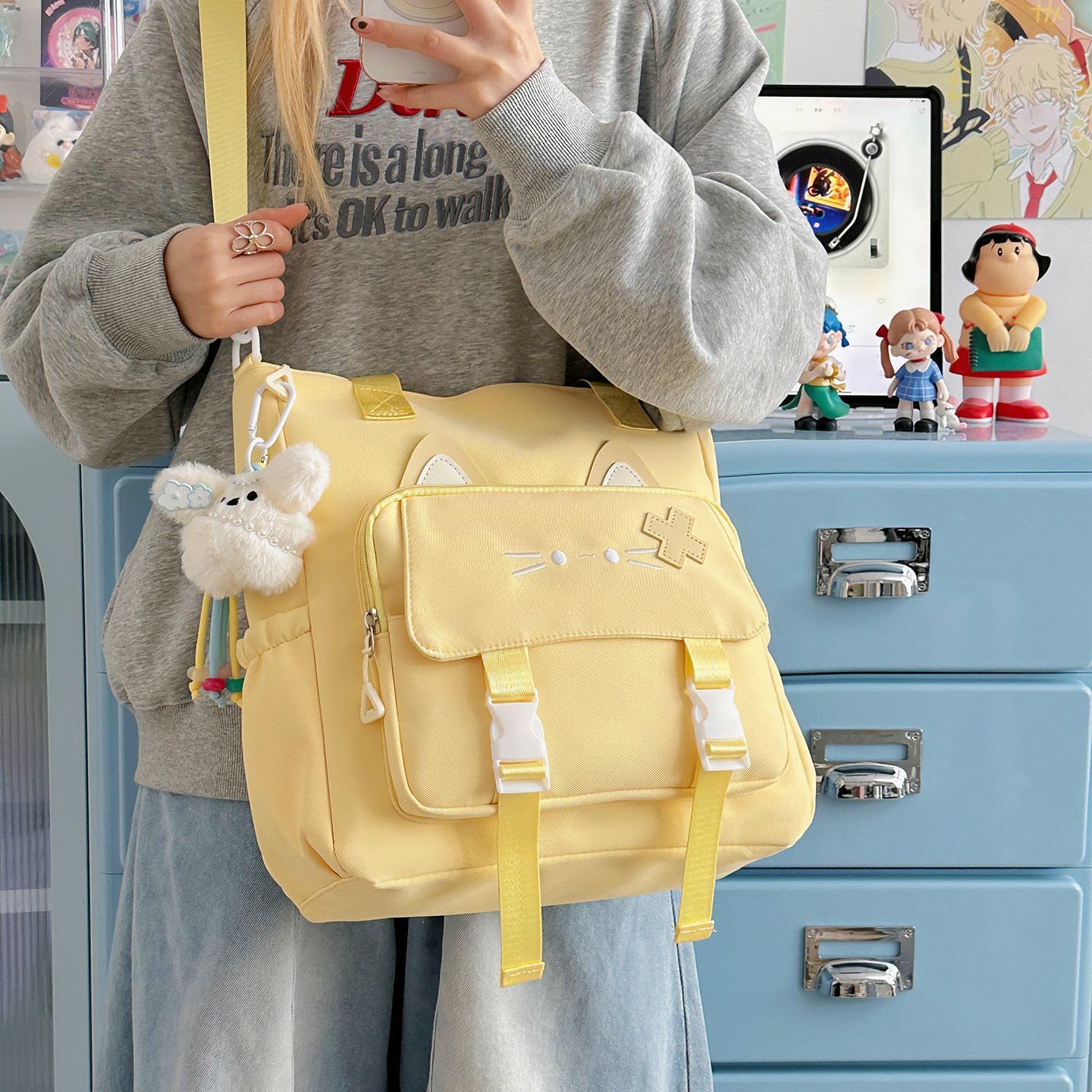 2025新款可爱猫咪帆布包初高中女学生大容量斜挎手提包轻便补课包