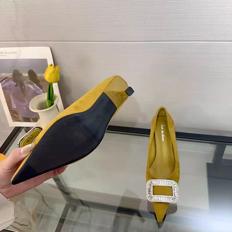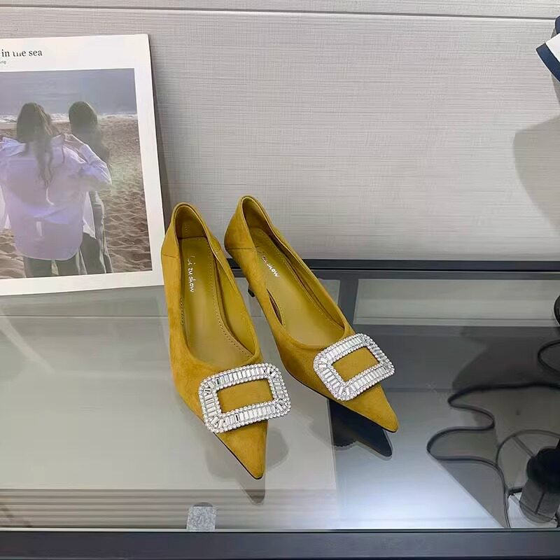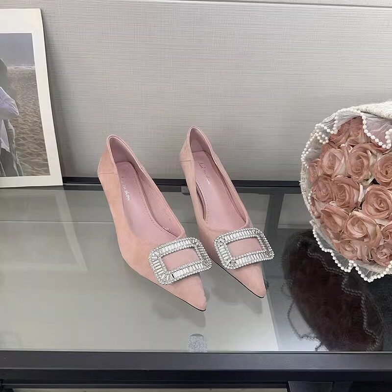 高跟鞋女2025春款新款法式绝美羊绒水钻扣黑色尖头细跟不累脚单鞋