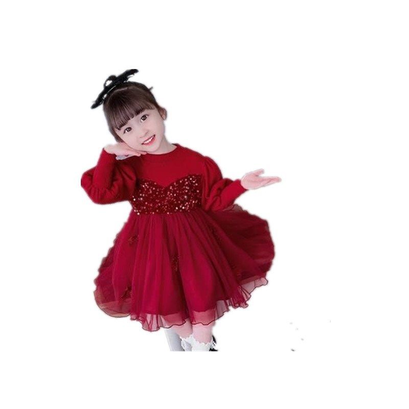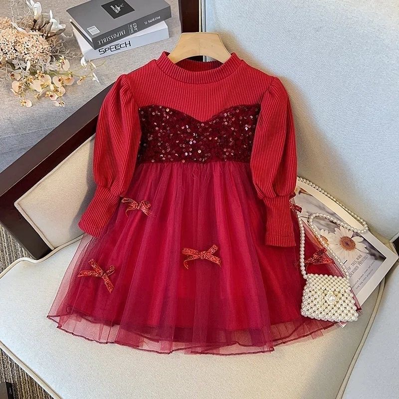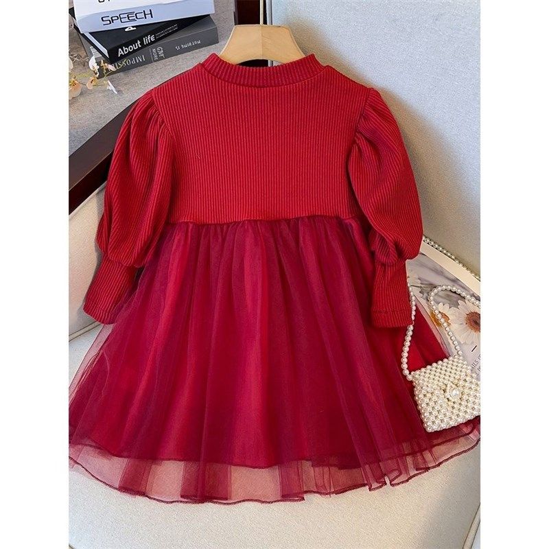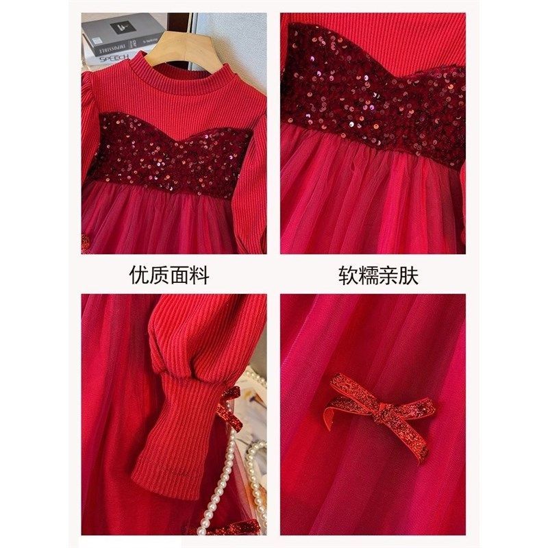 女童连衣裙春秋装新款儿童红色长袖礼裙薄款洋气女宝宝公主网纱裙