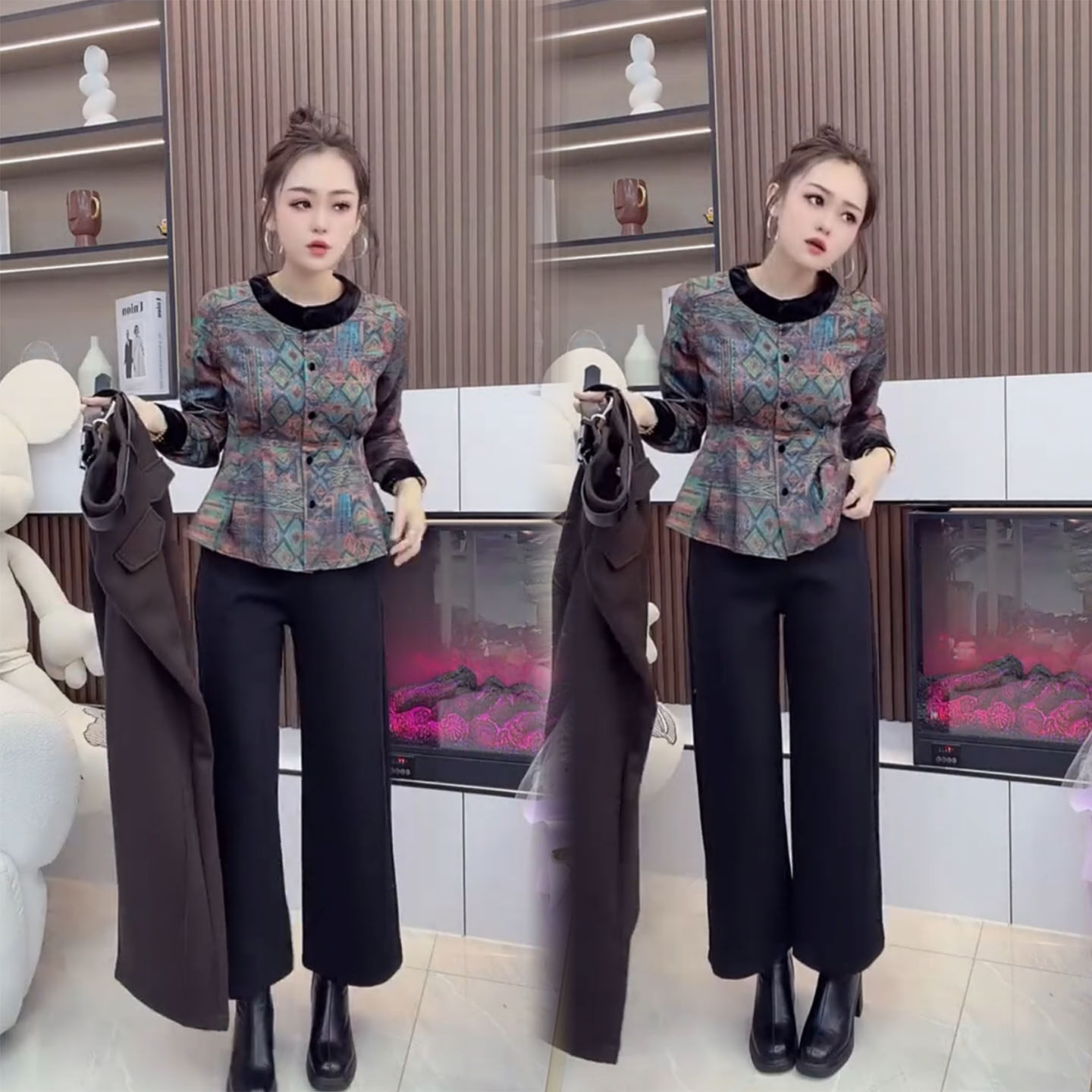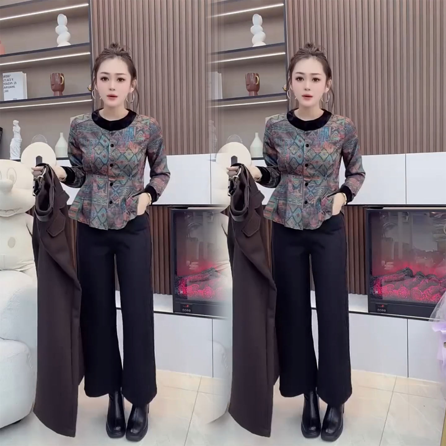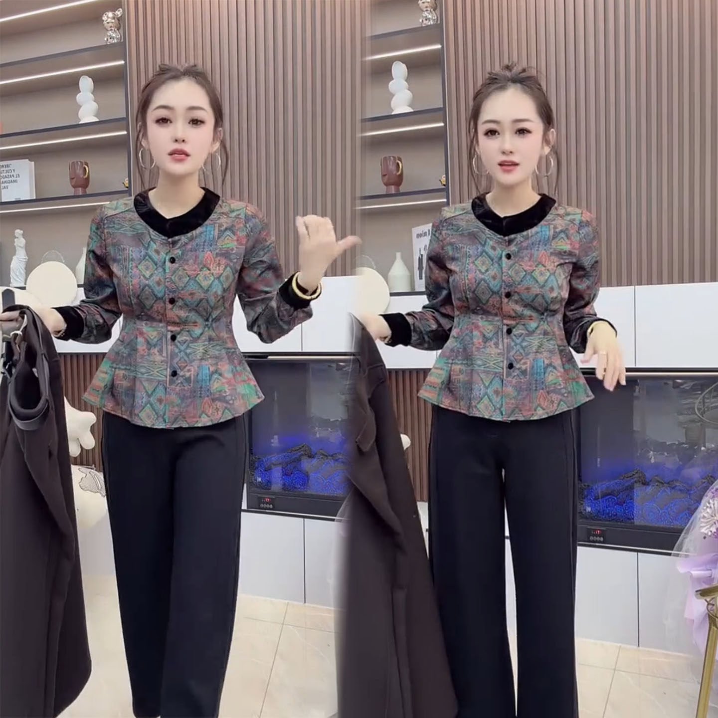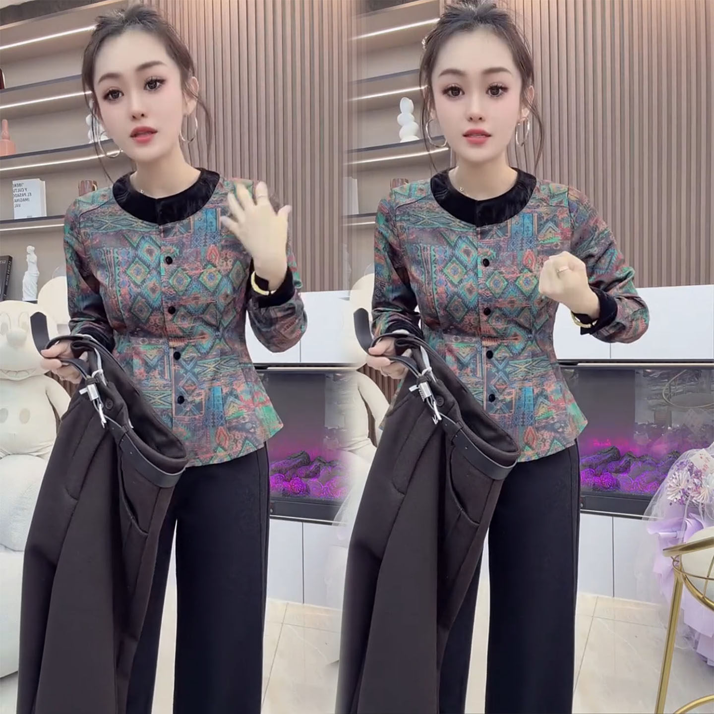 2026春季新款印花拼接两件套女修身显瘦设计感上衣气质裤子套装潮