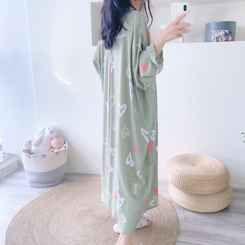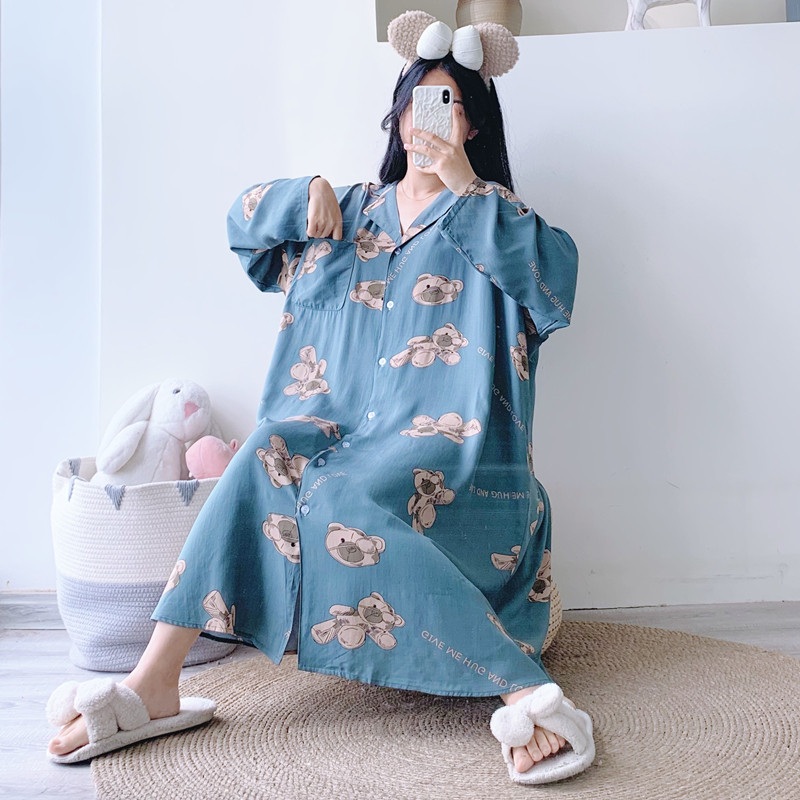 长袖加大码卡通棉绸加裙连衣裙睡衣夏季宽松孕妇开衫胖MM家居服女
