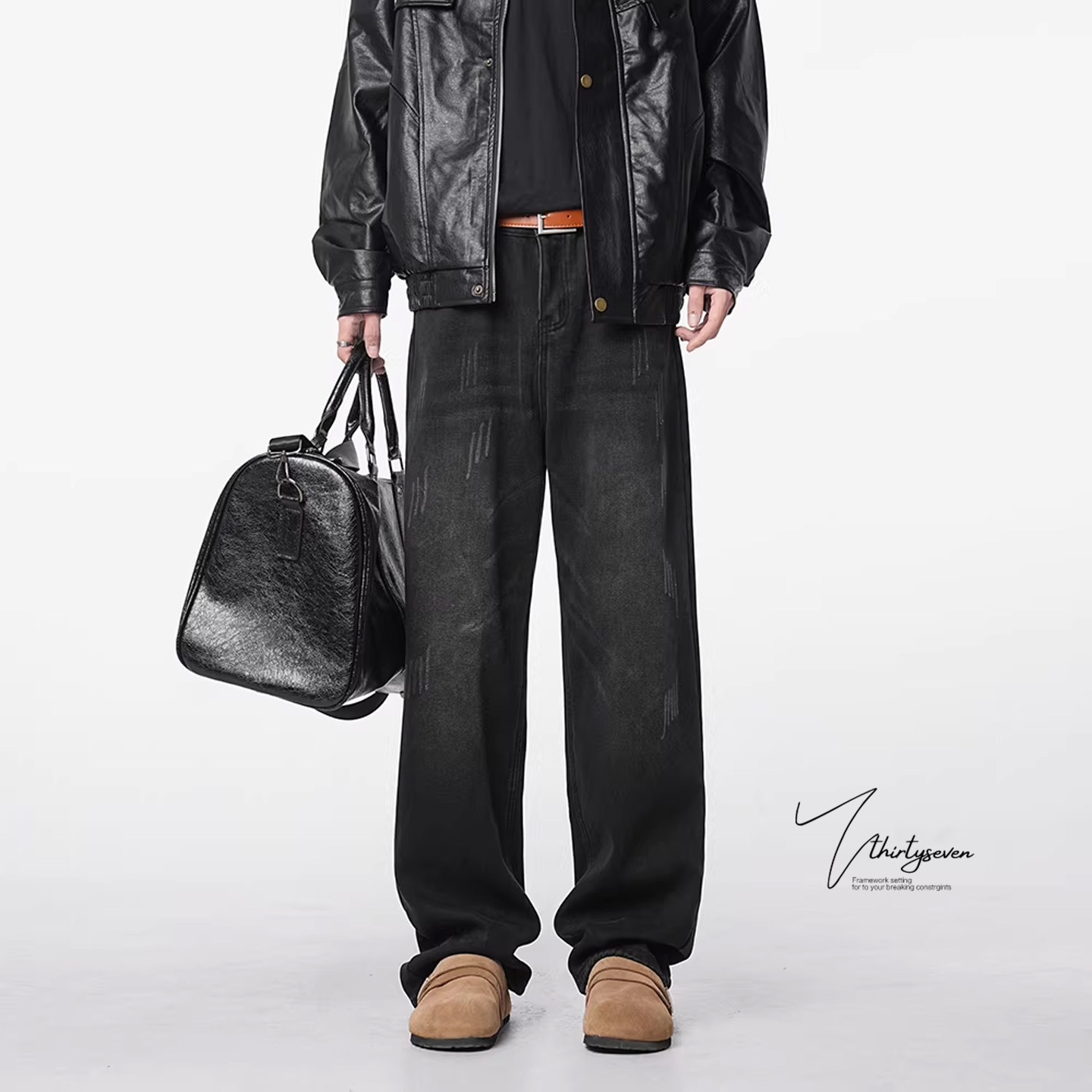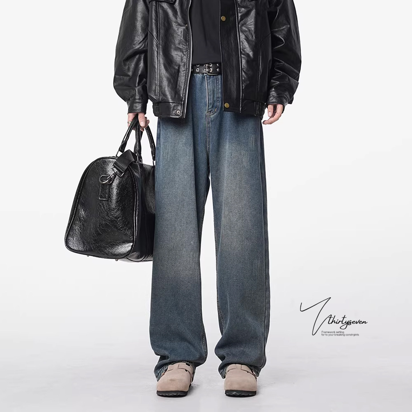 V37美式复古水洗做旧牛仔裤男款春季潮牌街头直筒宽松阔腿长裤子