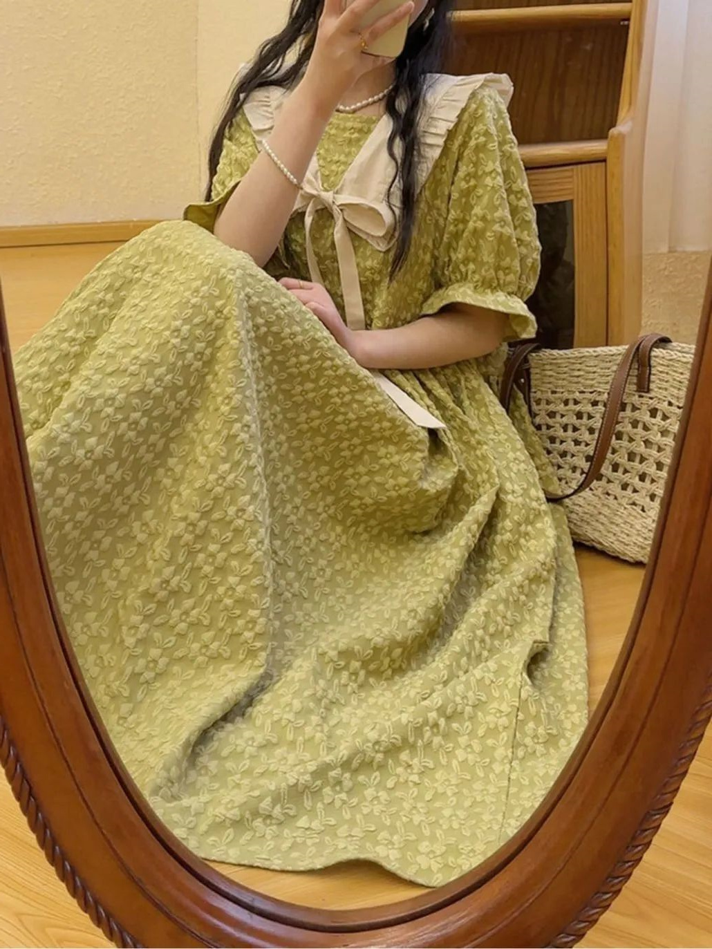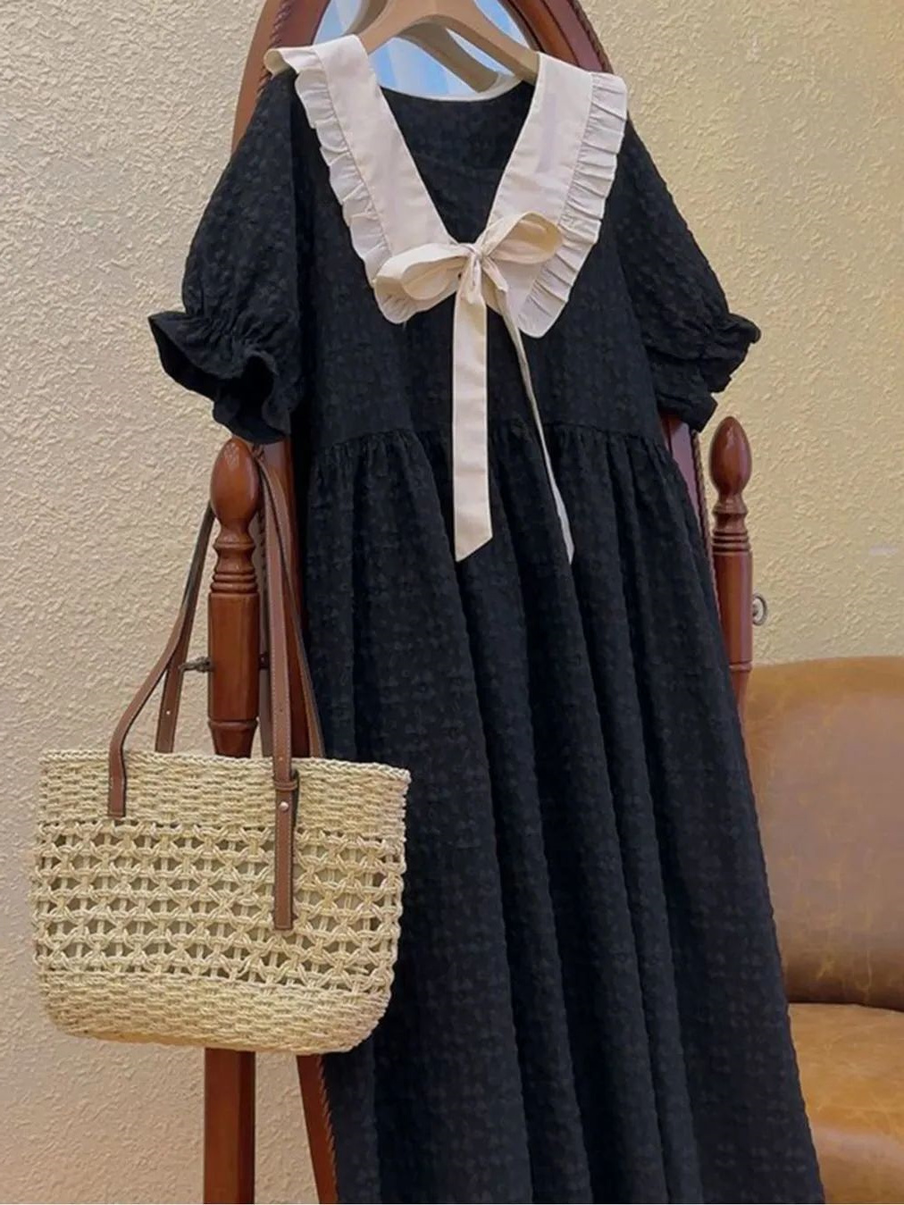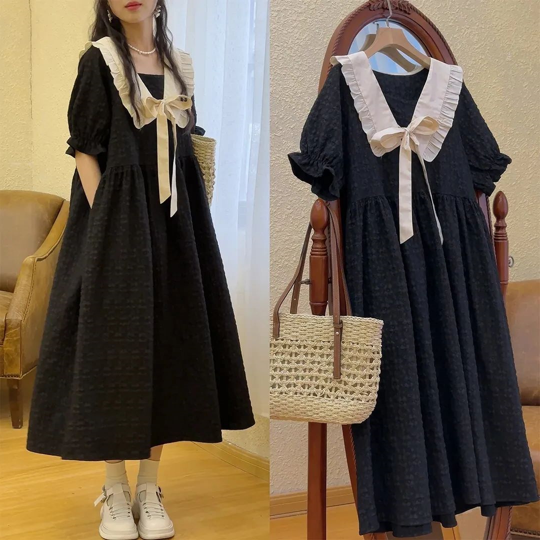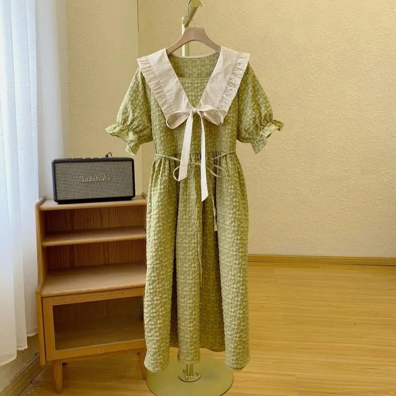 韩版女法式提花休闲风连衣裙胖妹妹300斤超大码泡泡袖夏季连衣裙
