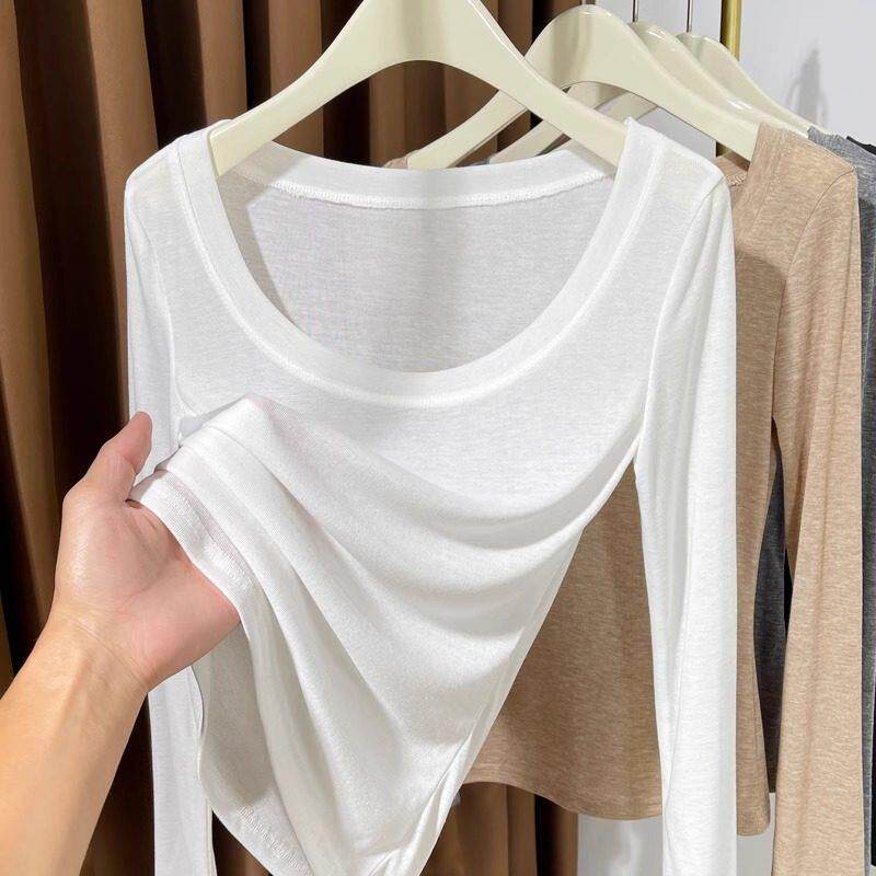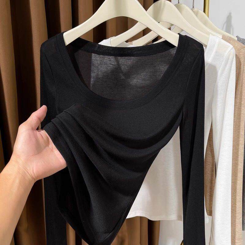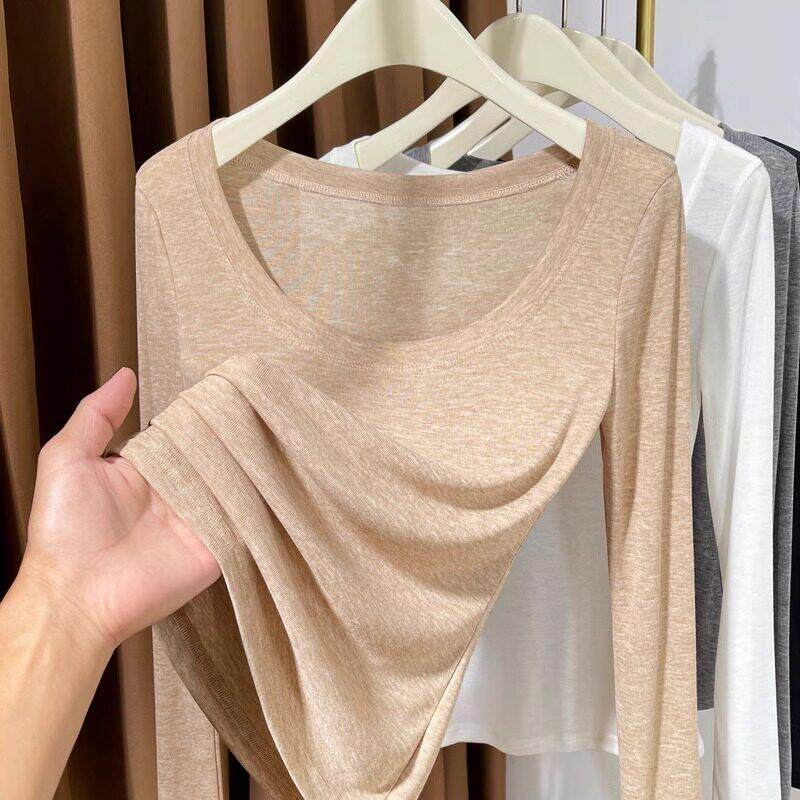 女款白色薄款针织打底衫长袖内搭2026新款修身显瘦大圆领体0323z1
