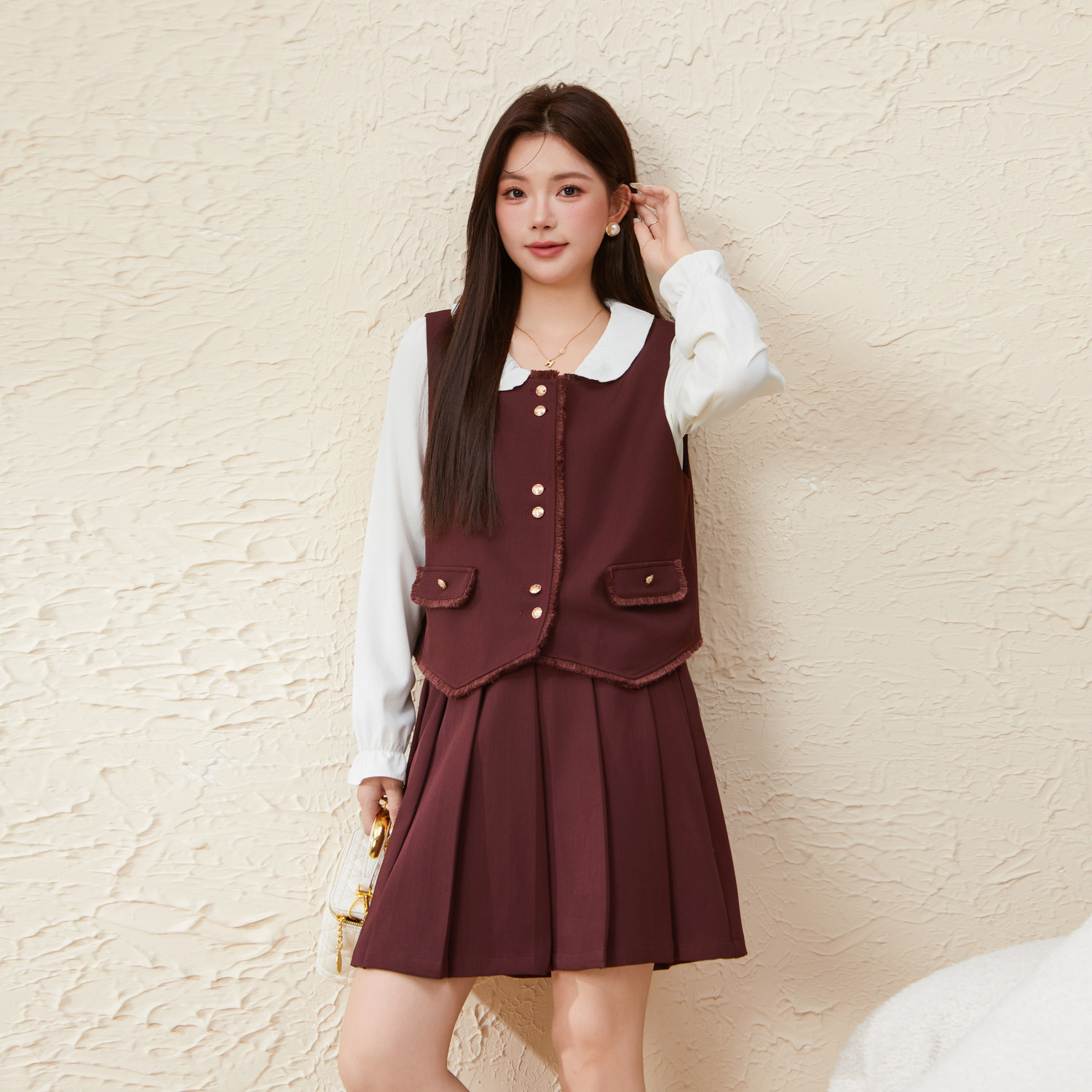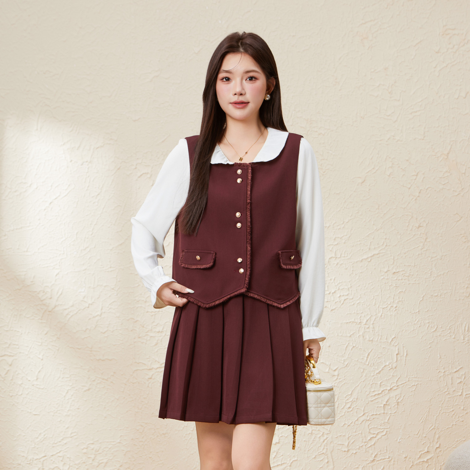 采多宝大码女装胖mm2026春季新款显瘦气质无袖上衣马甲压褶裙套装