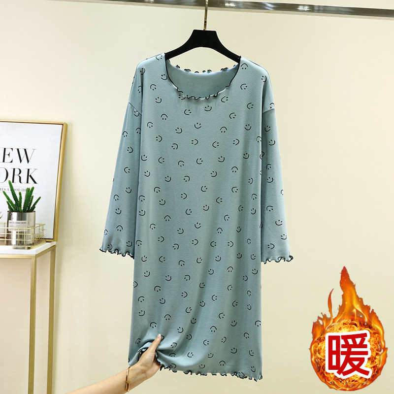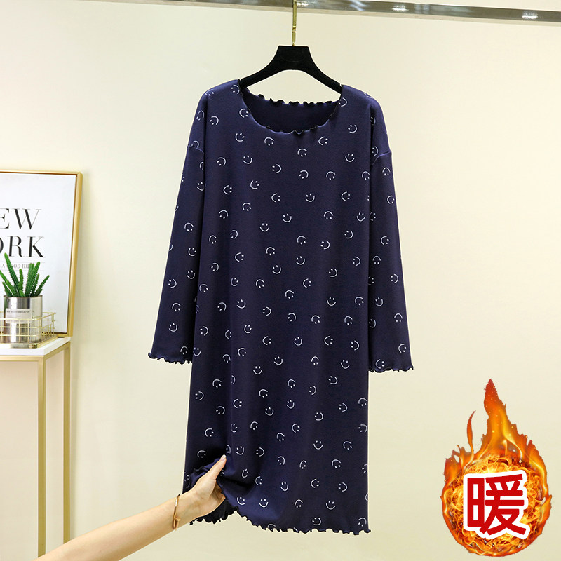 德绒加厚长款睡裙冬季居家笑脸连衣裙女士加绒保暖飞边长袖T恤裙