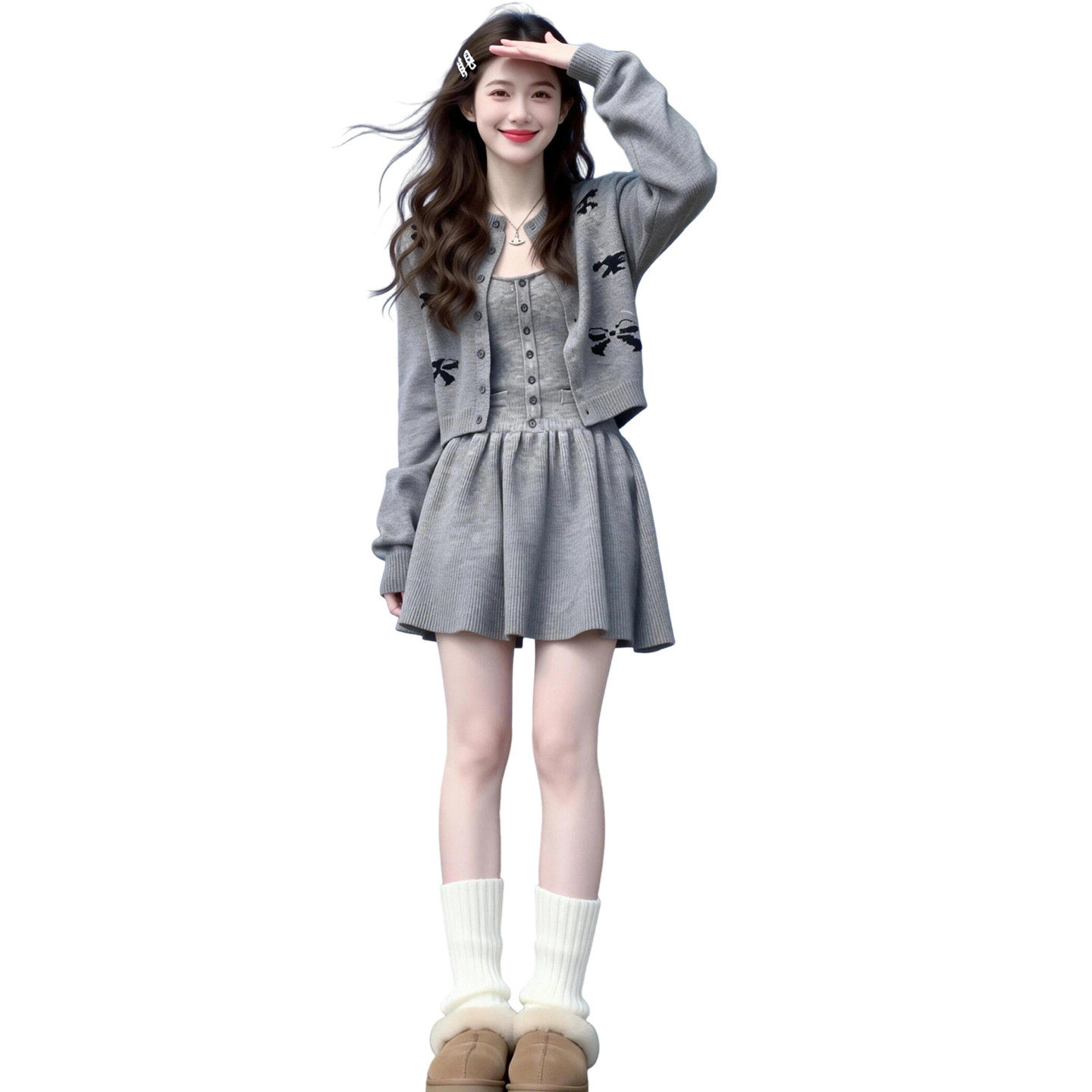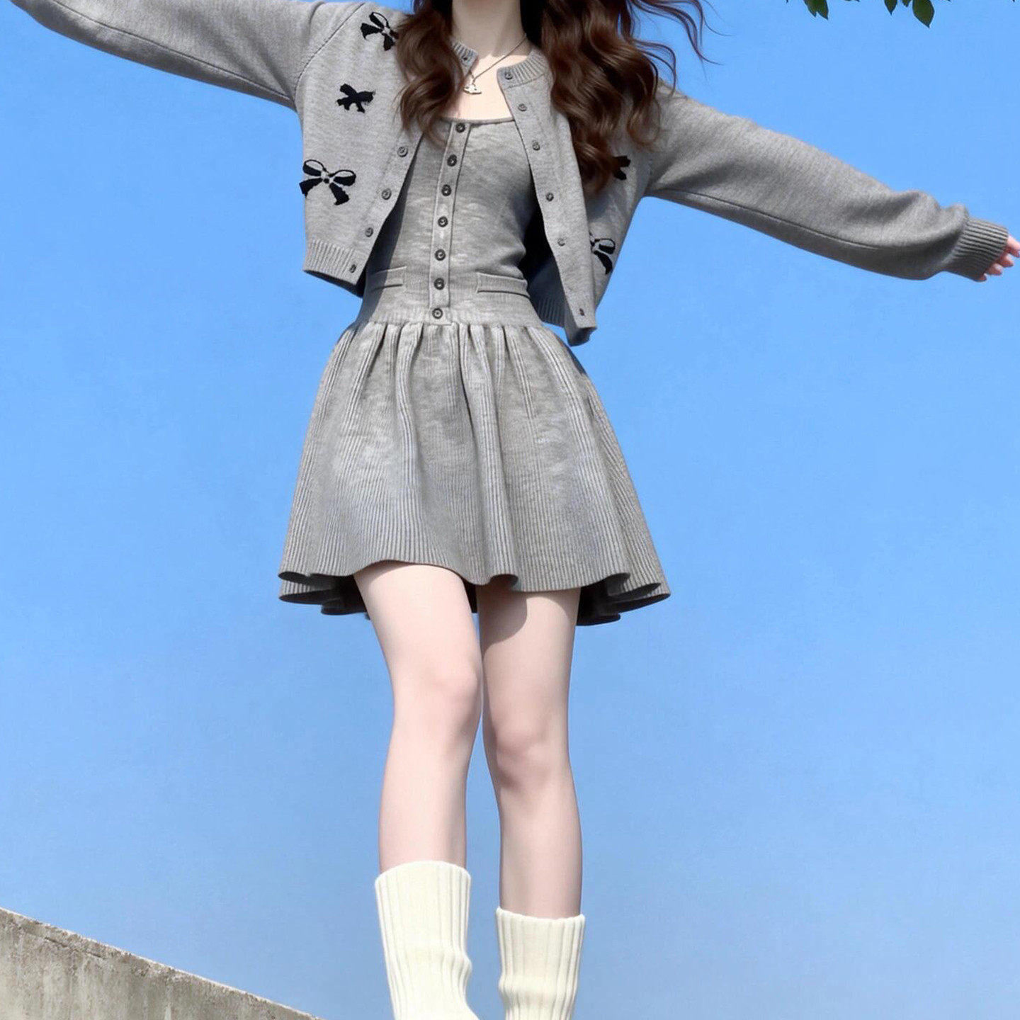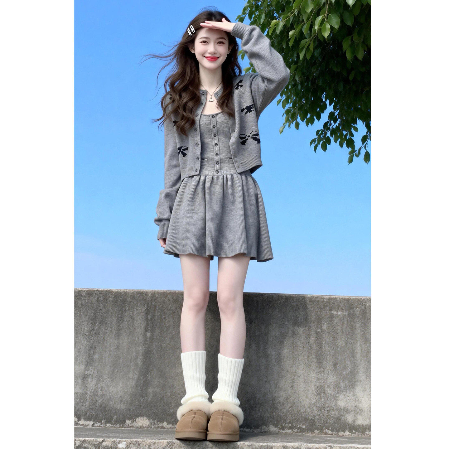 小个子香风灰色针织连衣裙女春季2026新款miu系气质显瘦套装短裙