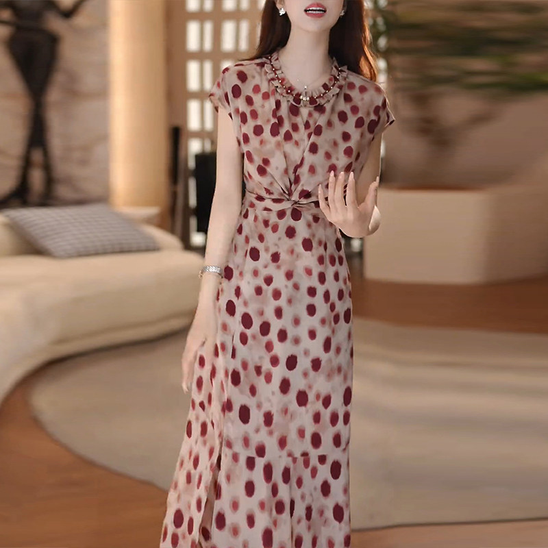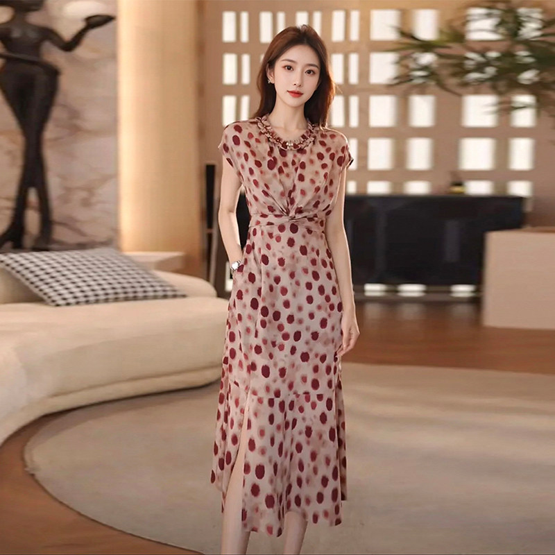 2025夏季轻奢高级感收腰显瘦气质长裙优雅显瘦高腰波点连衣裙女