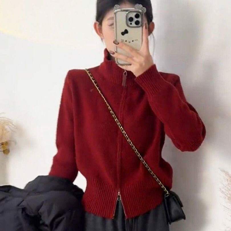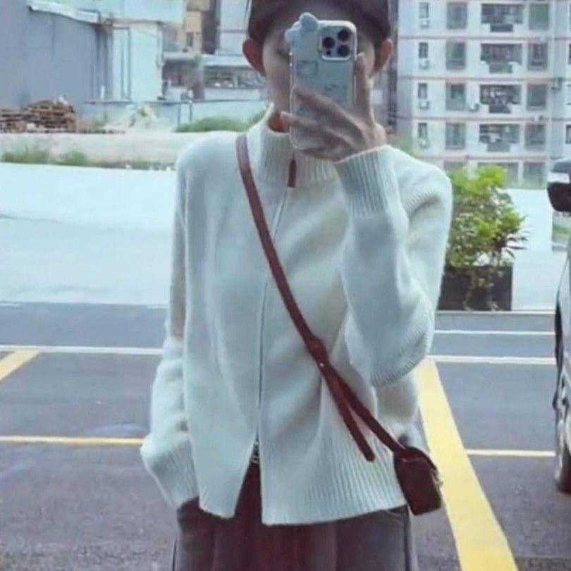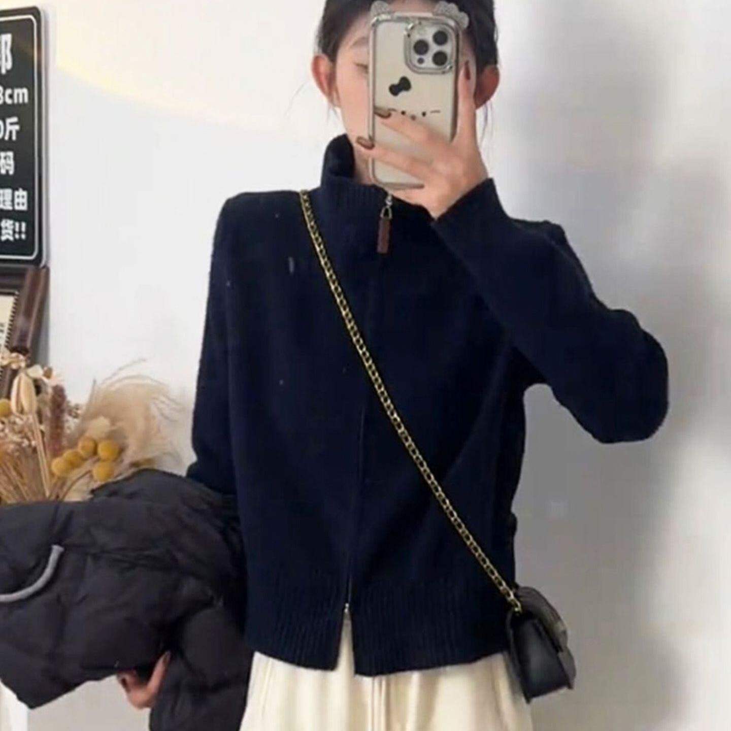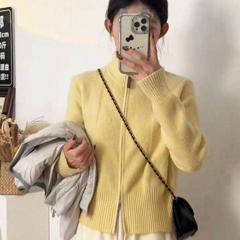 巨好看双拉链立领毛衣女款2026新款秋冬季针织开衫慵懒风坑条外套