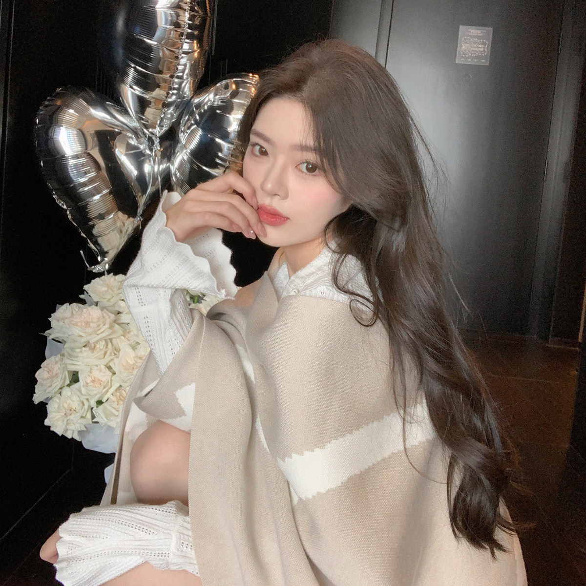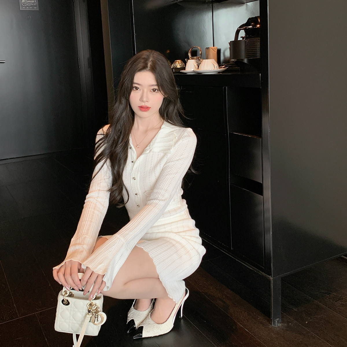 ByYou 秋冬新款翻领白色羊毛镂空针织连衣裙短款收腰显瘦百褶裙子