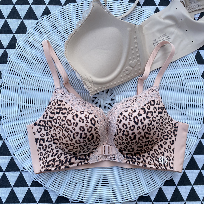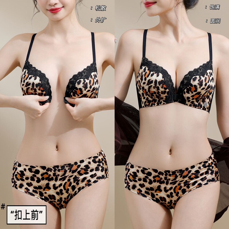 纯欲风性感粉色豹纹前开扣式内衣女小胸聚拢加厚5Cm美背文胸套装