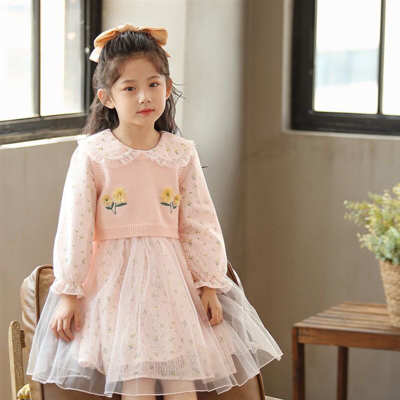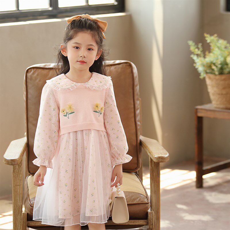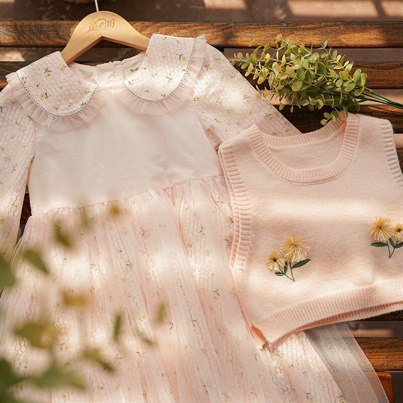 女童针织毛衣网纱裙两件套淑女风秋装毛线马甲刺绣碎花连衣裙套装