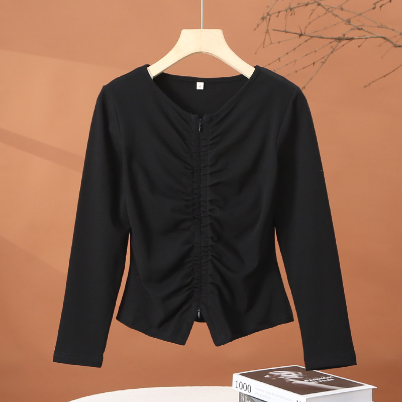 白色长袖t恤女春季2026新款春装小个子修身显瘦女士短款拉链上衣