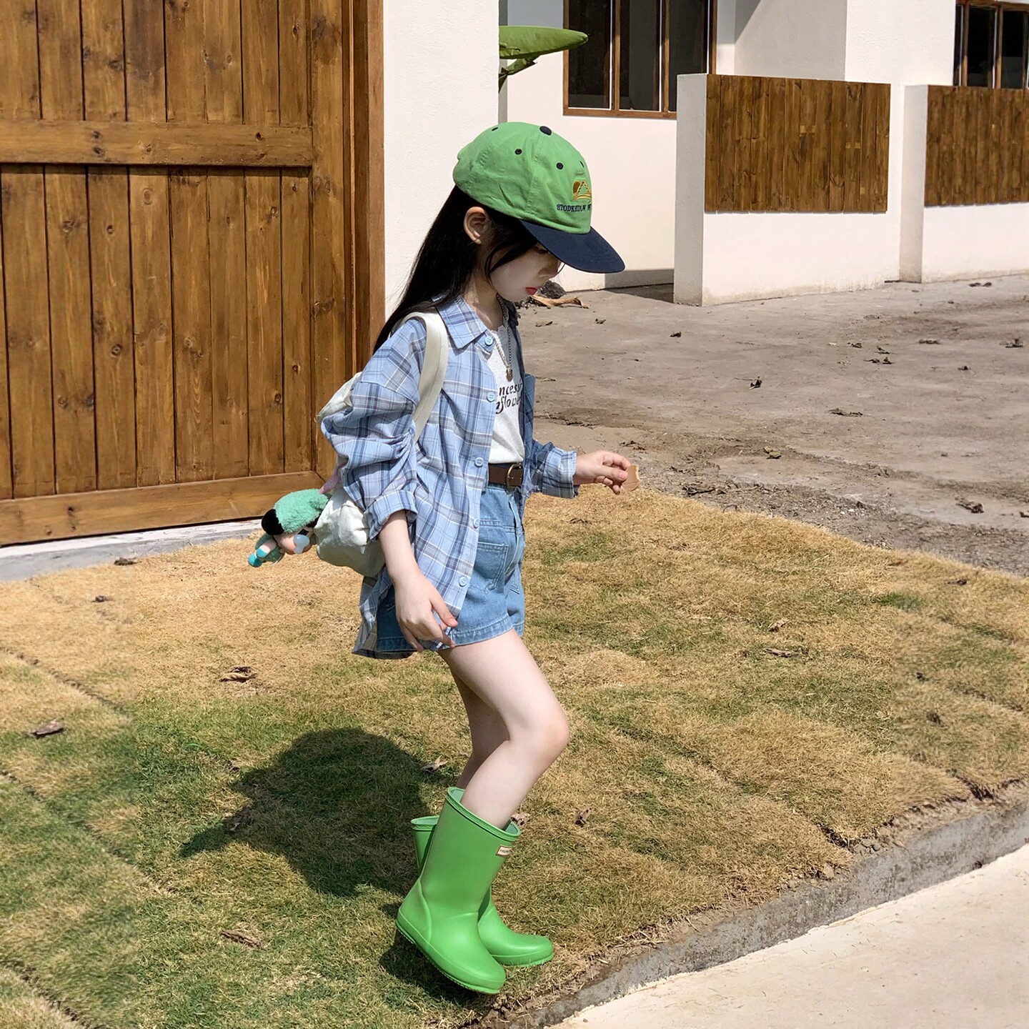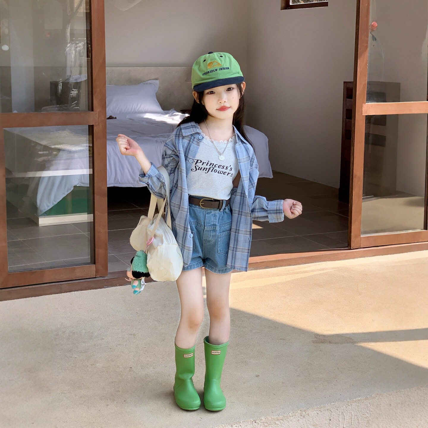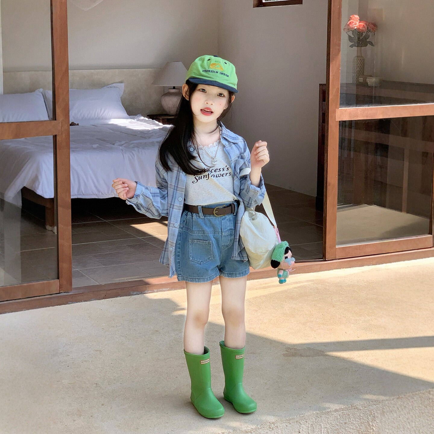 女童格子衬衫春秋季套装2026新款纯棉衬衣外套儿童春装牛仔短裤潮