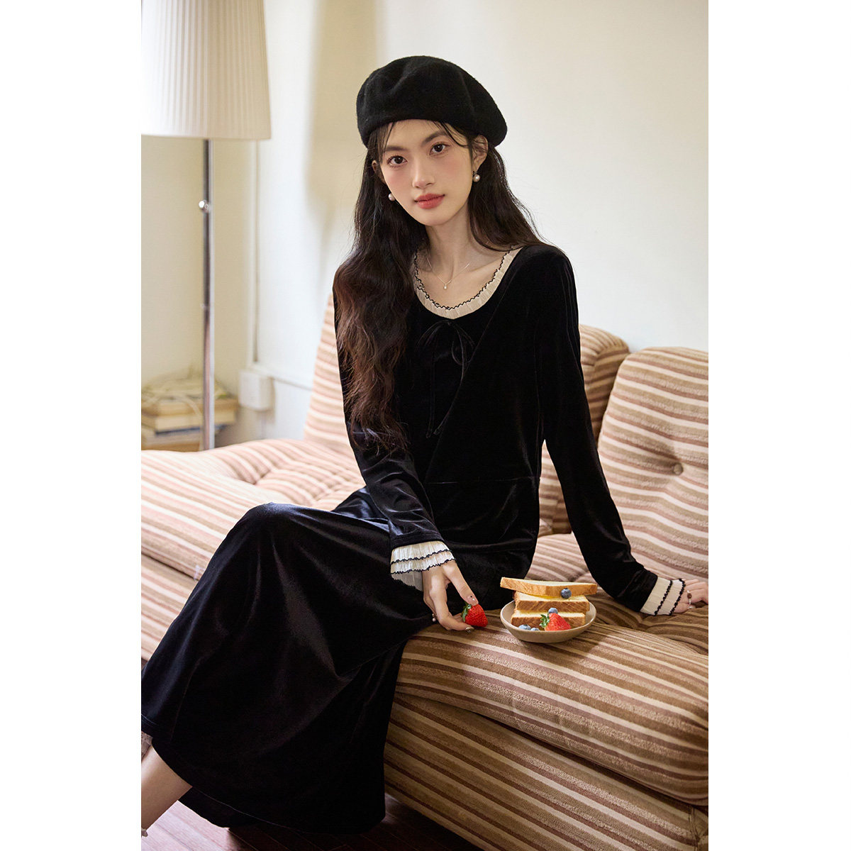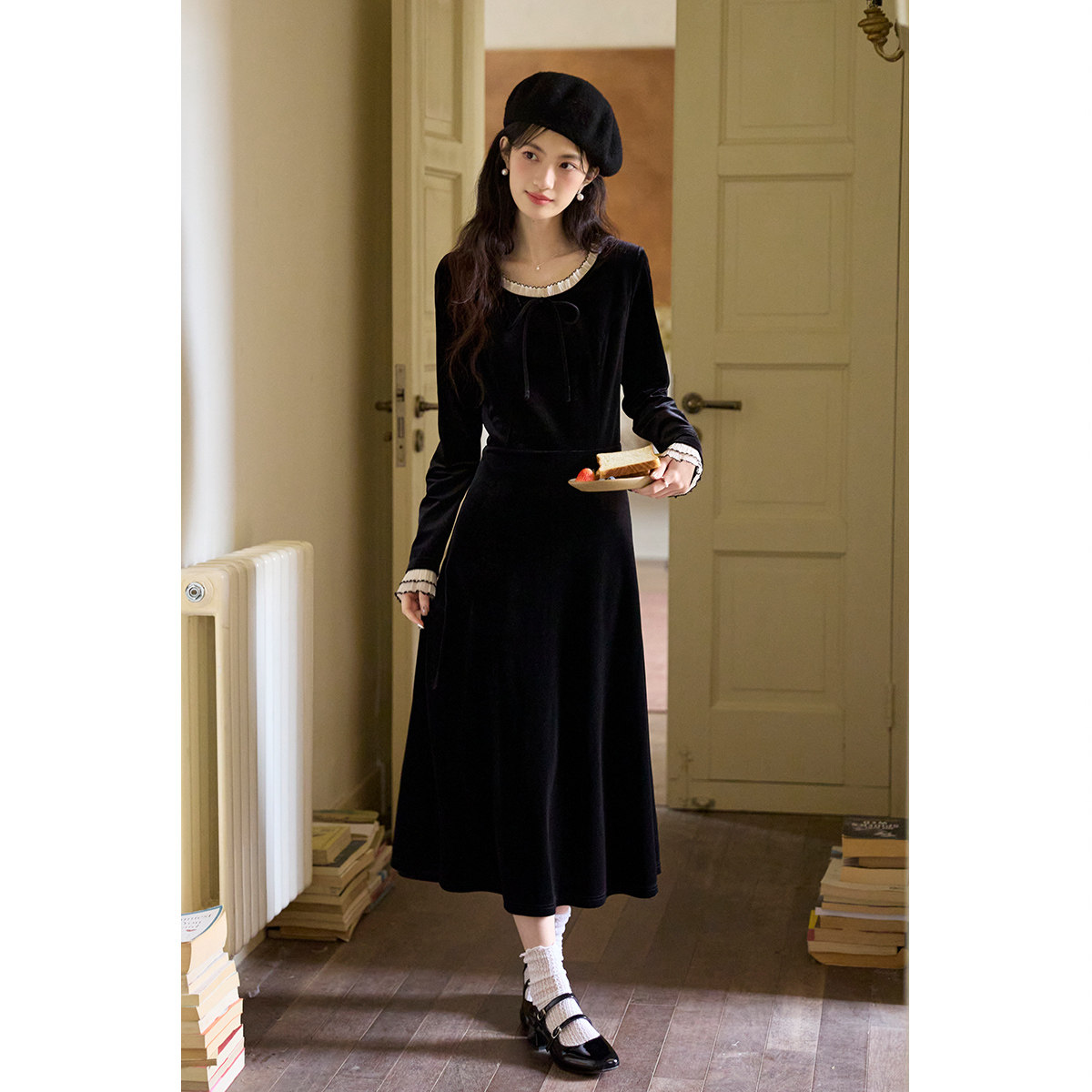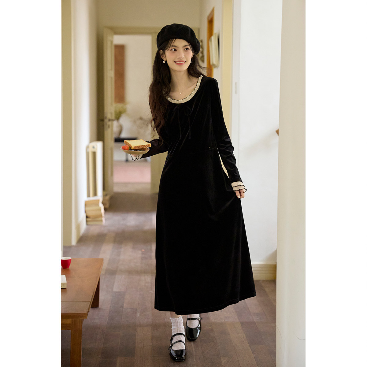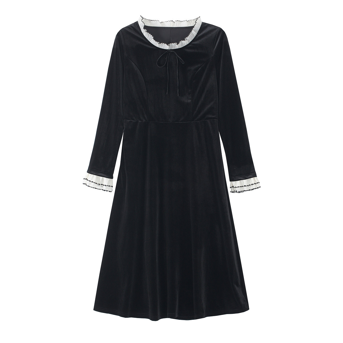 弥古赫本风法式黑色丝绒连衣裙长袖女修身秋冬撞色花边内搭打底裙